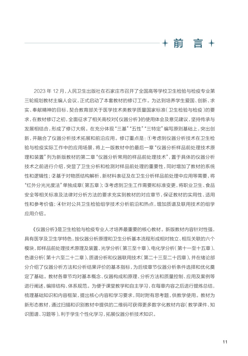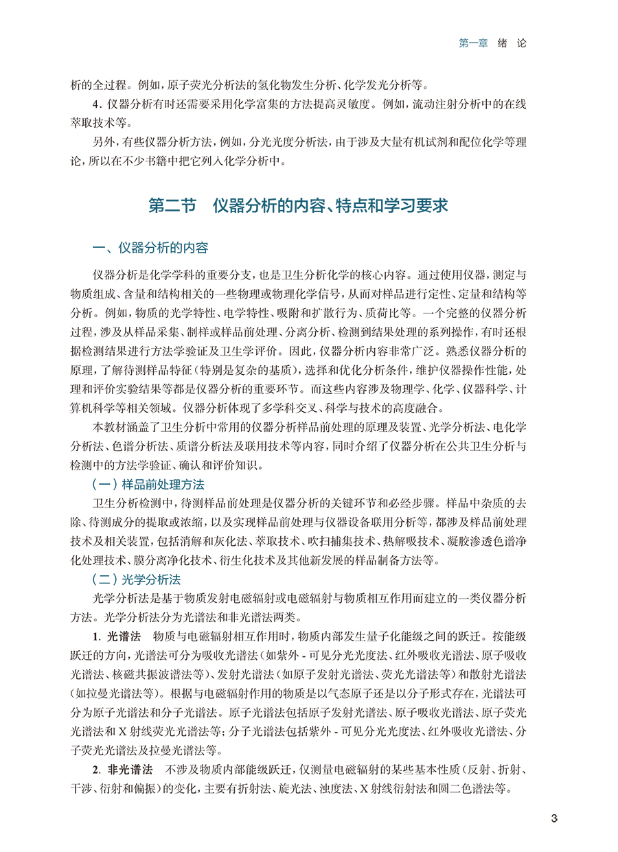 本书是供卫生检验与检疫专业学生使用的重要的核心教材。教材按仪器分析原理形成相对独立、相互关联的五个模块:即光学分析、电化学分析、色谱分析、质谱分析及联用技术,并结合现代仪器分析发展,单列一章内容介绍样品前处理技术原理及装置。考虑到卫生工作的需要和标准变更,将相关卫生安全标准及法律法规等对分析方法的要求充实到教材的对应章节,保证教材的实用性、适用性和参考价值。教材各章节均按概述、基本概念、仪器构成和原理、技术方法和质量控制、应用及案例等进行阐述,教材编排结构体系规范。为便于课堂教学和自主学习,本教材在每章内容之后进行提炼总结,梳理基础知识和内容框架,提出重点和难点内容,给出学习要求,同时附有思考题,供教学参考选用。教材为新形态教材,更多的数字内容,利于学生自主性、系统性、连贯性掌握仪器分析技术。