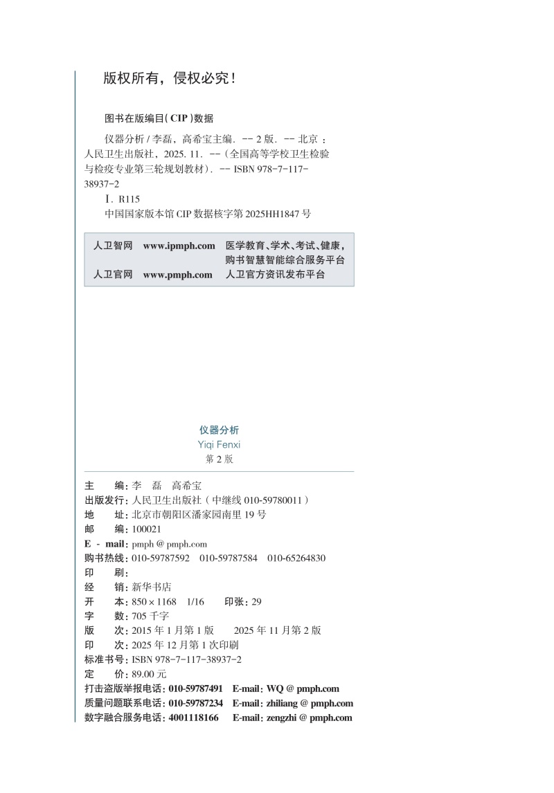 仪器分析 第2二版 十五五规划教材 全国高等学校教材 李磊 高希宝 主编 供卫生检验与检疫专业用 9787117389372人民卫生出版社