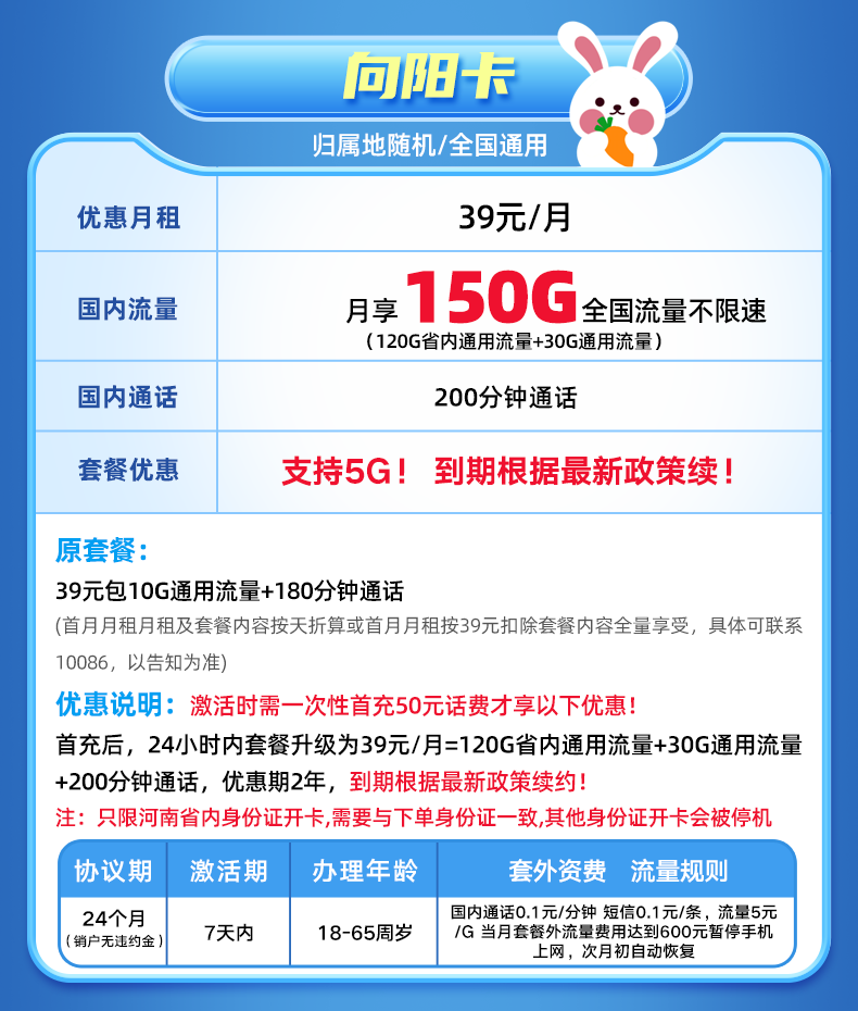 【长期套餐·不限APP】纯通用流量!支持5G高速!仅发河南!向阳卡