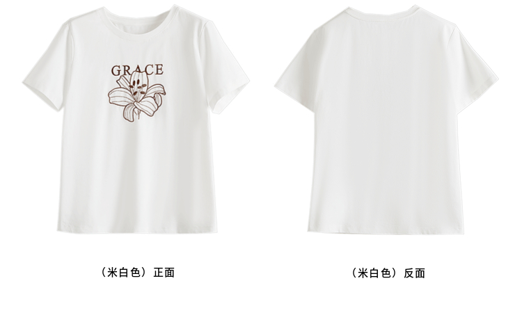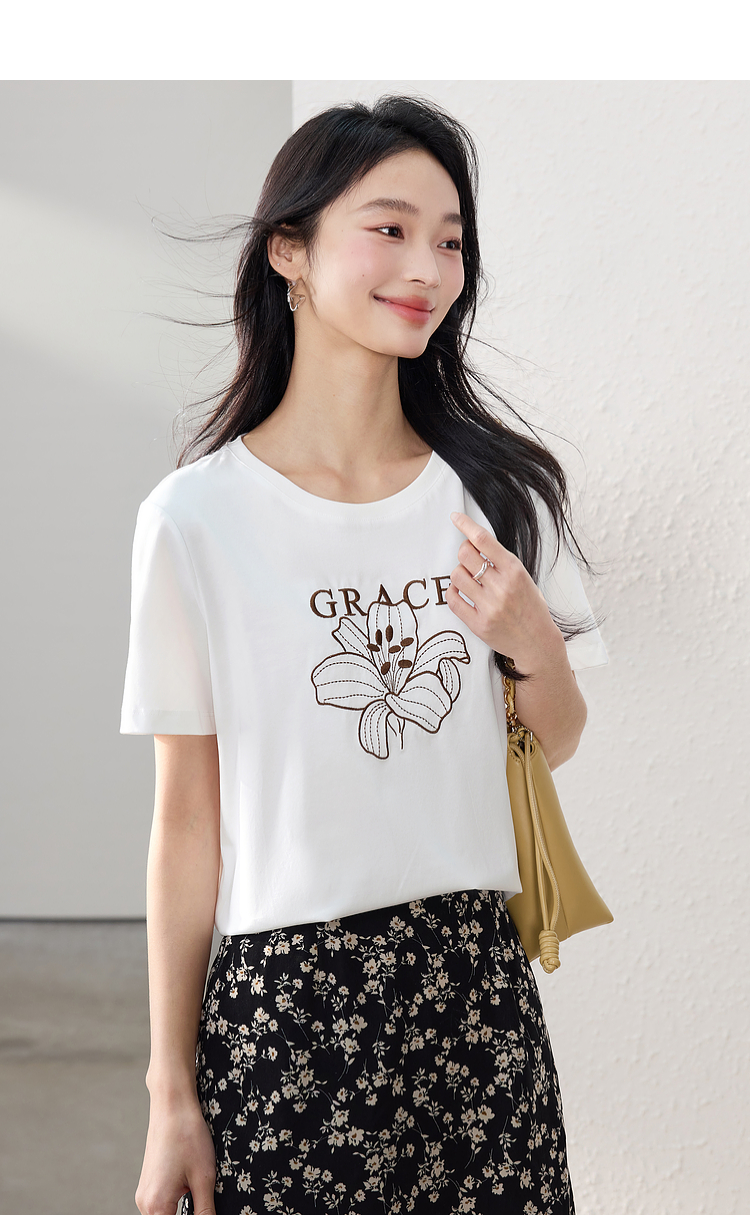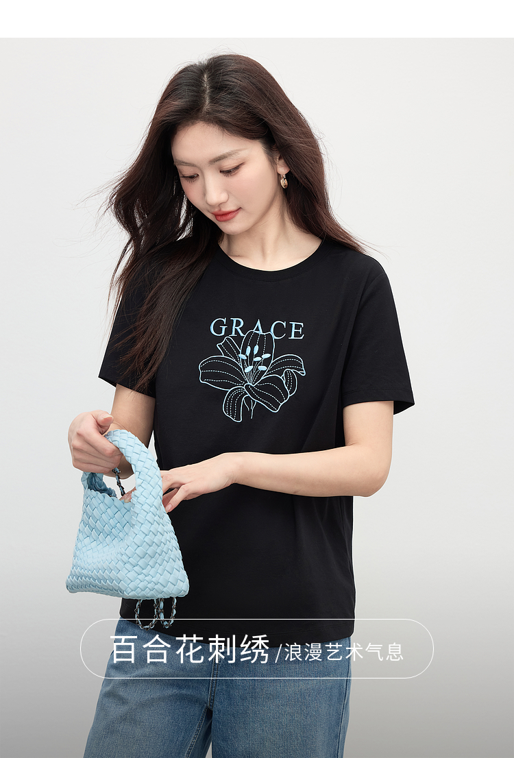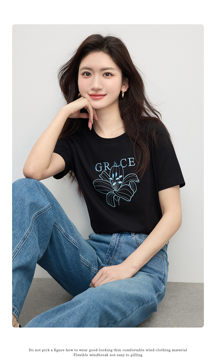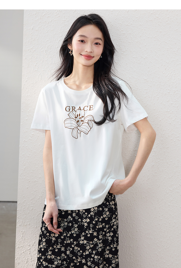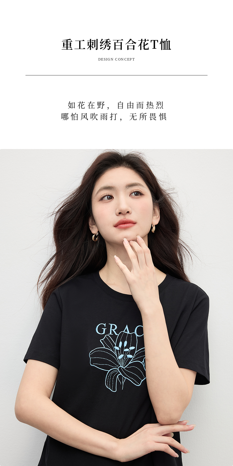 【专属特价】熙世界重工刺绣百合花T恤女短袖2025新款春夏休闲风圆领正肩上衣