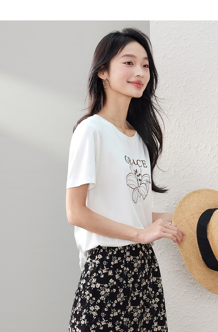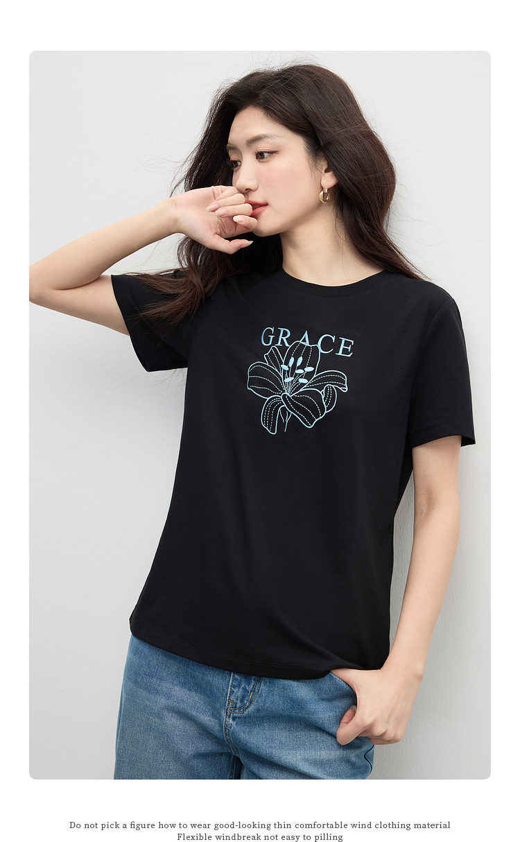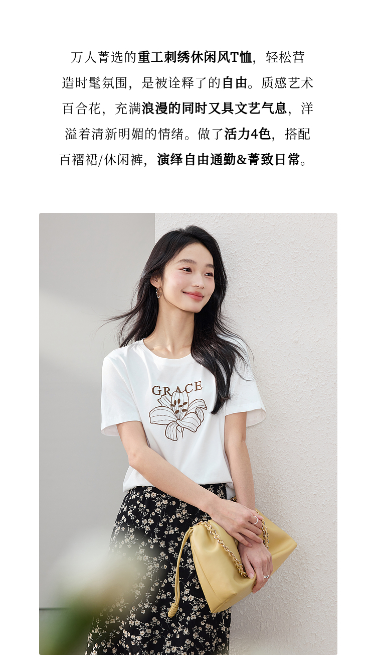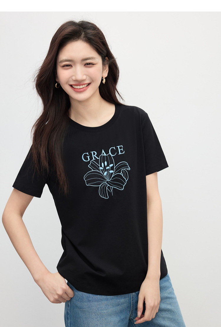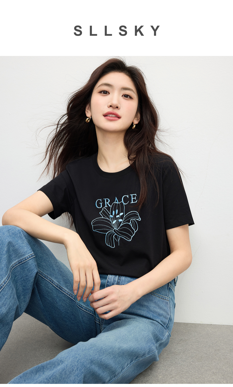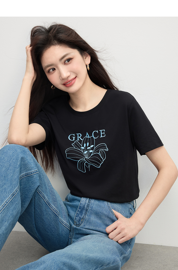 【专属特价】熙世界重工刺绣百合花T恤女短袖2025新款春夏休闲风圆领正肩上衣