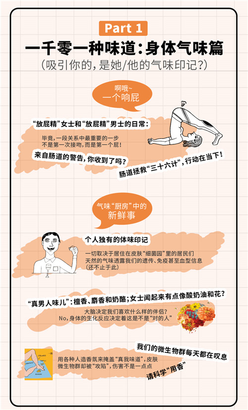 部分 体味:一千零一种味道章 关上“门”以后:口臭和嘴里的其他异味 003口臭从何而来 005针对口臭,我们可以做些什么 011第2章 啊哦,一个响屁:来自“地下停车场”的独特气味 018肠子的警告 019这样做对肠道好哦 024第3章 气味“厨房”中的新鲜事:体味和汗水 029我们的个人体味印记 031我们的微生物群每天都在叹息 035欢迎来到奶酪卖场:臭袜子和汗脚 038裤裆里的一切都好吗 040