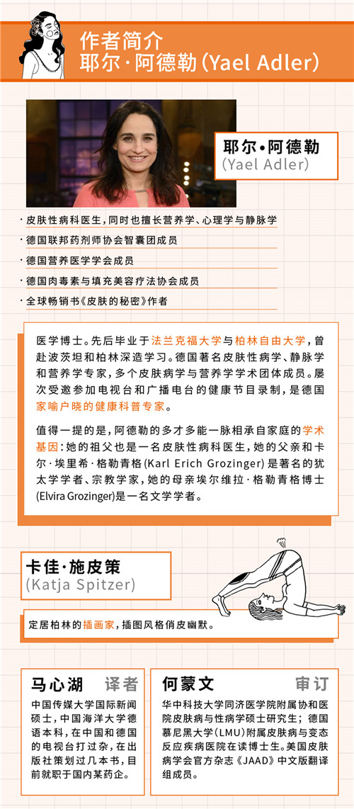 耶尔•阿德勒(Yael Adler)医学博士。先后毕业于法兰克福大学与柏林自由大学,曾赴波茨坦和柏林深造学习。德国皮肤性病学、静脉学和营养学专家,多个皮肤病学与营养学学术团体成员。屡次受邀参加电视台和广播电台的健康节目录制,是德国家喻户晓的健康科普专家。