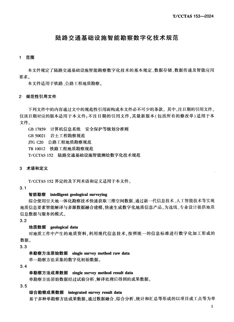 书名:陆路交通基础设施智能勘察数字化技术规范T/CCTAS 153—2024
