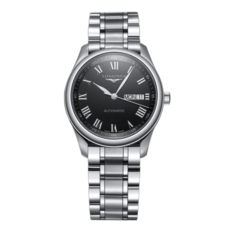 镜面 材质 | 蓝宝石水晶玻璃 | 表盘 | 精钢表壳 黑色"麦粒"饰纹表盘, 镀银沙色指针,漆绘罗马数字 大三针 日期星期显示 罗马数字时标 |