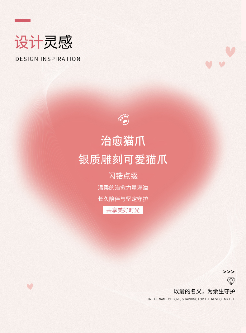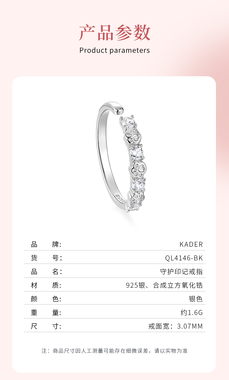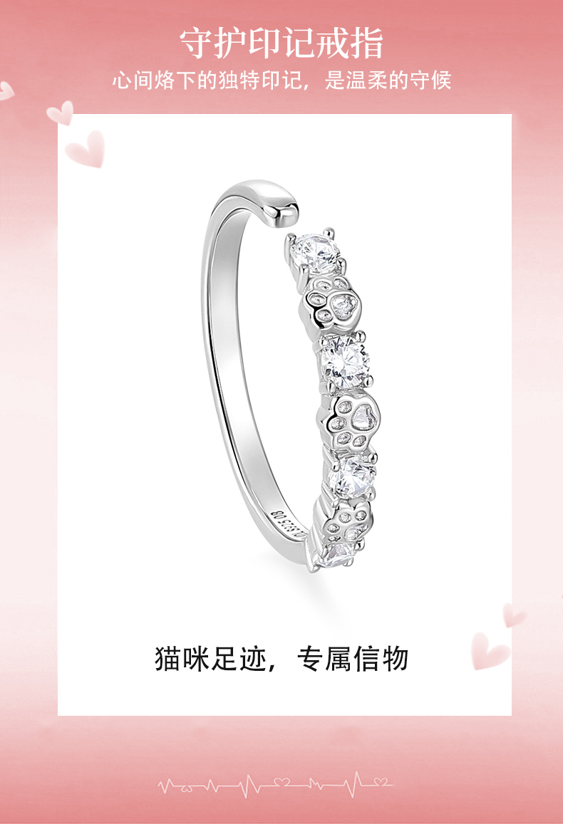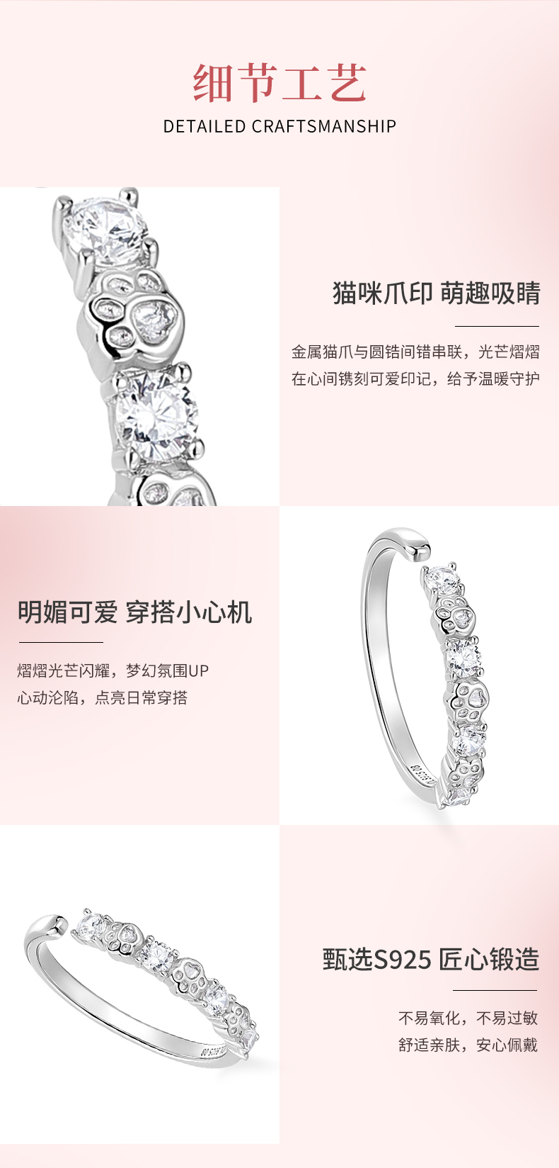 卡蒂罗KADER 守护印记女戒 925银萌趣镶嵌闪锆猫爪精致简约大气素圈可调节单戒 怦然心动通勤百搭
