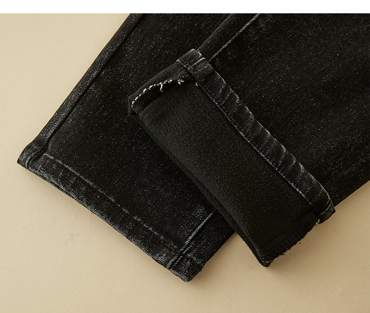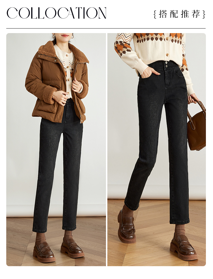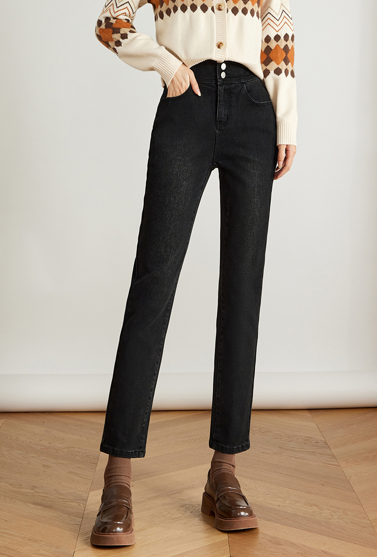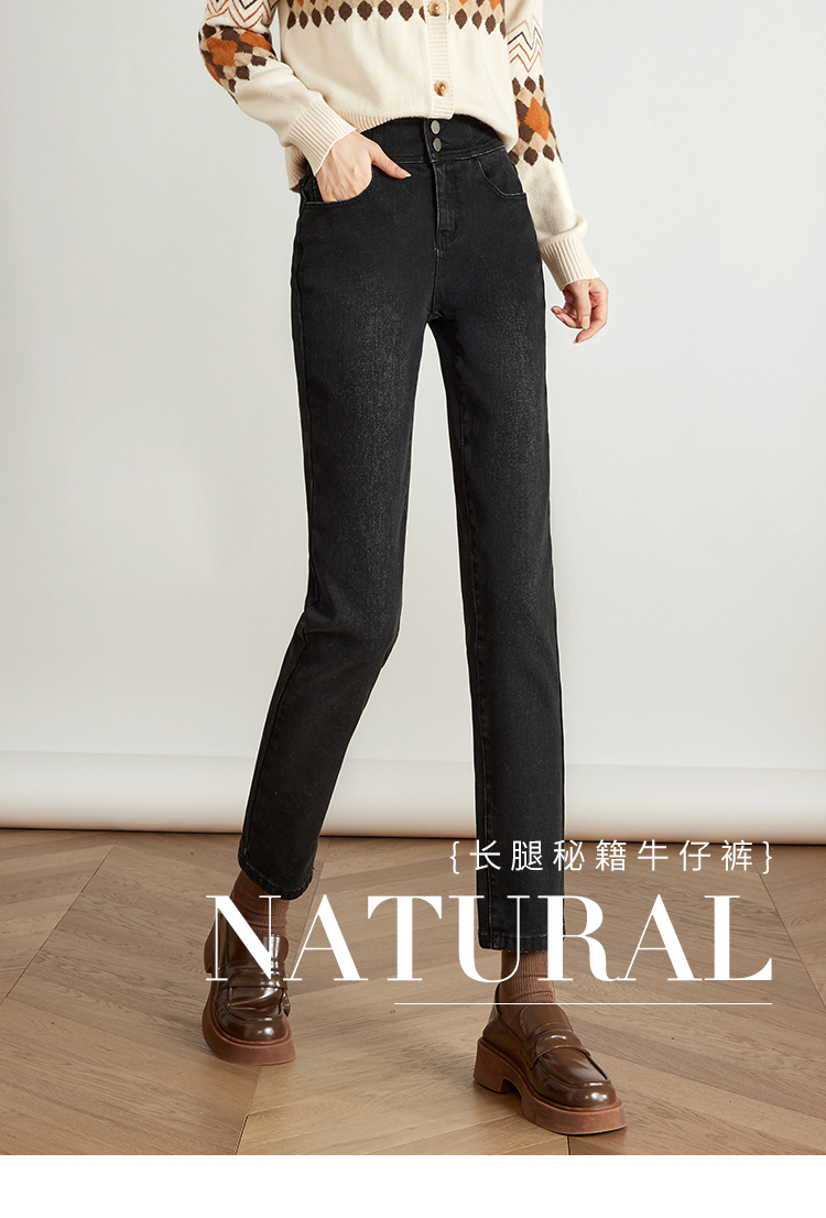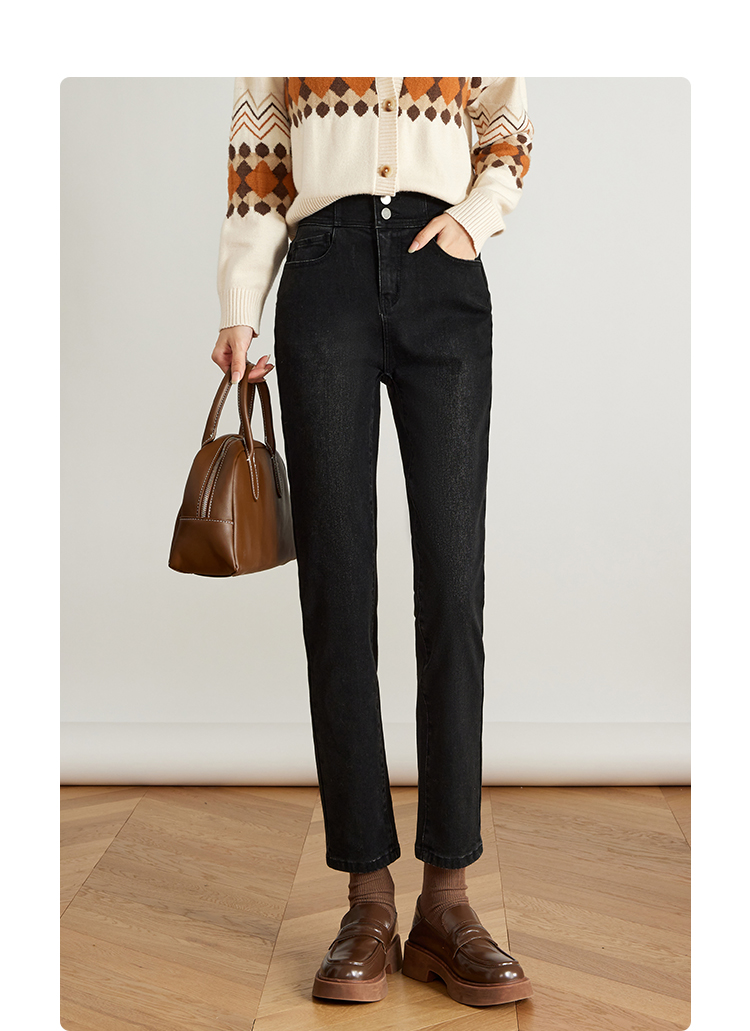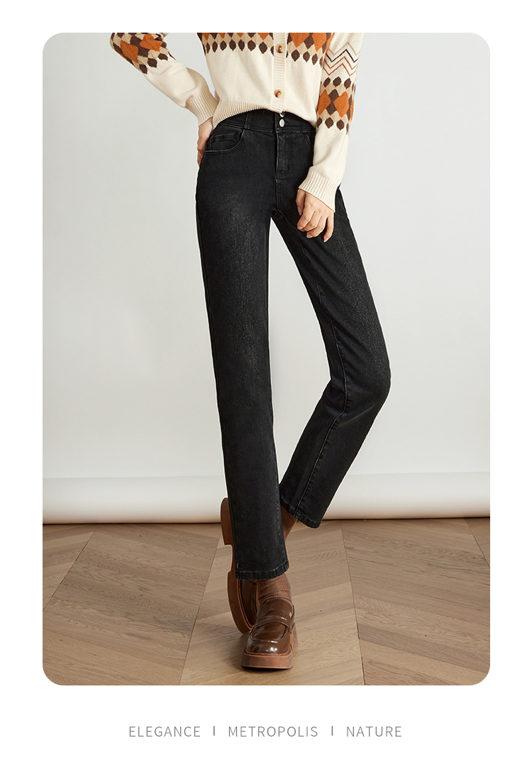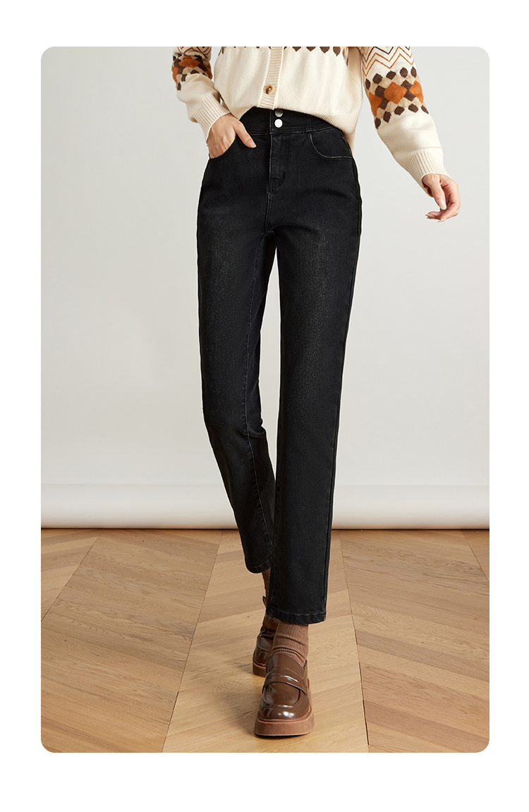 【专属特价】熙世界黑色抓毛牛仔裤女薄绒2025秋冬季新款高腰小个子直筒烟管裤