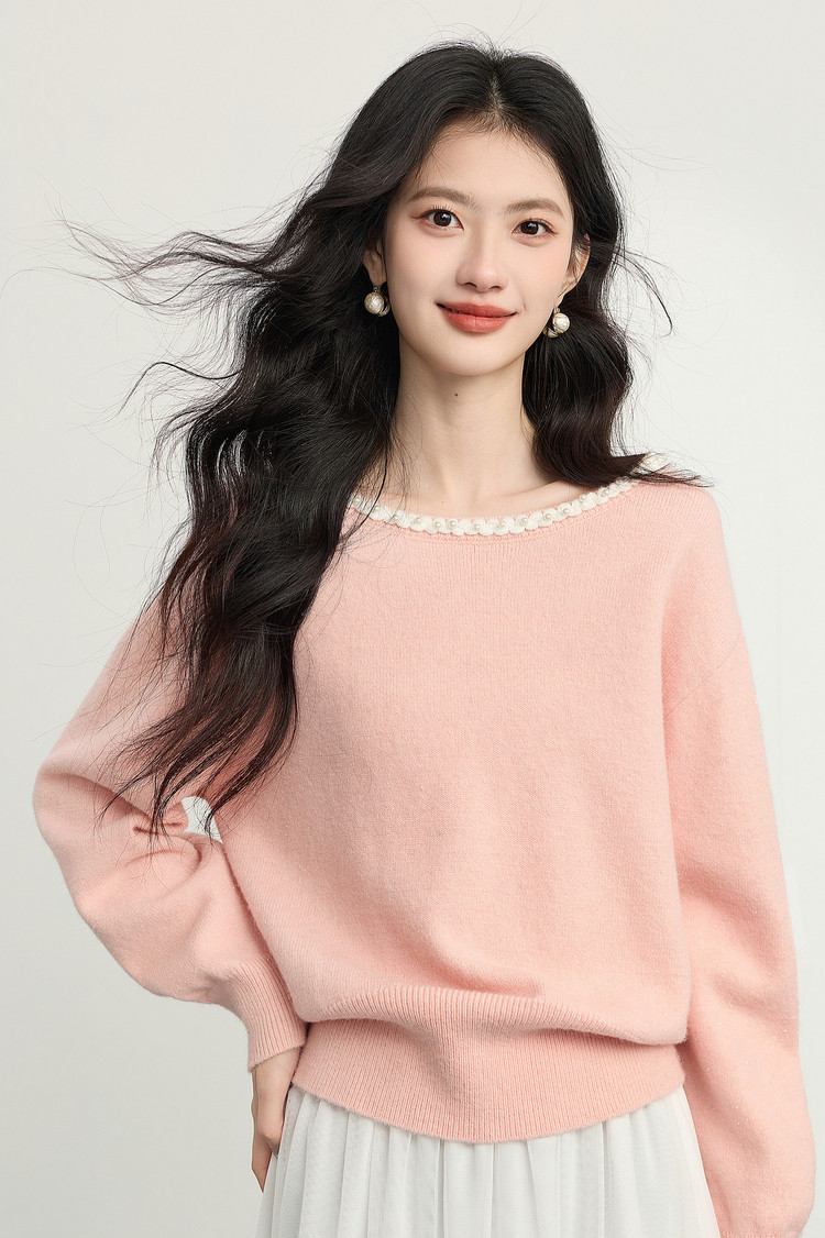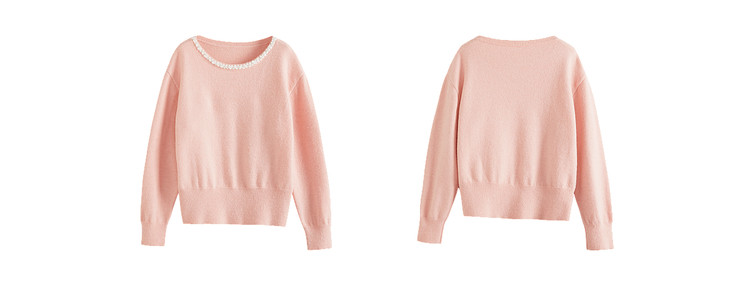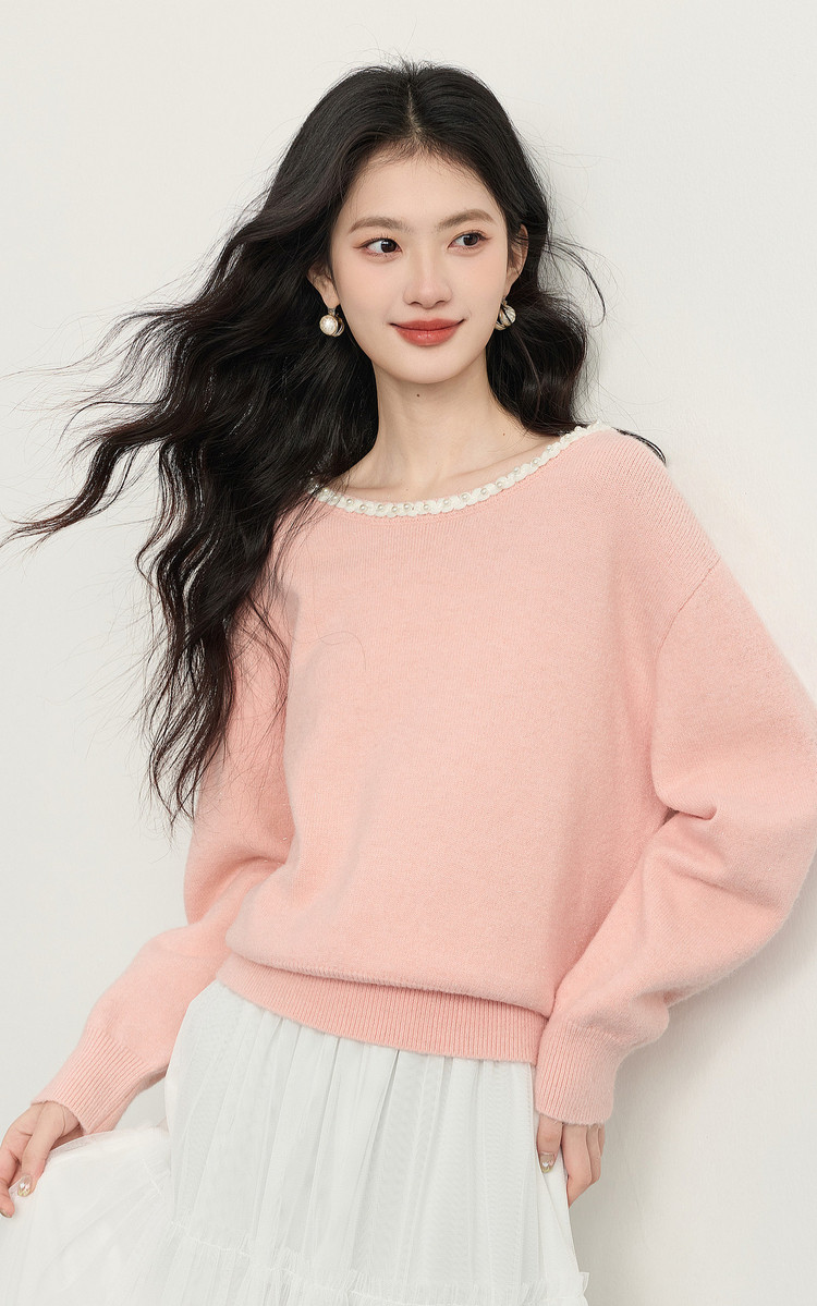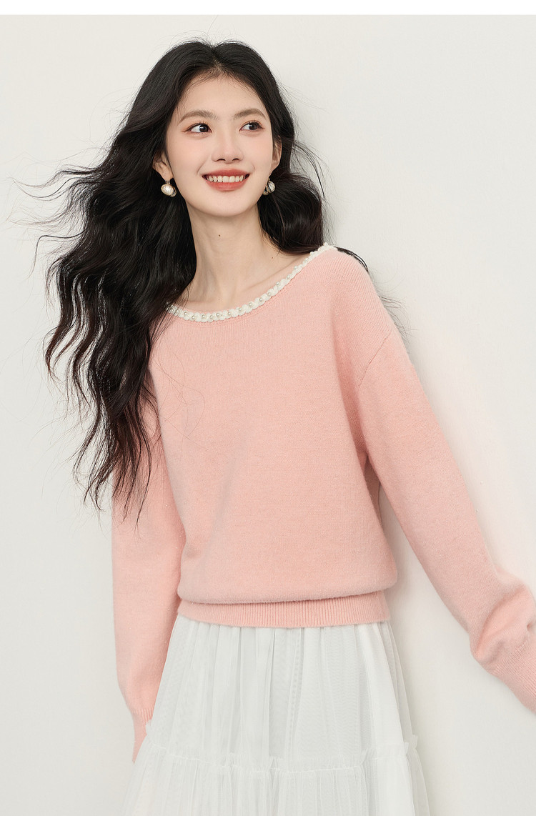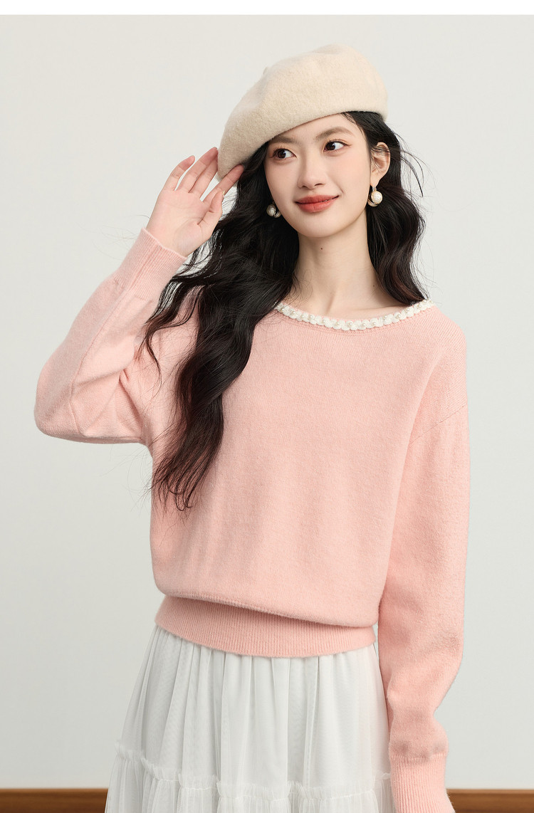 【年货节】熙世界小香风粉色毛衣女秋冬宽松慵懒甜美气质珍珠圆领套头针织衫