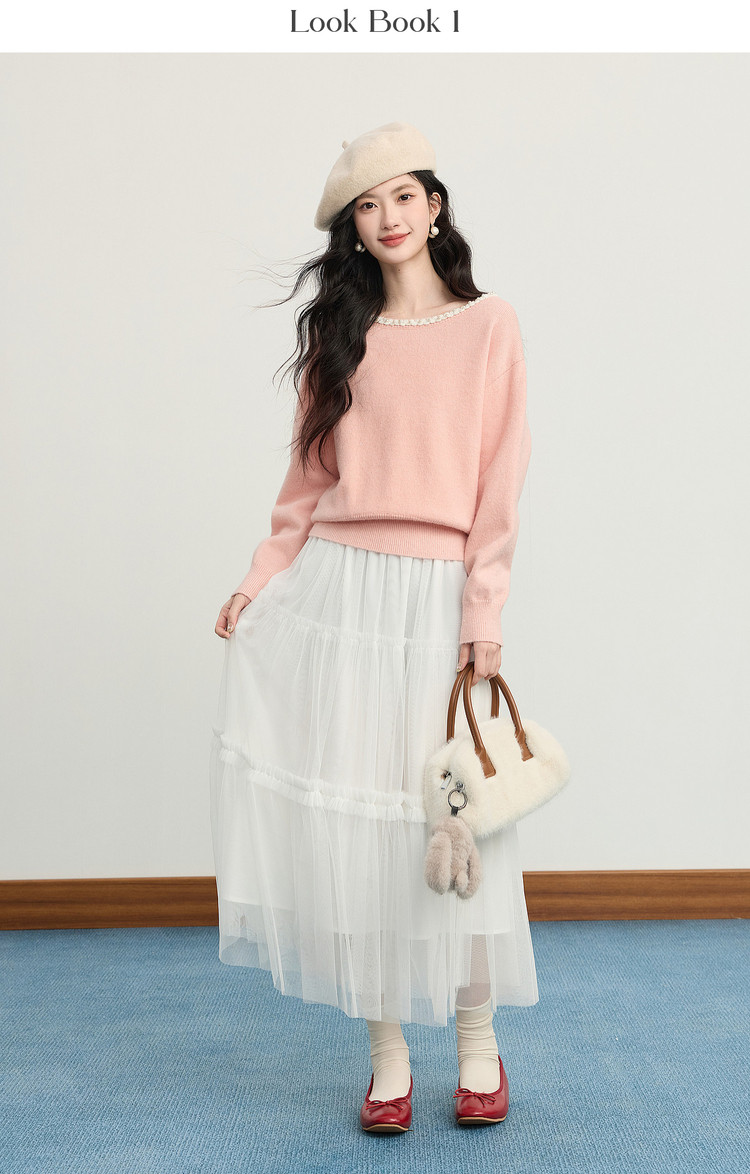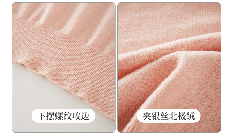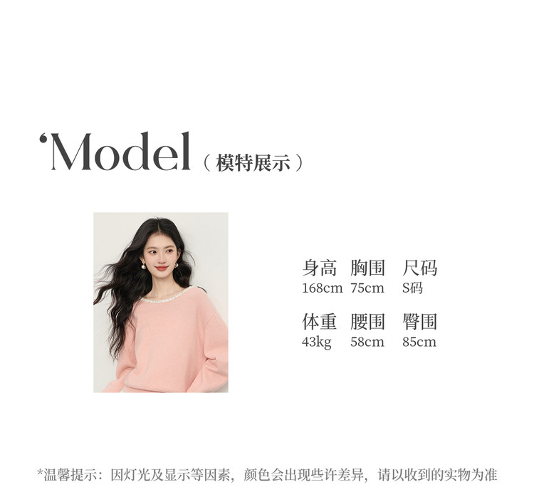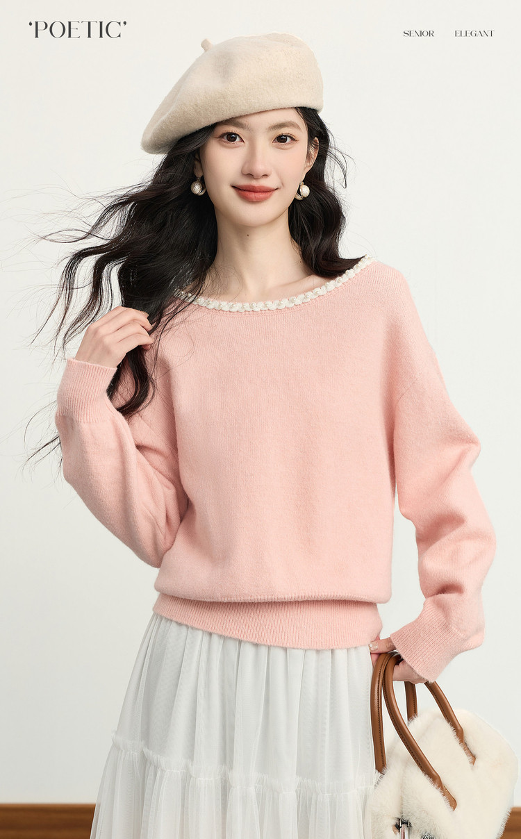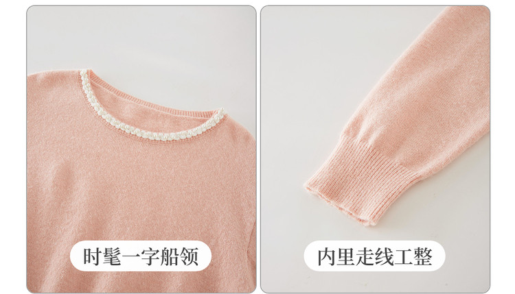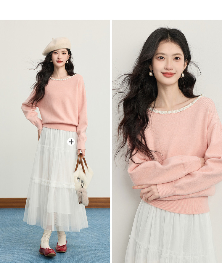 【年货节】熙世界小香风粉色毛衣女秋冬宽松慵懒甜美气质珍珠圆领套头针织衫