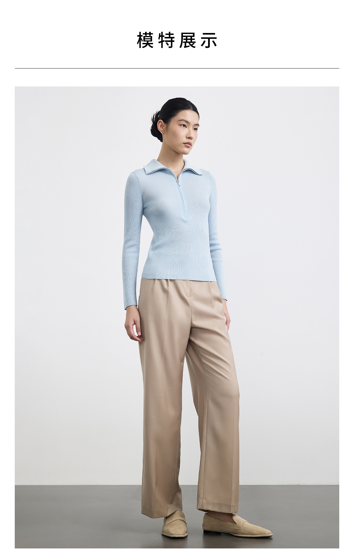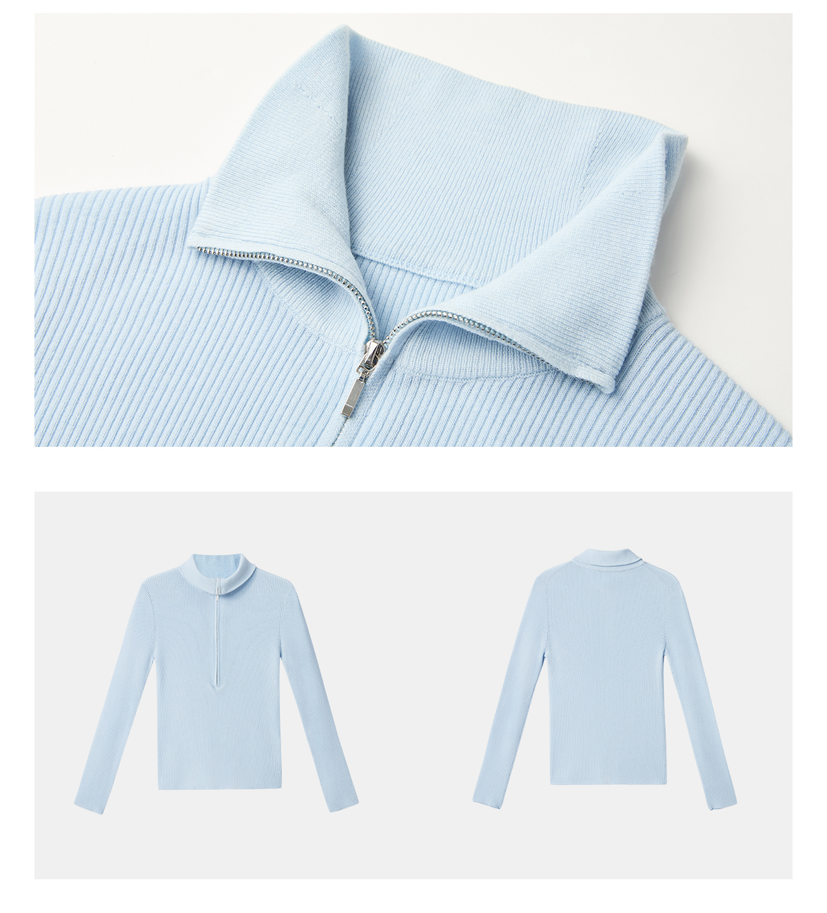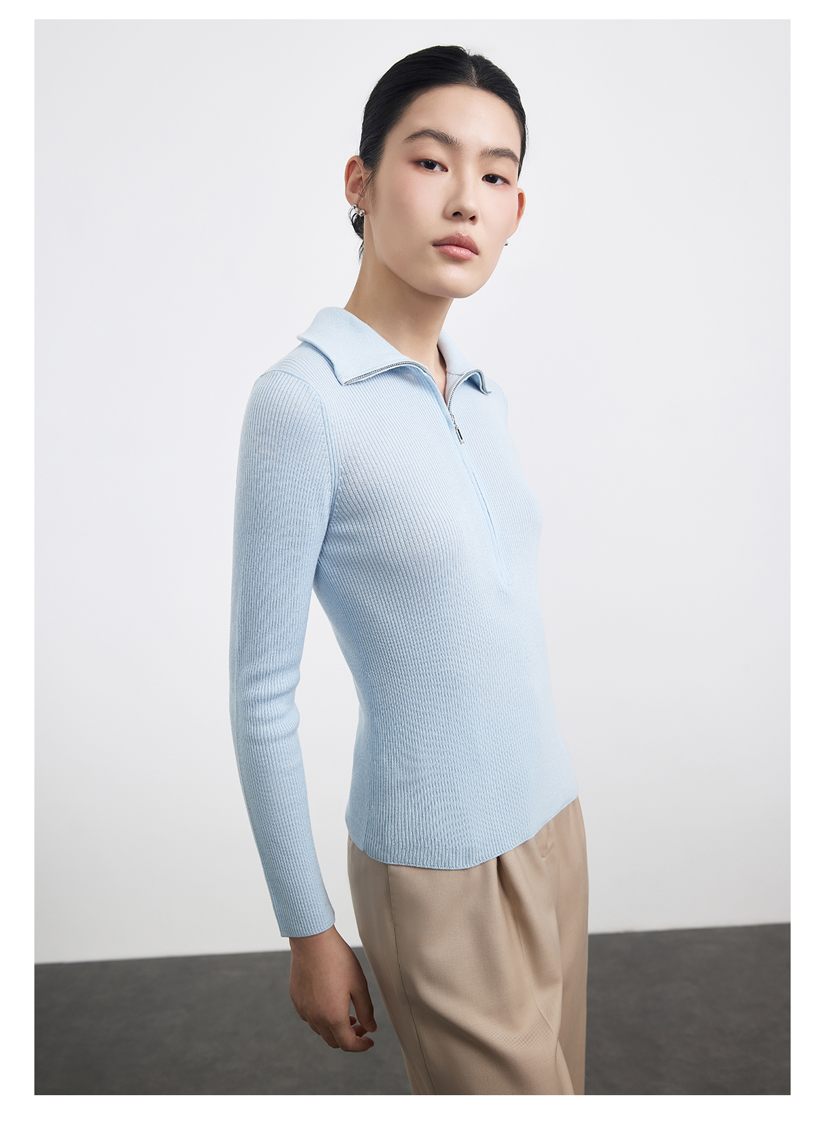 PURE TOUCH浅蓝色翻领半拉链坑条针织衫
