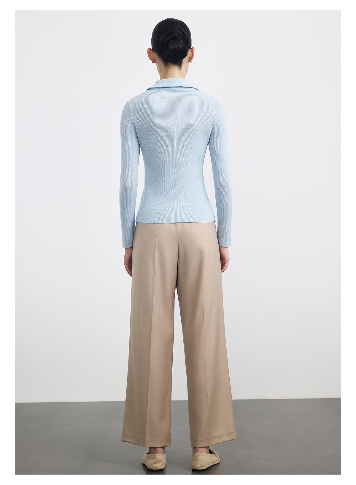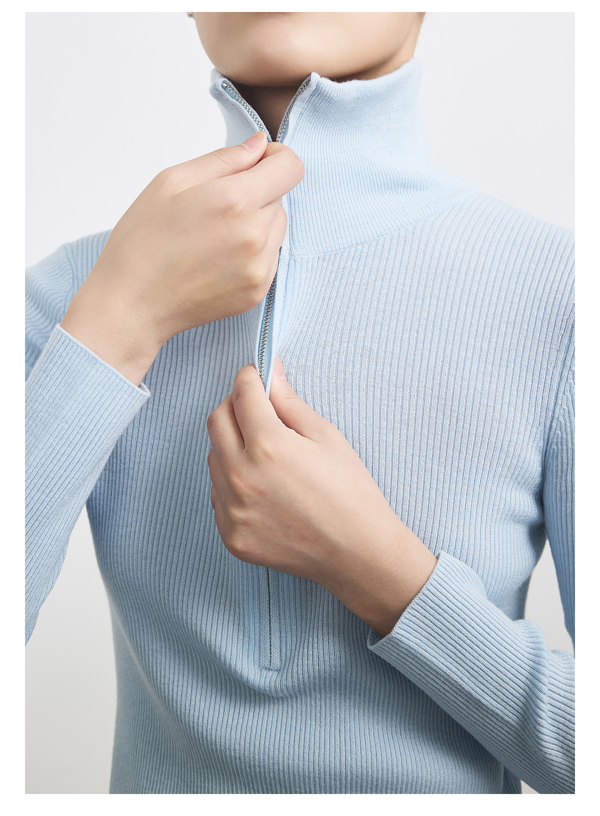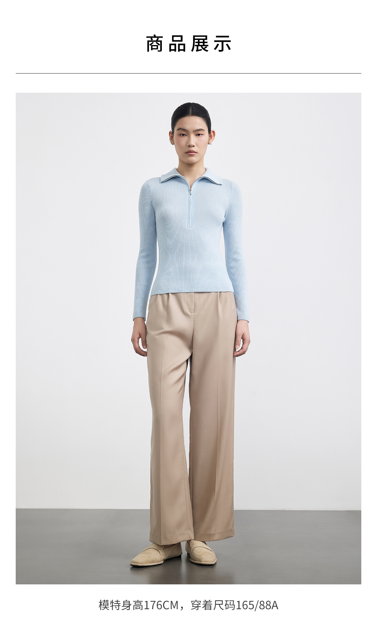 PURE TOUCH浅蓝色翻领半拉链坑条针织衫
