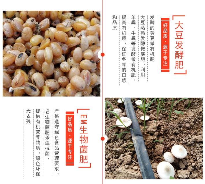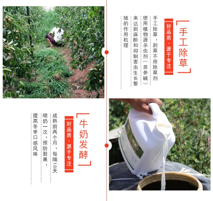 1、种植环节,大豆蒸煮发酵做底肥,利用羊粪,牛粪等发酵做有机肥,提高有机质,保证冬枣口感与品质。