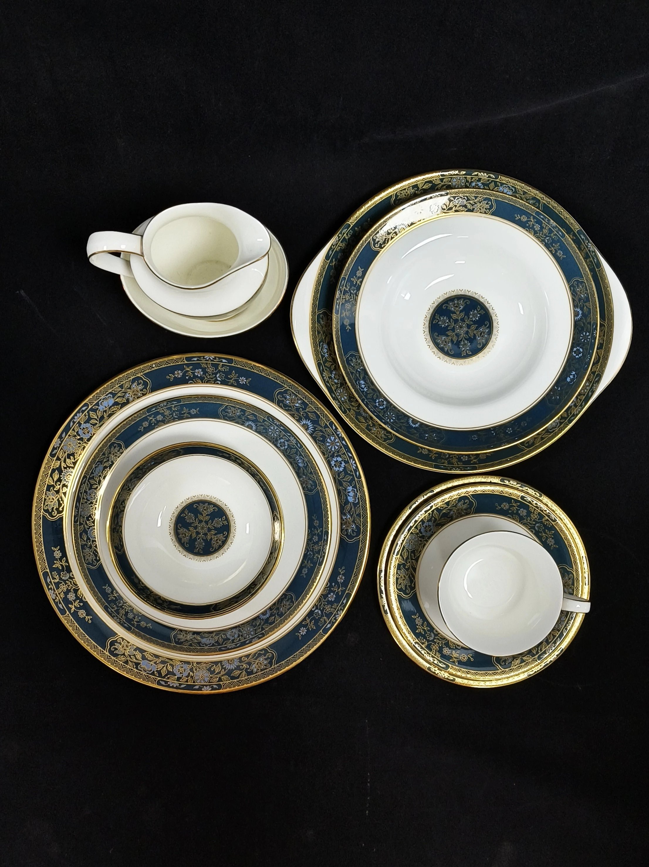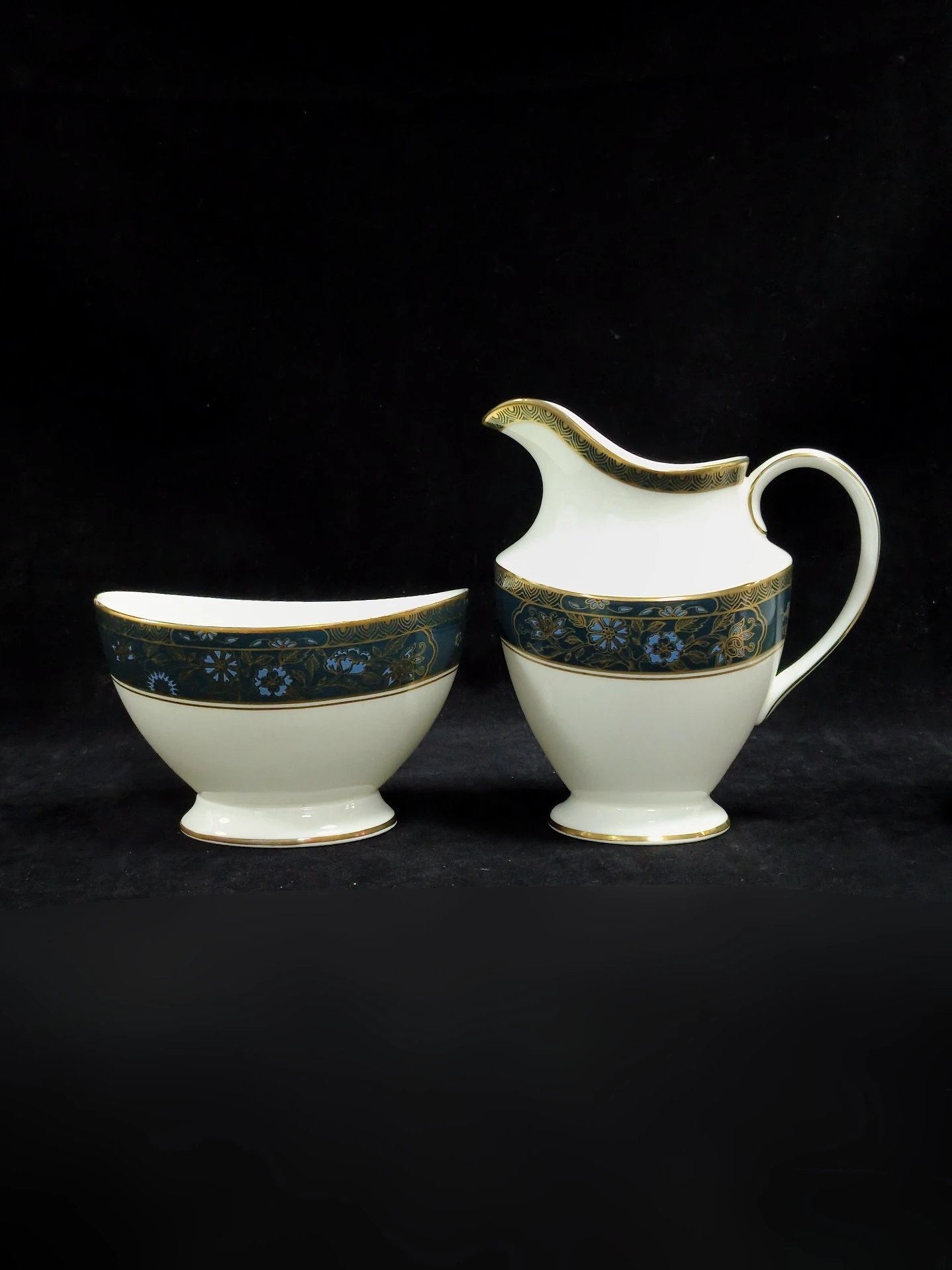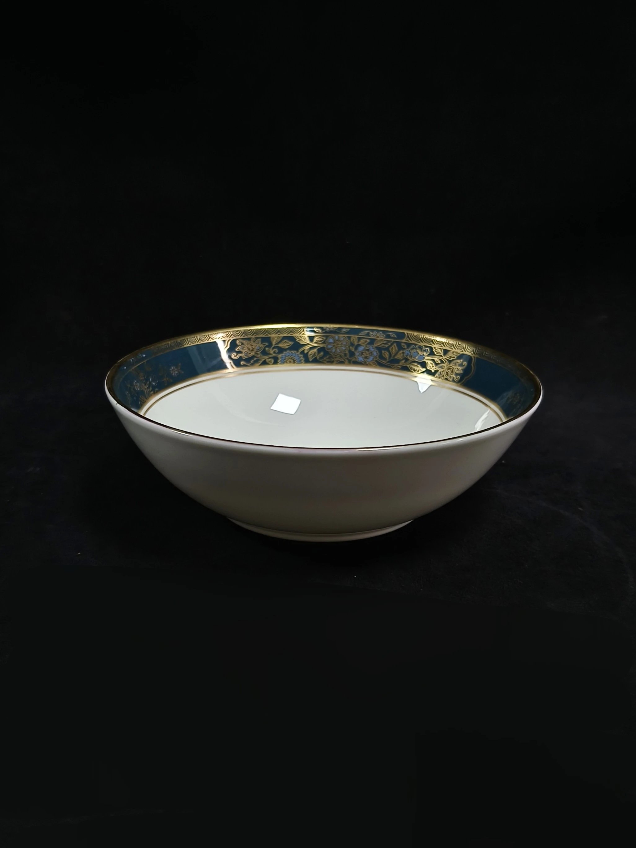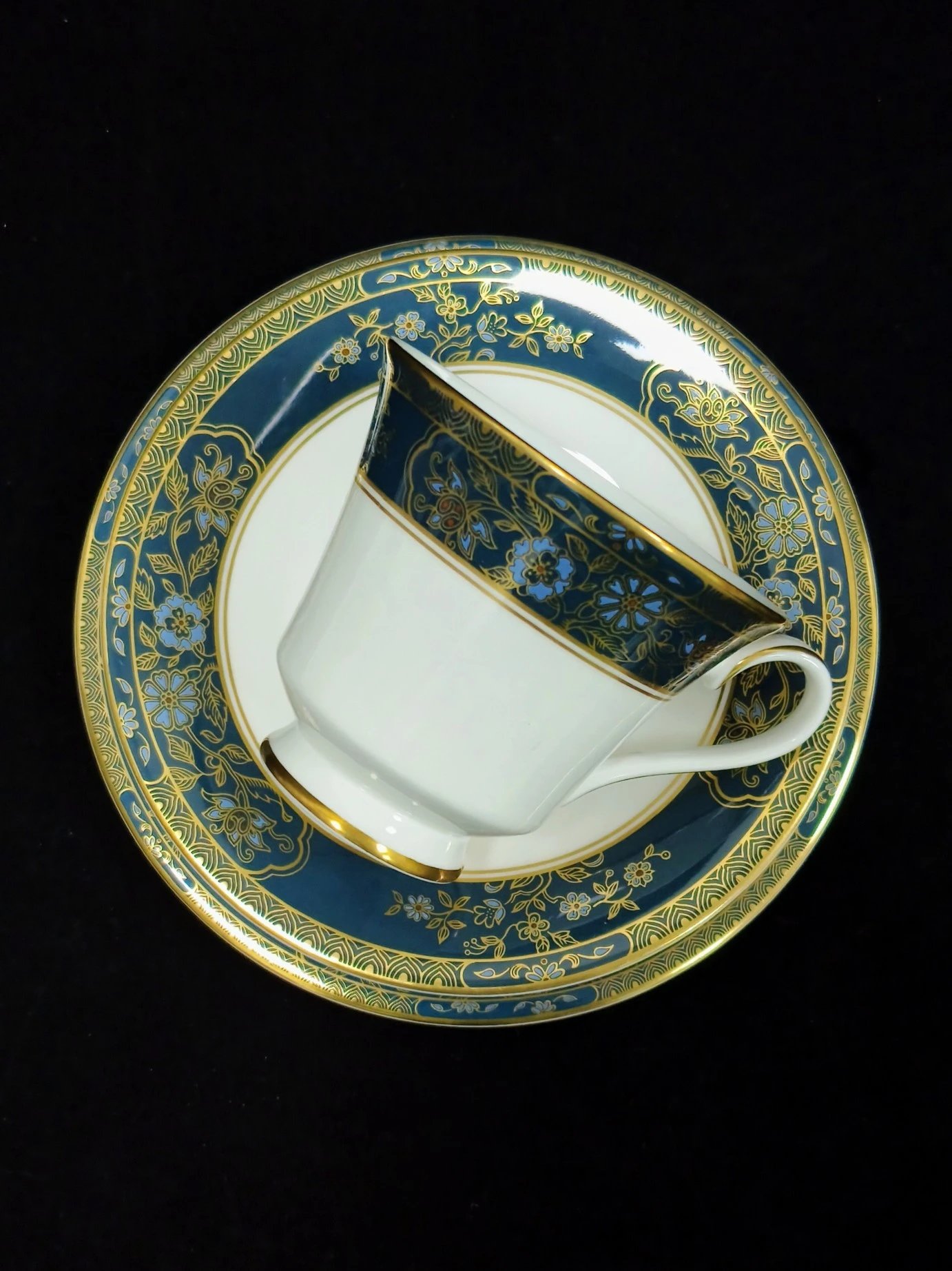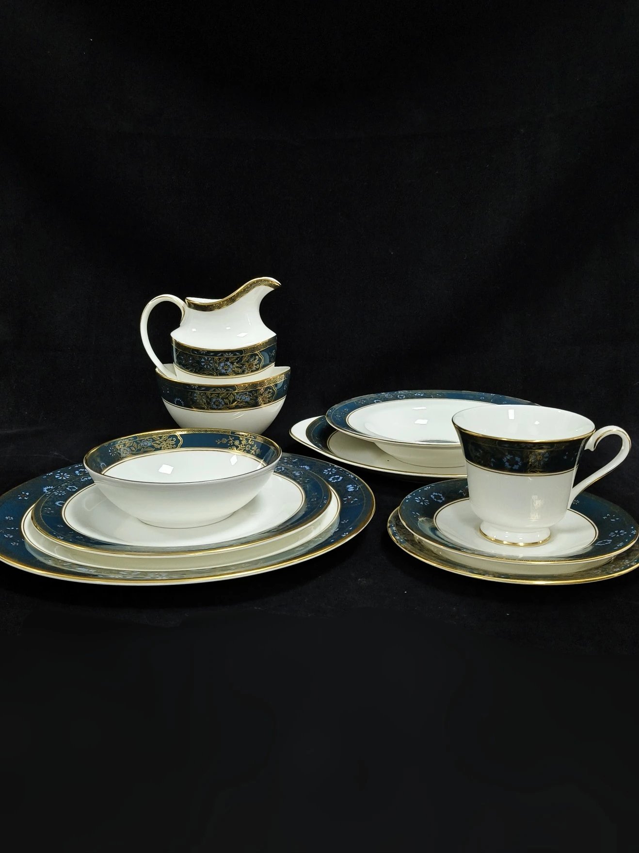 白瓷搭配靛蓝,沉稳庄重。靛蓝色上装饰精致的描金花纹,淡蓝色花瓣清新靓丽,整体看是很有格调的一套。