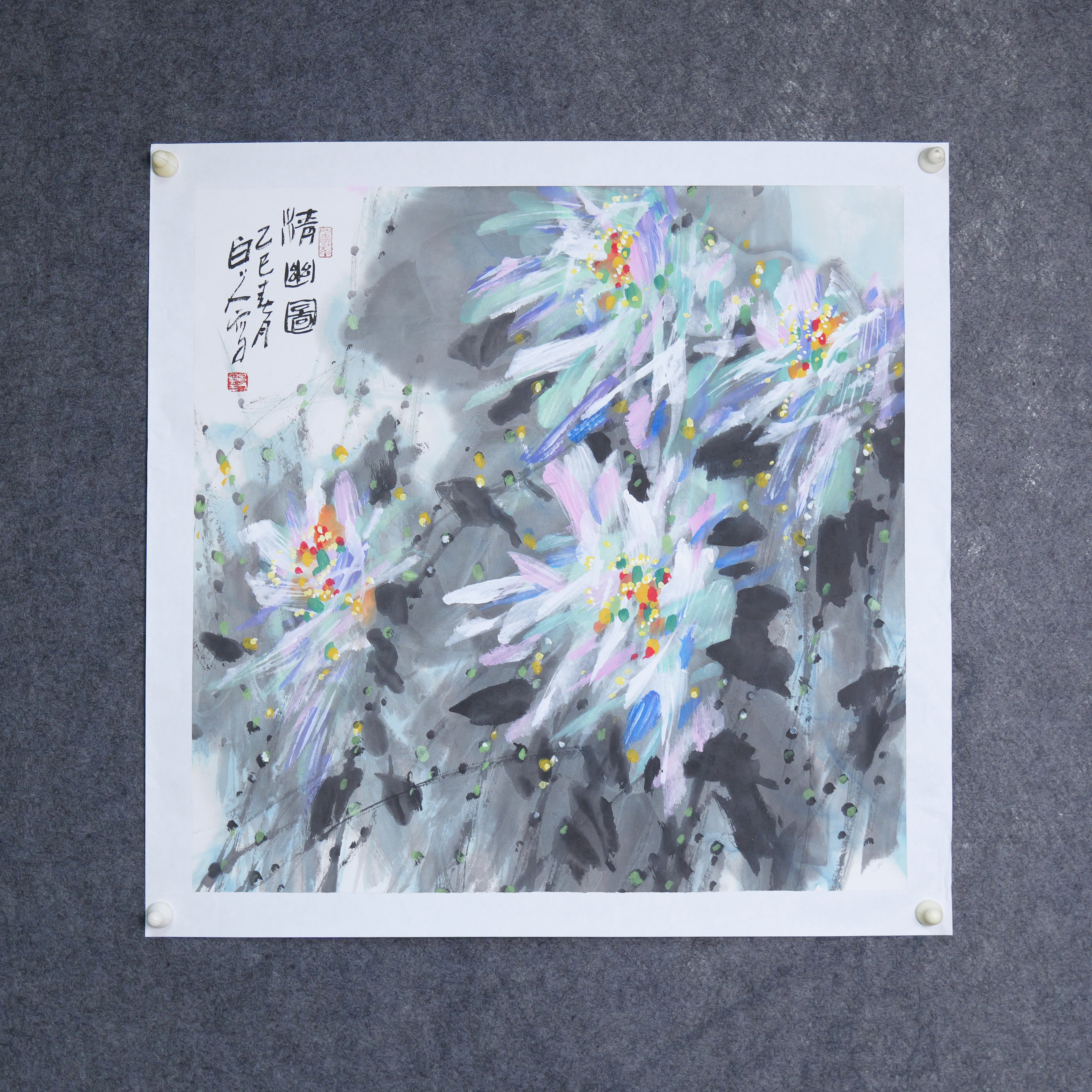 许固令《清幽图》国画原作68CM*68CM 手绘宣纸荷花斗方作品【GH0508】