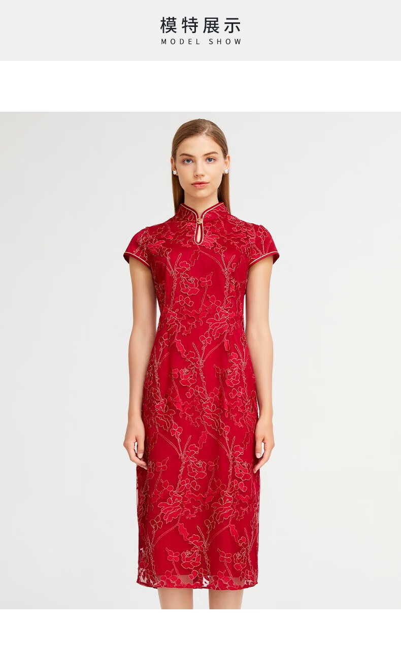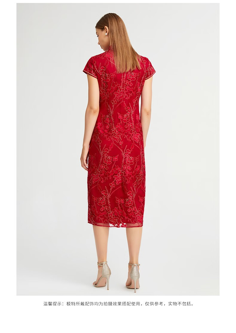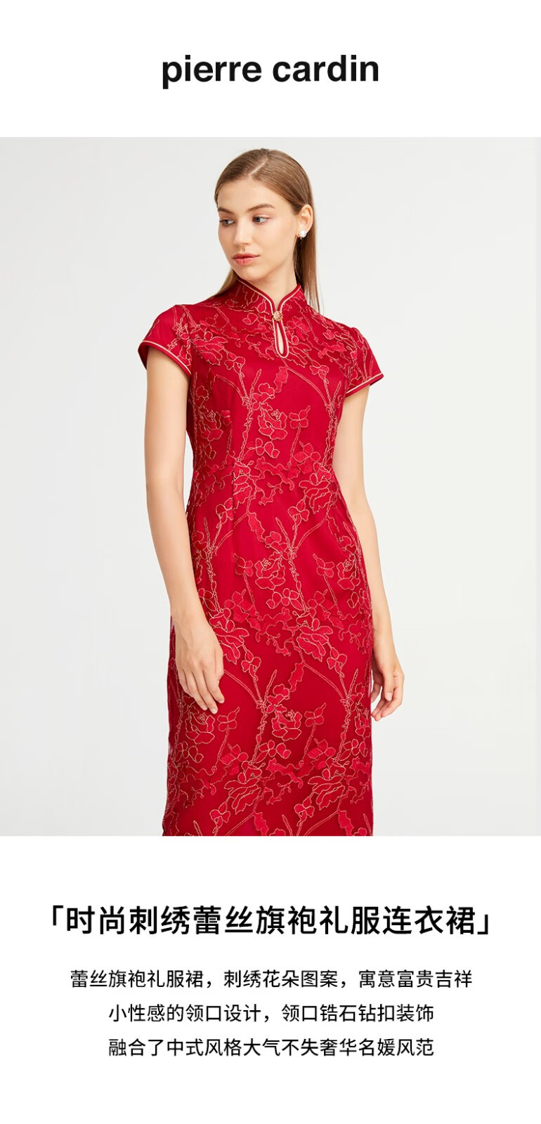 皮尔卡丹女装夏季新款淑女蕾丝刺绣旗袍连衣裙P2203D2150R0