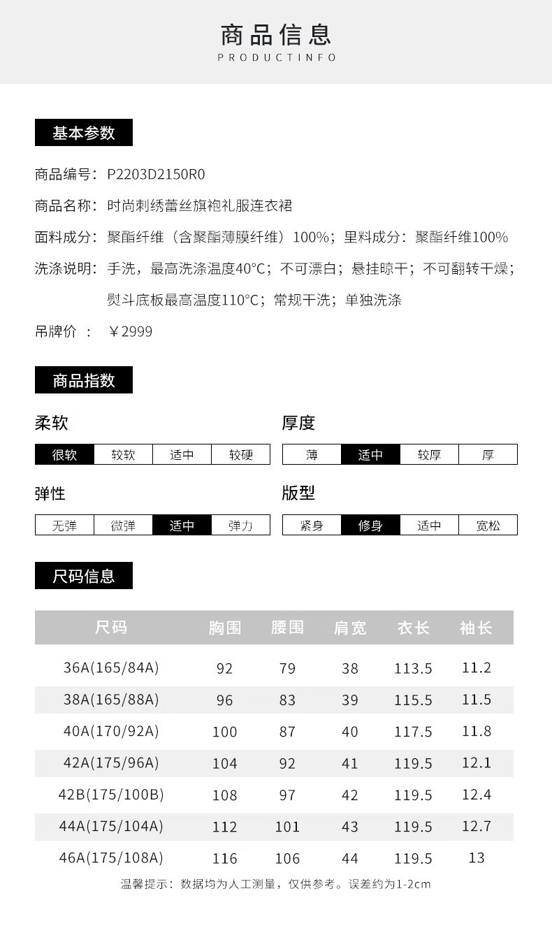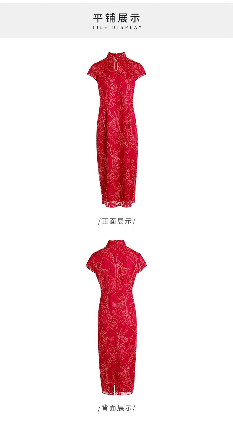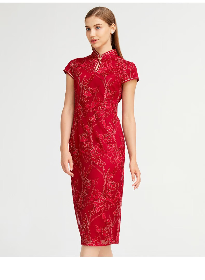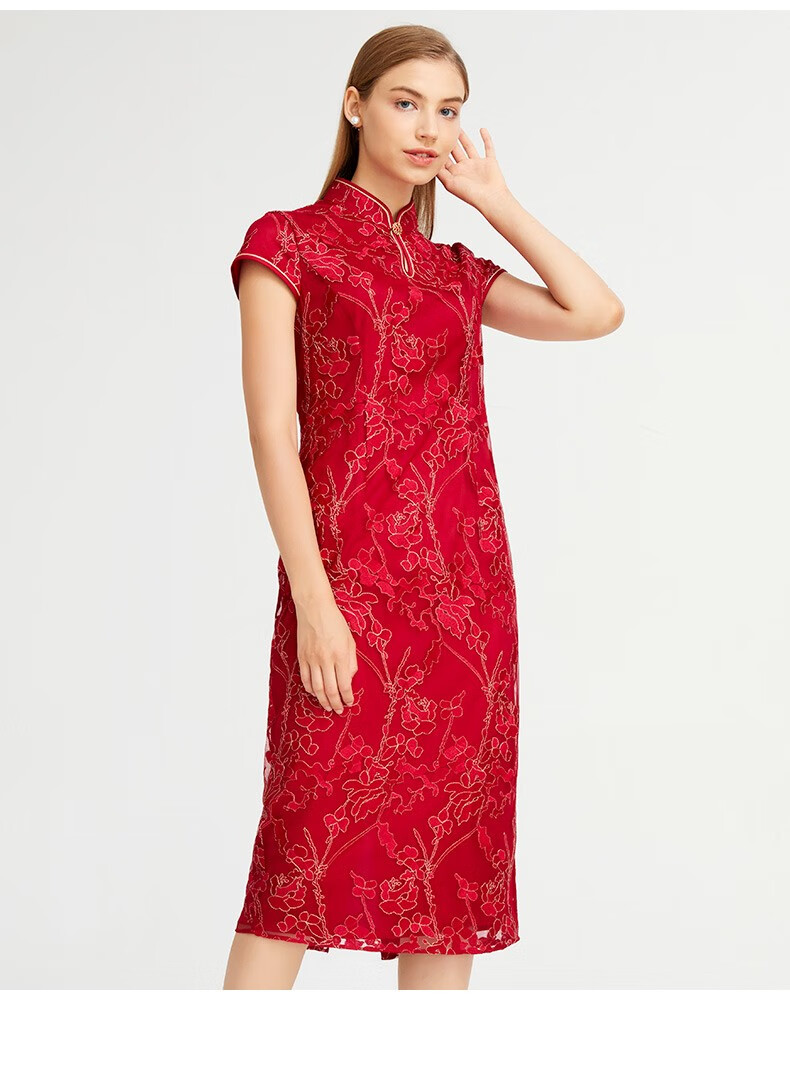 皮尔卡丹女装夏季新款淑女蕾丝刺绣旗袍连衣裙P2203D2150R0