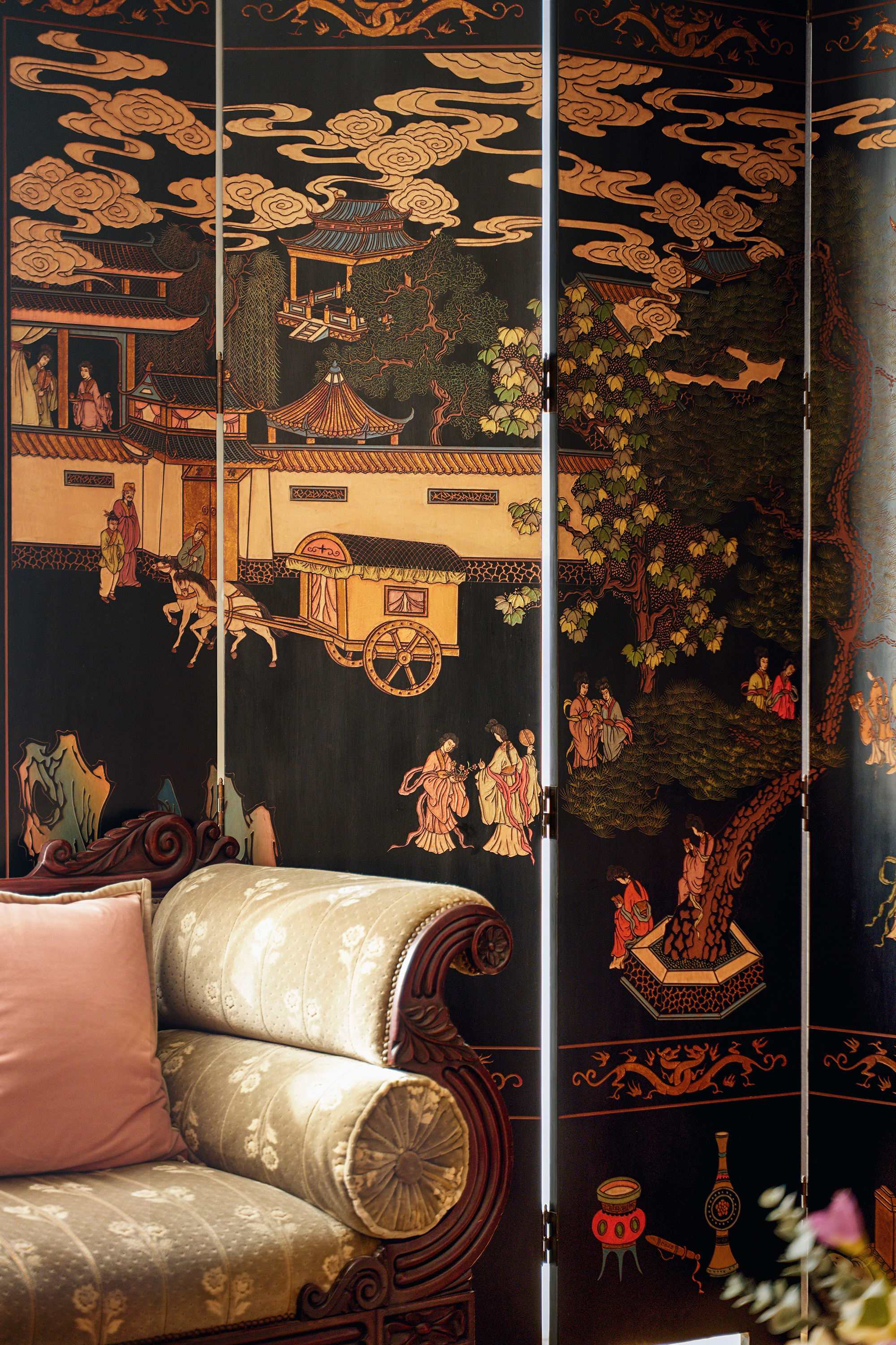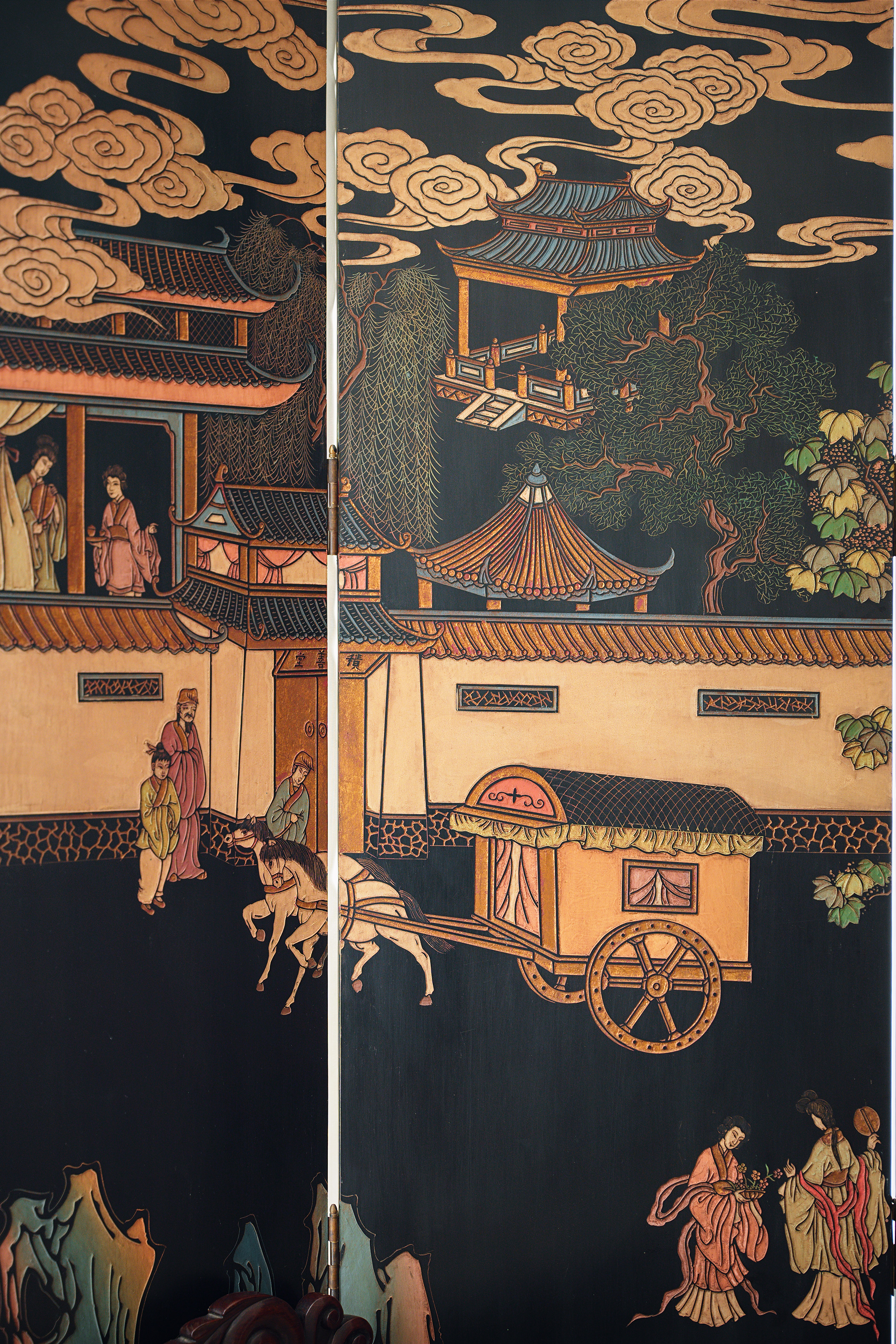 20世纪中国出品官邸人物与奇石花鸟主题黑漆地款彩双面八曲屏风