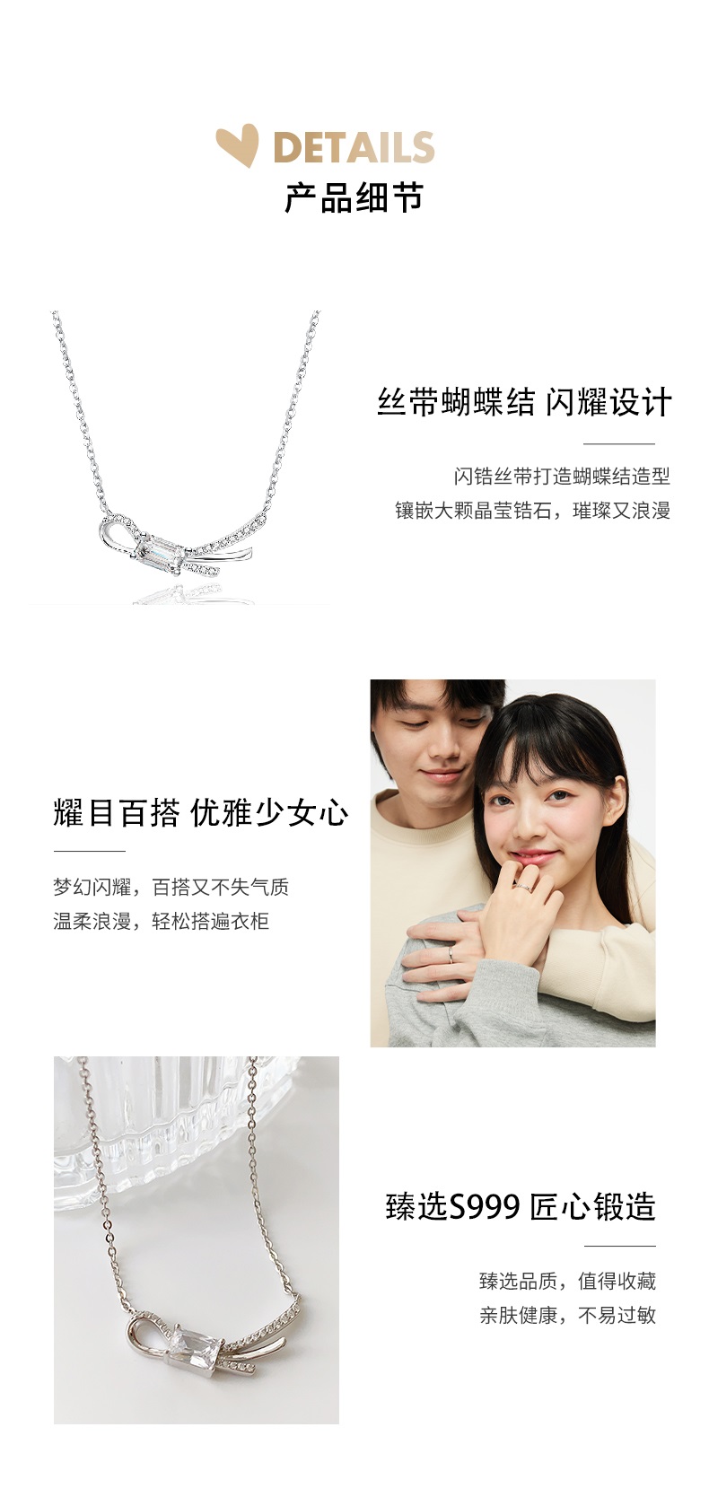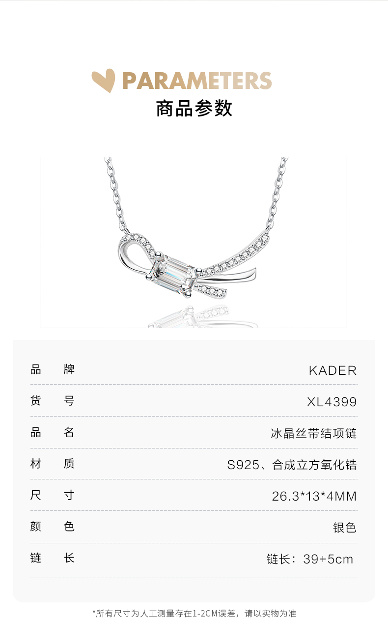 KADER卡蒂罗 冰晶丝带结项链 925银闪锆蝴蝶结浪漫简约设计锁骨链 梦幻温柔气质百搭配饰 送女友礼物 礼盒装