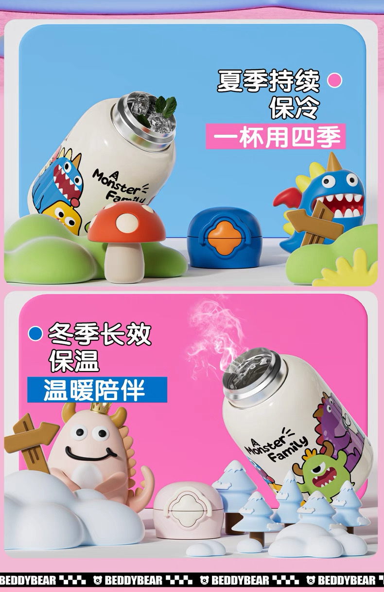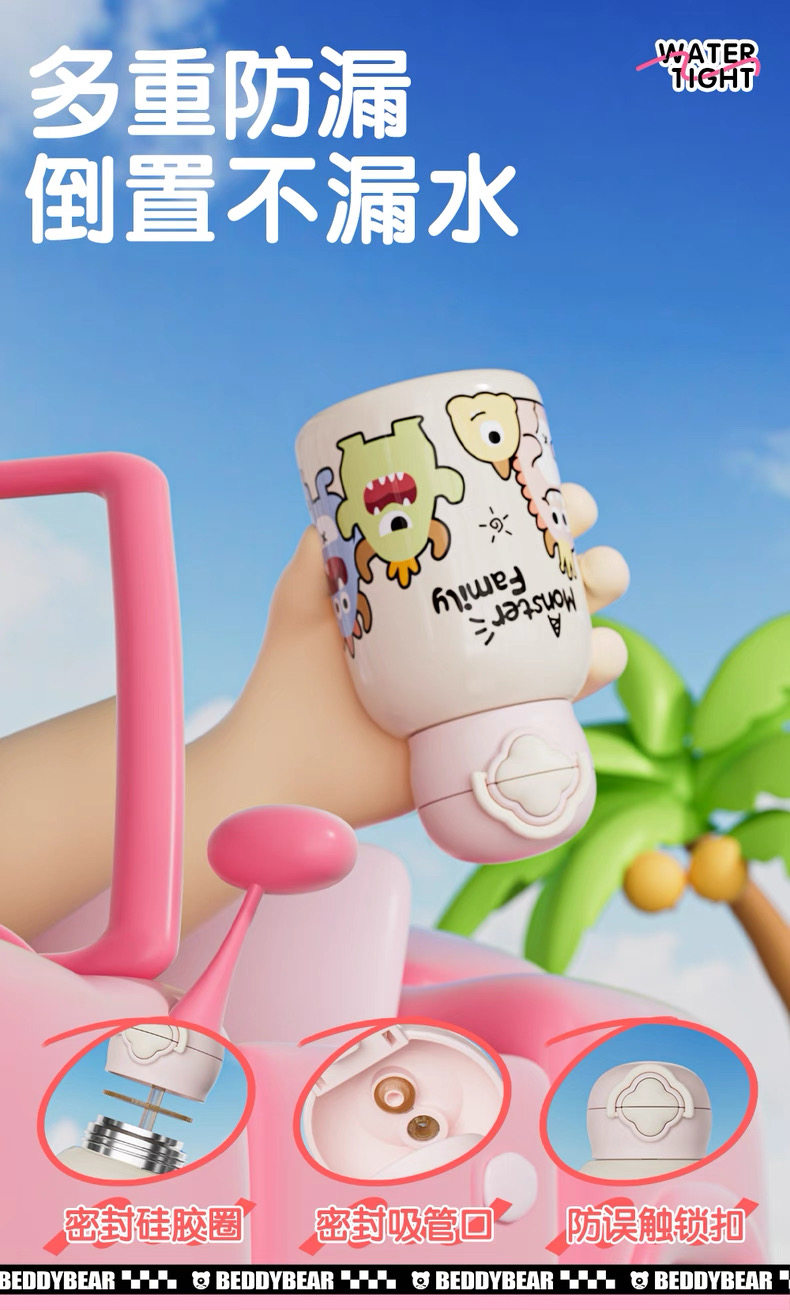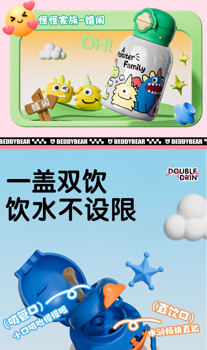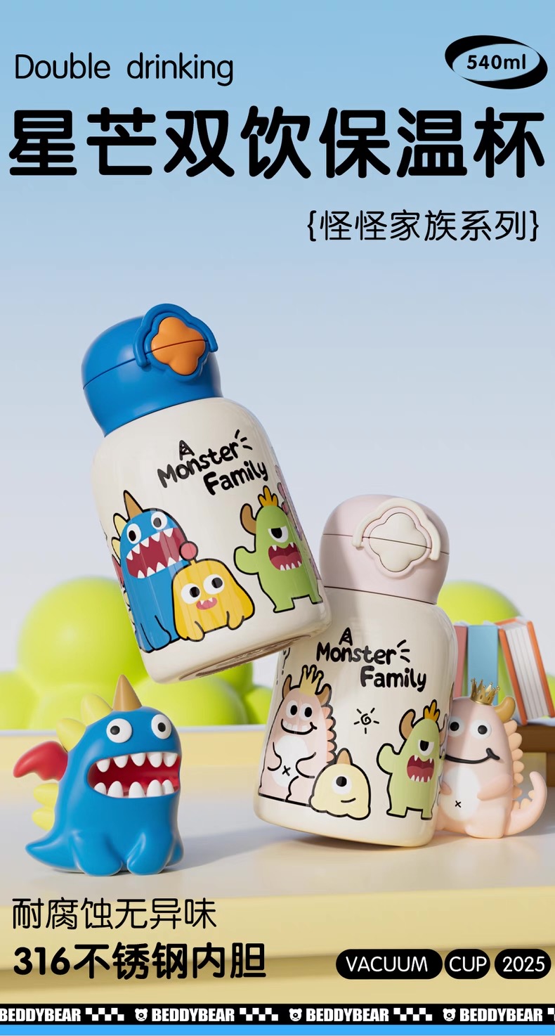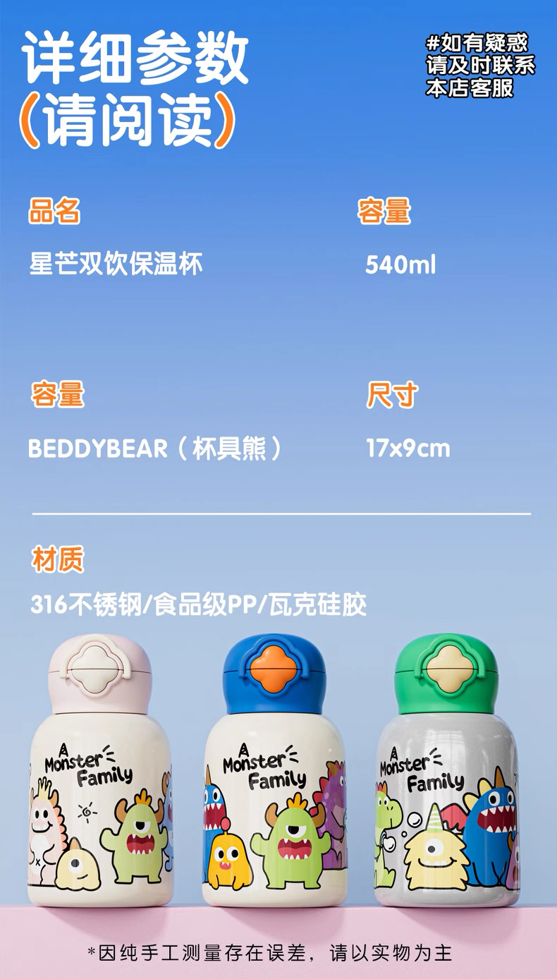 【品牌直发】【杯具熊星芒双饮怪怪家族系列】双饮保温杯540ml 儿童吸管水杯水壶一盖双饮杯可爱幼儿园316不锈钢