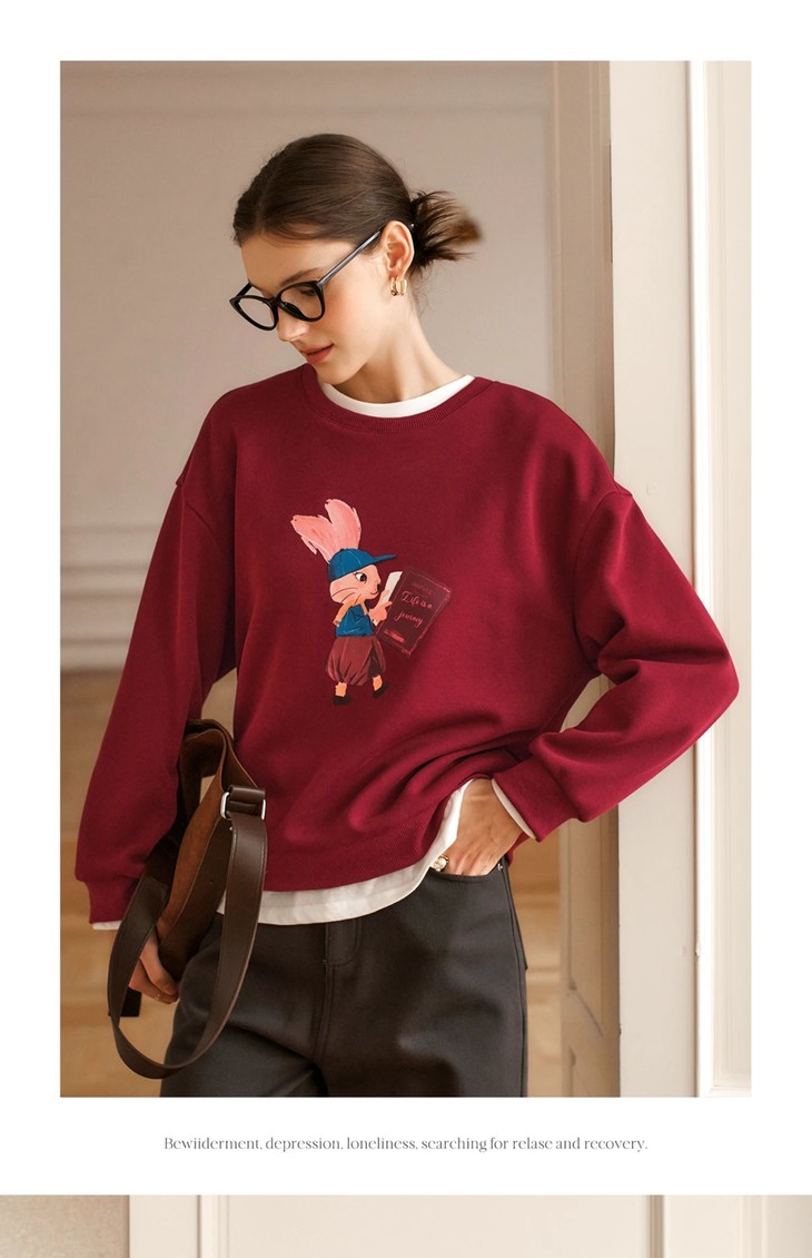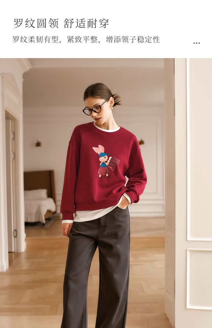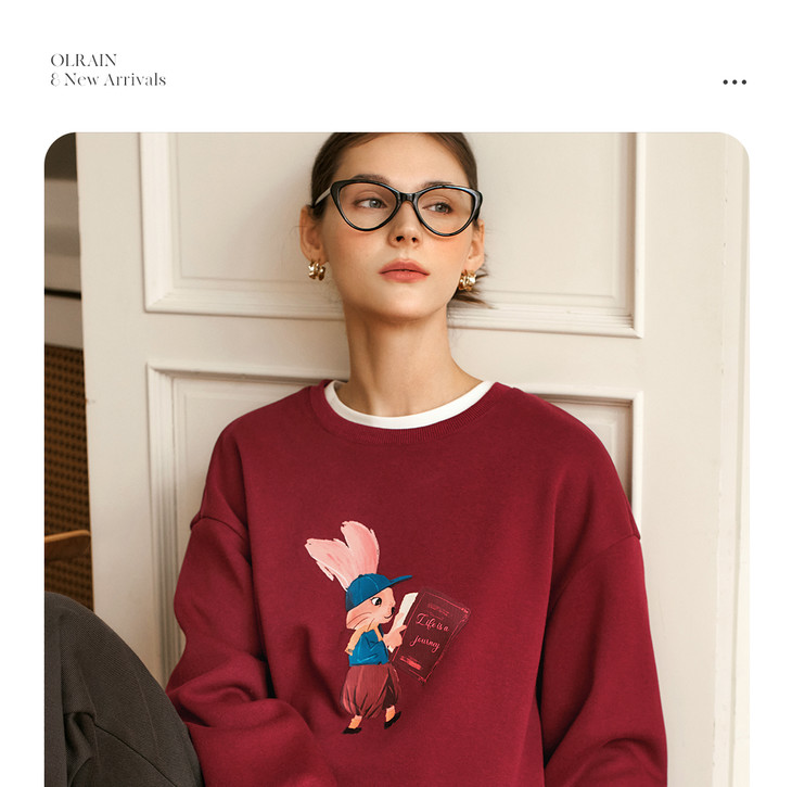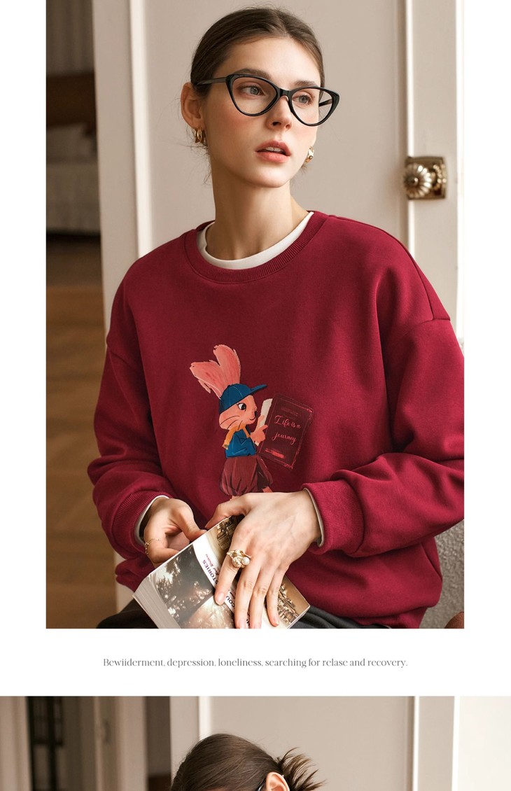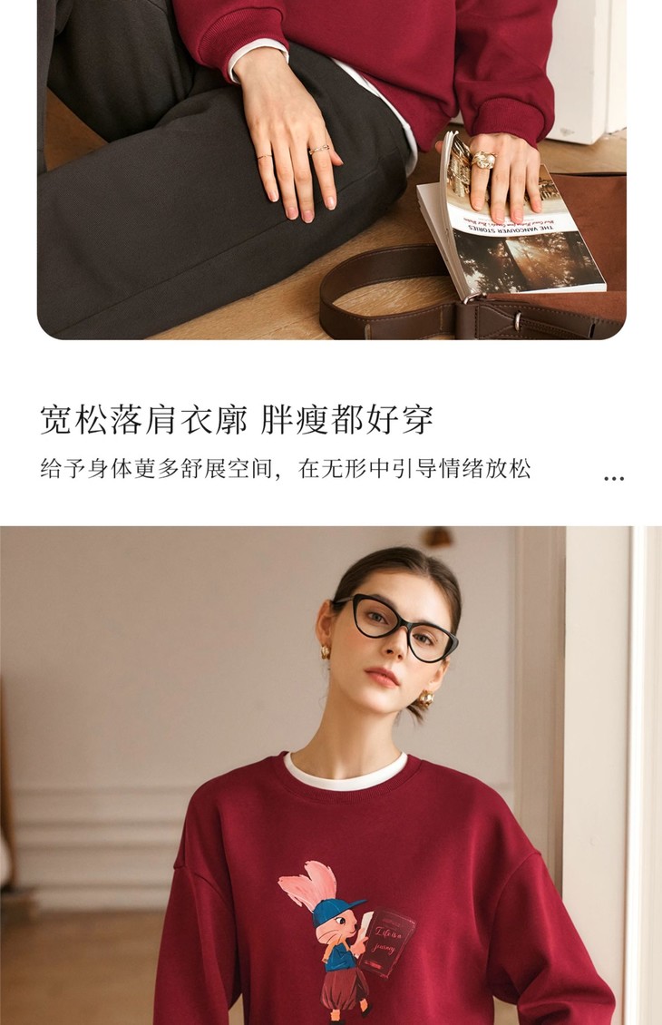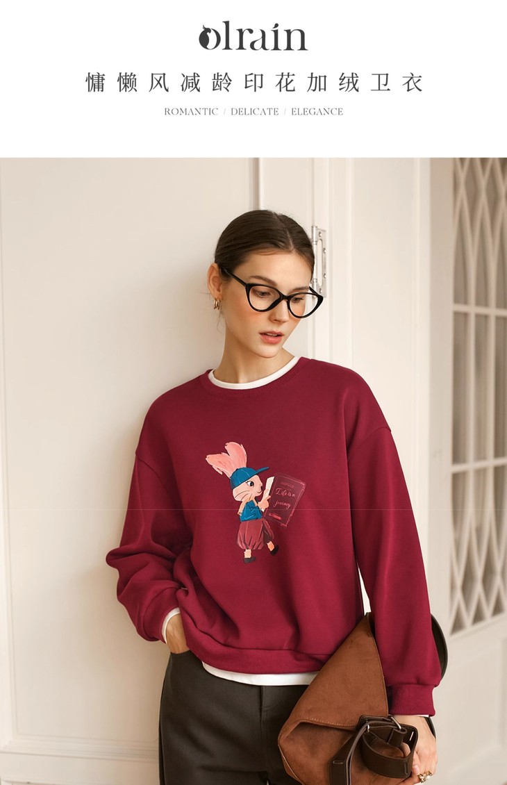 OLrain欧芮儿红色加绒卫衣女冬季2024年新款慵懒风趣味印花套头衫