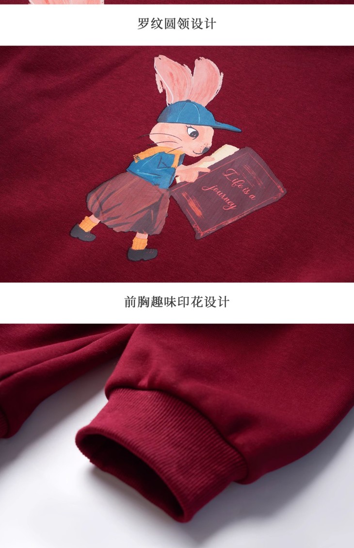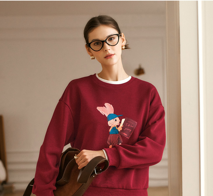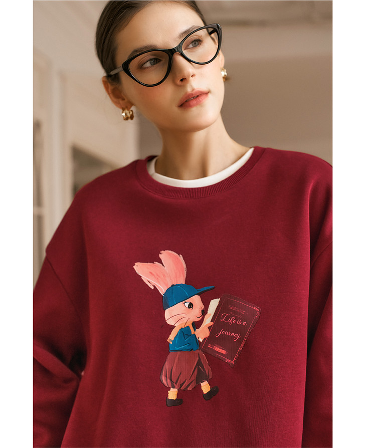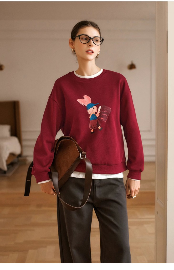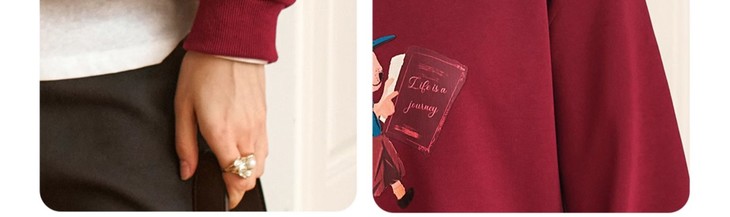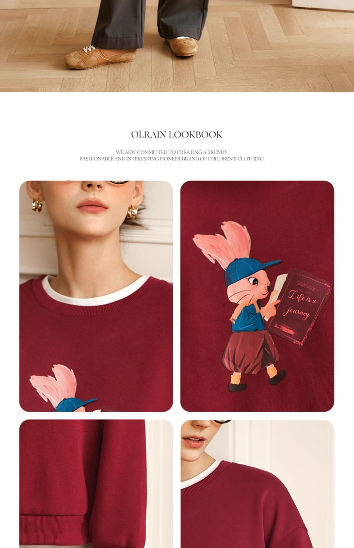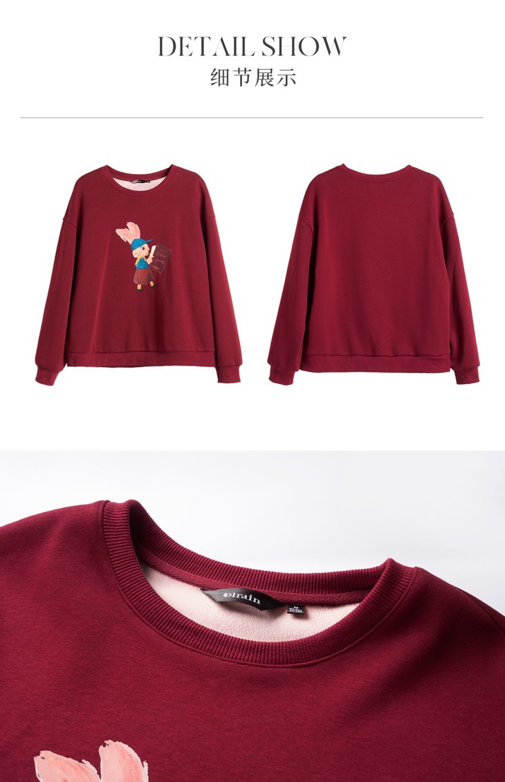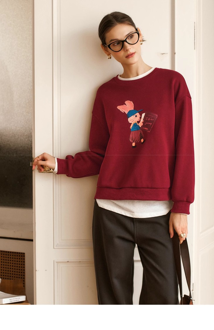 OLrain欧芮儿红色加绒卫衣女冬季2024年新款慵懒风趣味印花套头衫