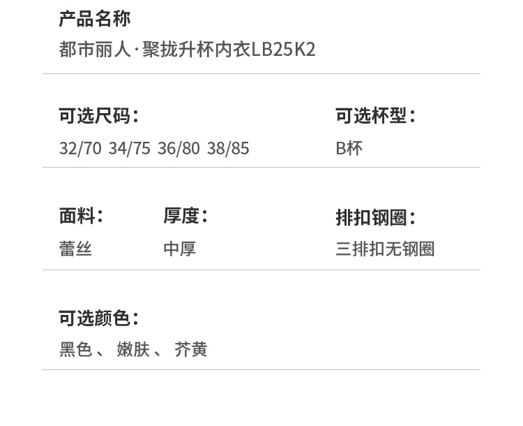 都市丽人聚拢升杯聚拢杯B杯常规内衣蕾丝中厚3/4杯文胸三排扣无钢圈LB25K2