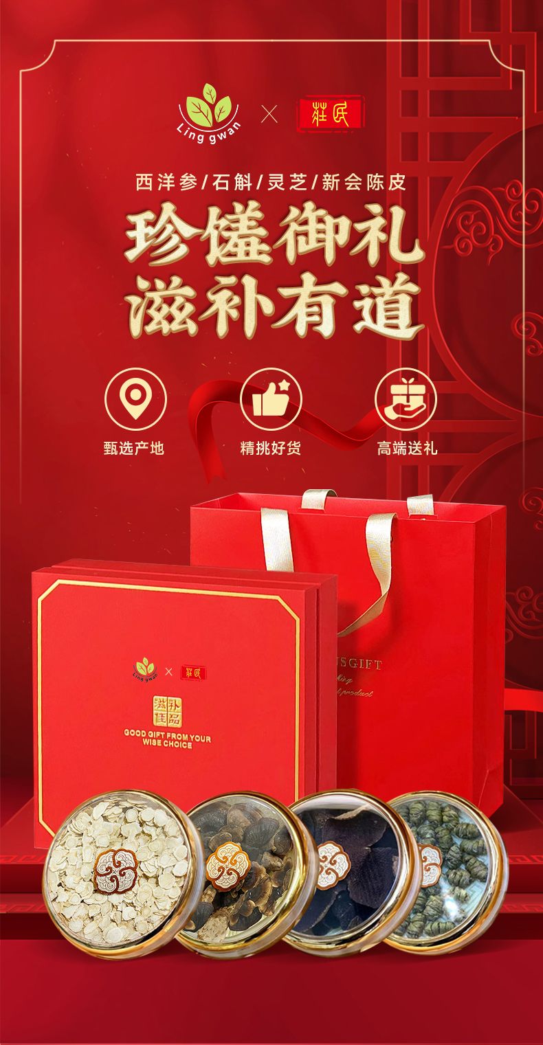 庄民&灵均 滋补礼盒四拼 新会陈皮西洋参灵芝铁皮石斛礼盒 年货送礼