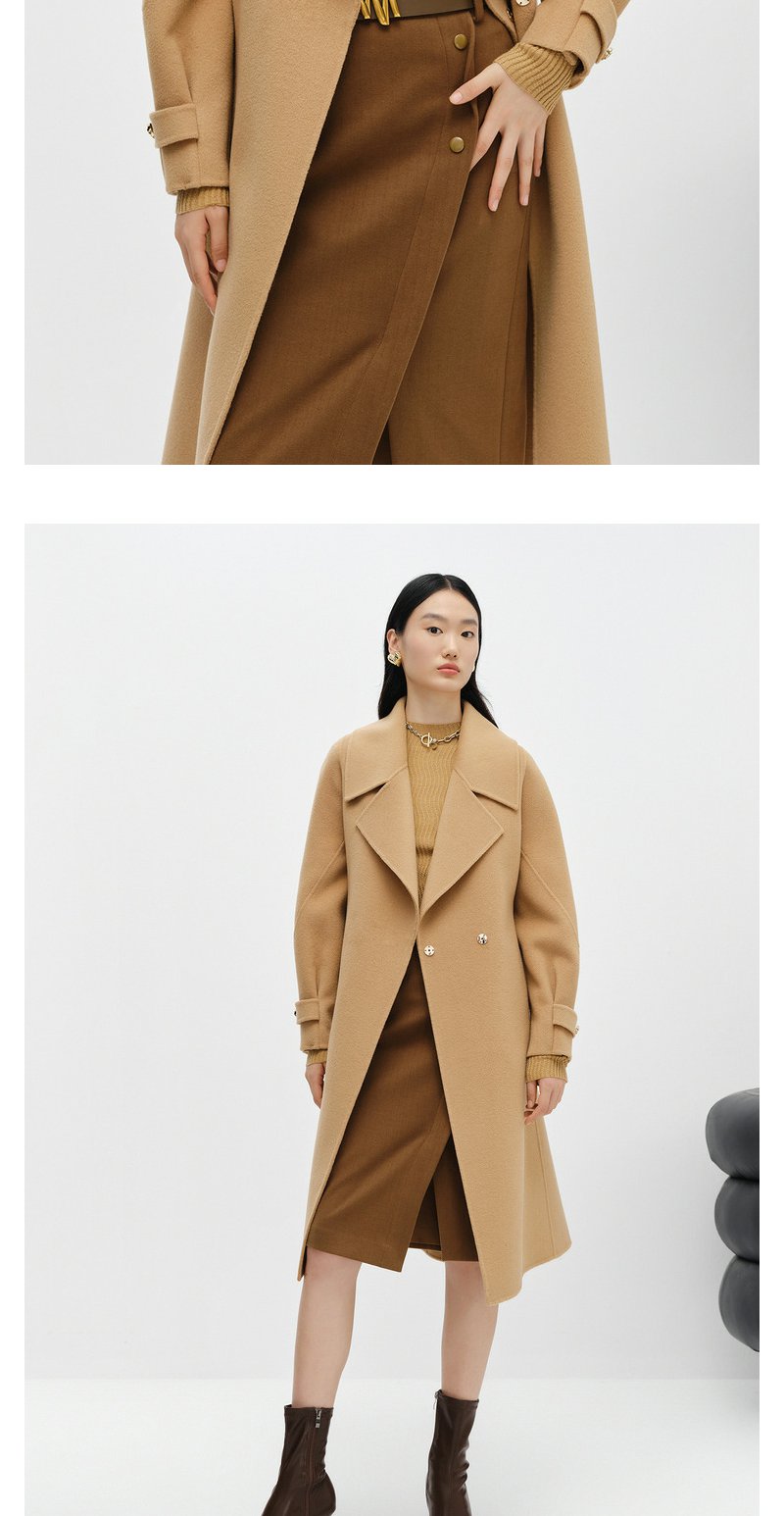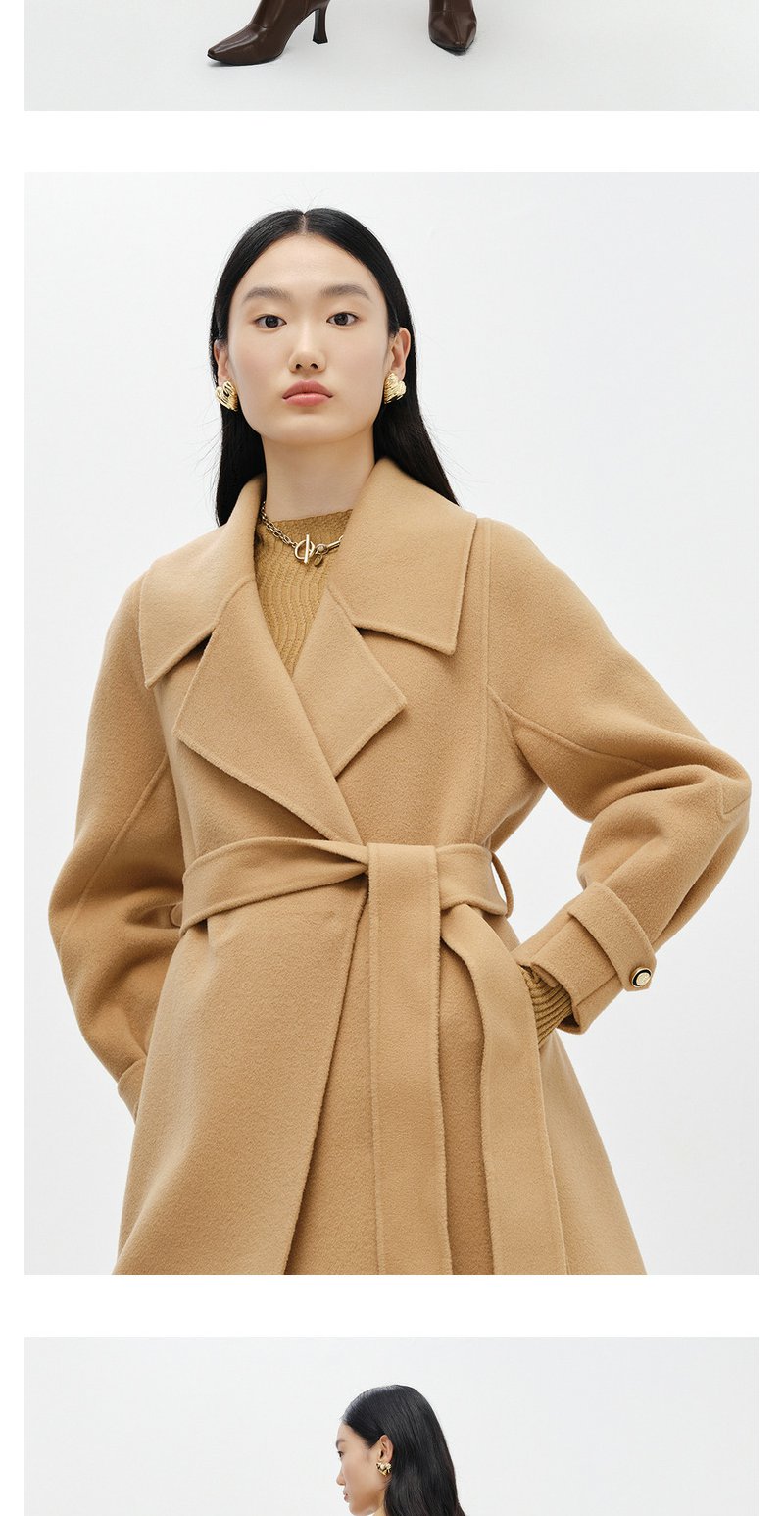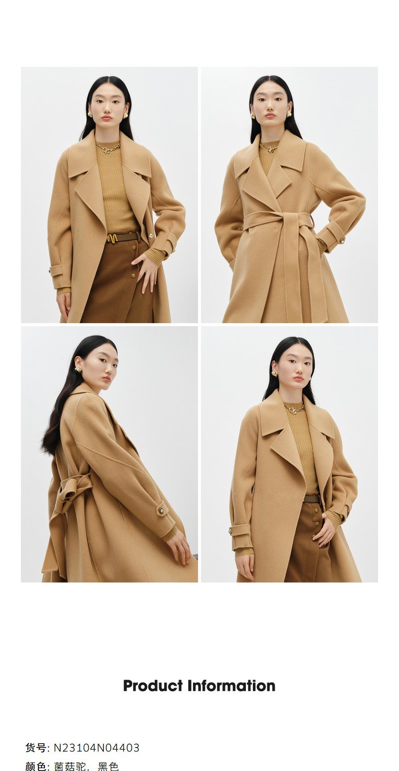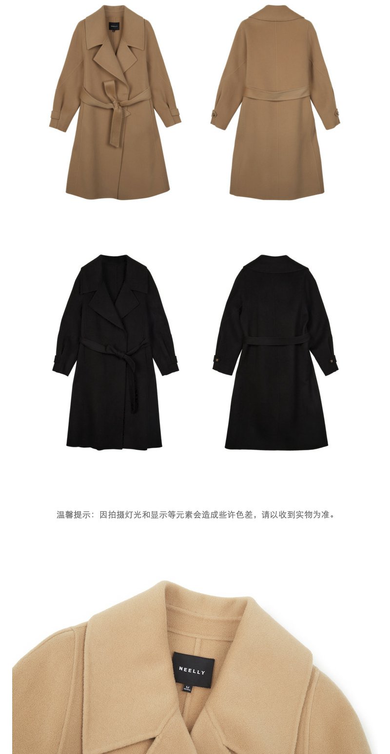NEELLY纳俪商场同款大气翻领双面呢外套女中长款驼色收腰系带大衣N23104N04403