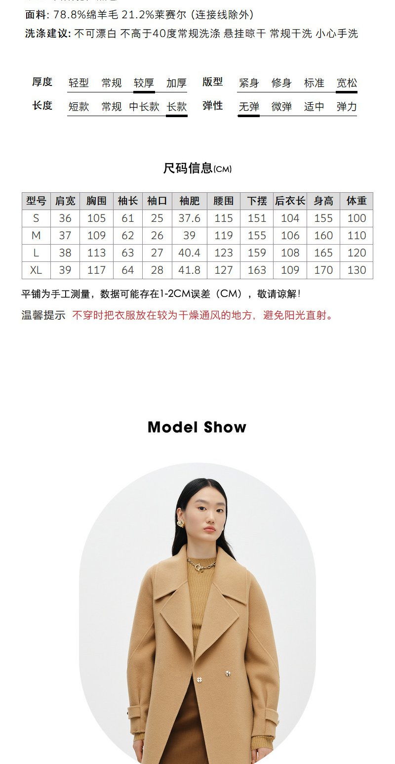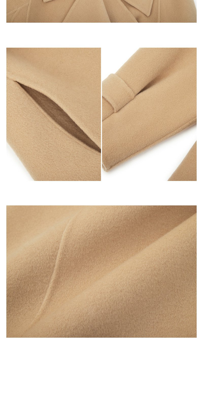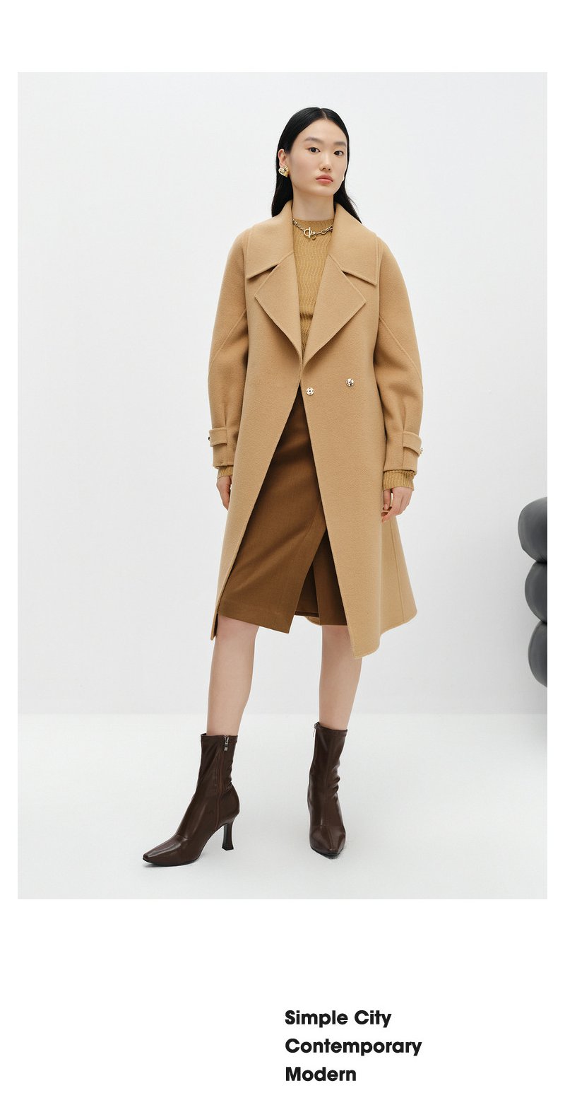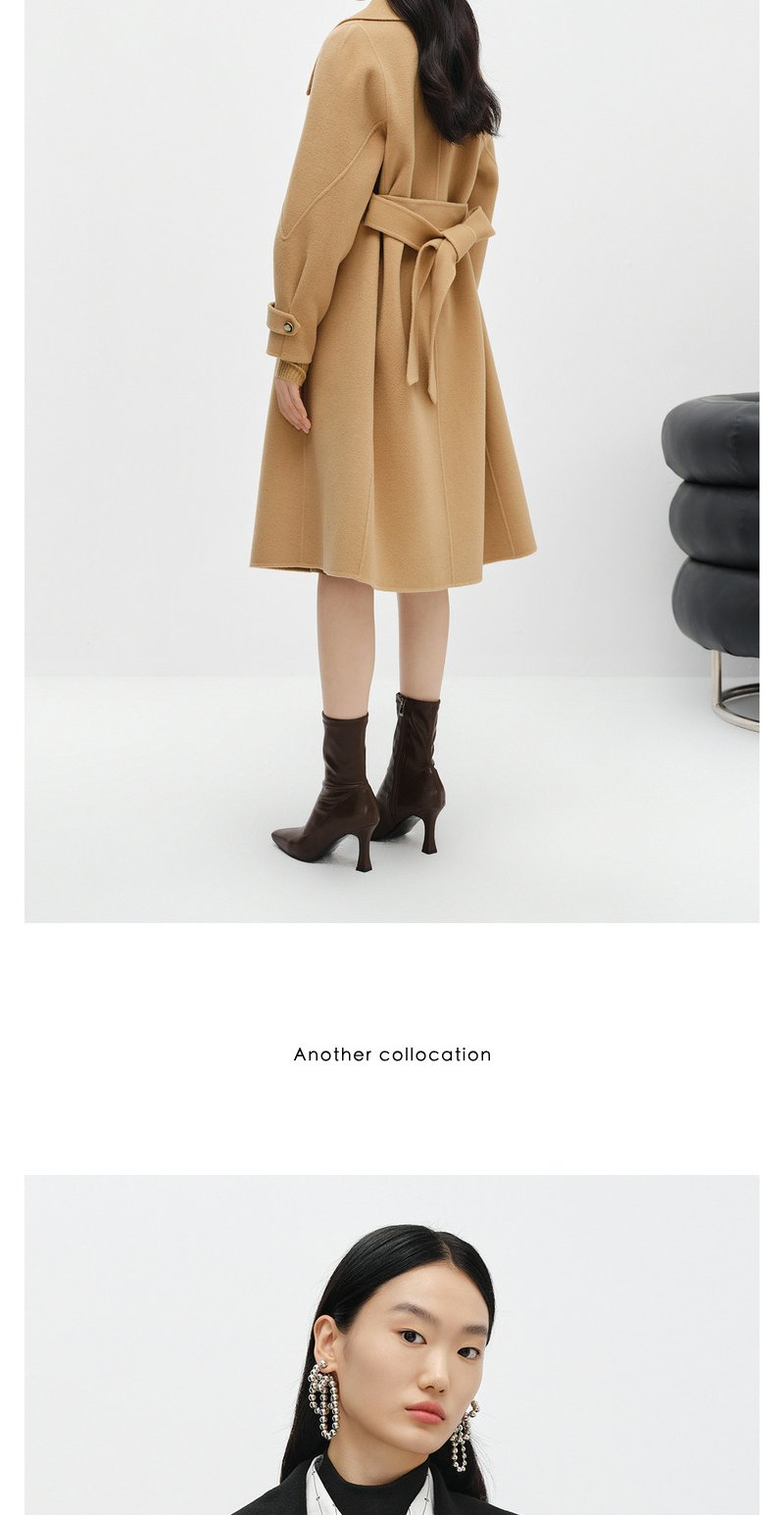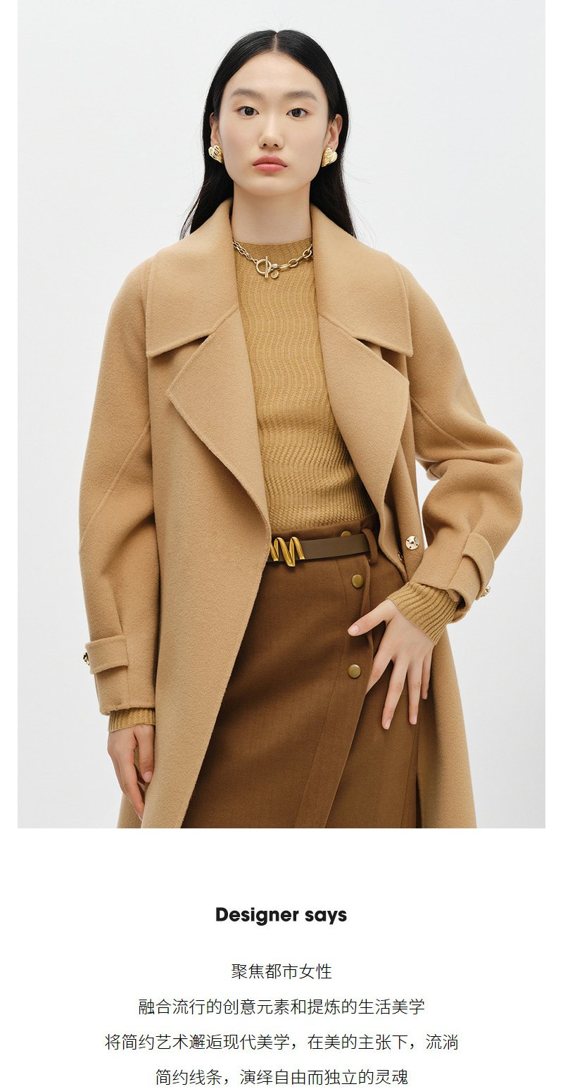 NEELLY纳俪商场同款大气翻领双面呢外套女中长款驼色收腰系带大衣N23104N04403
