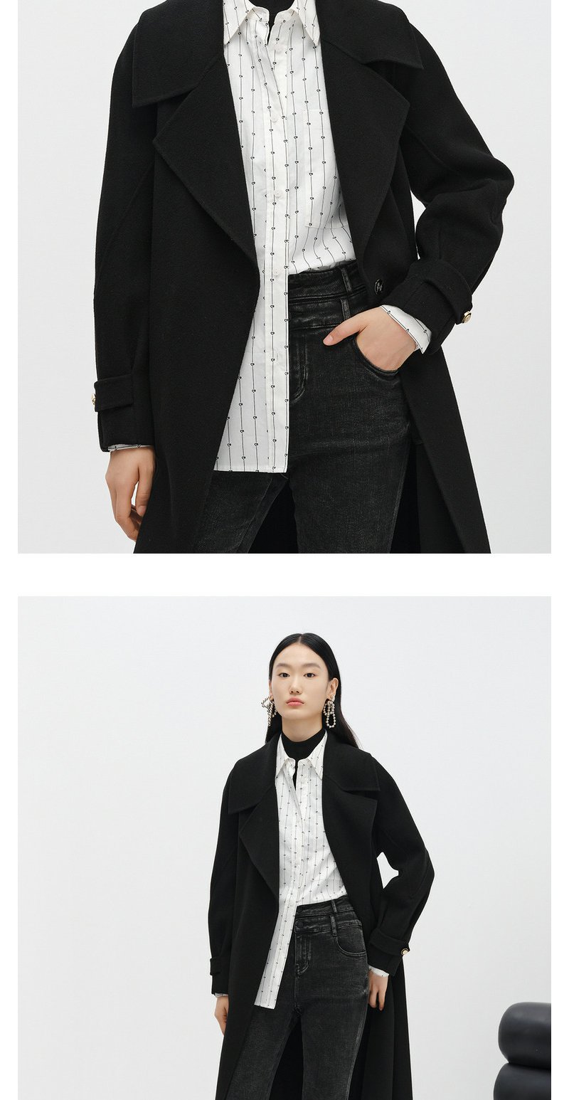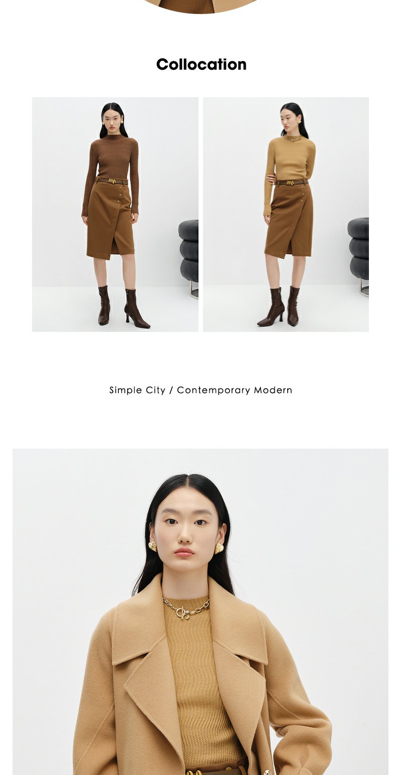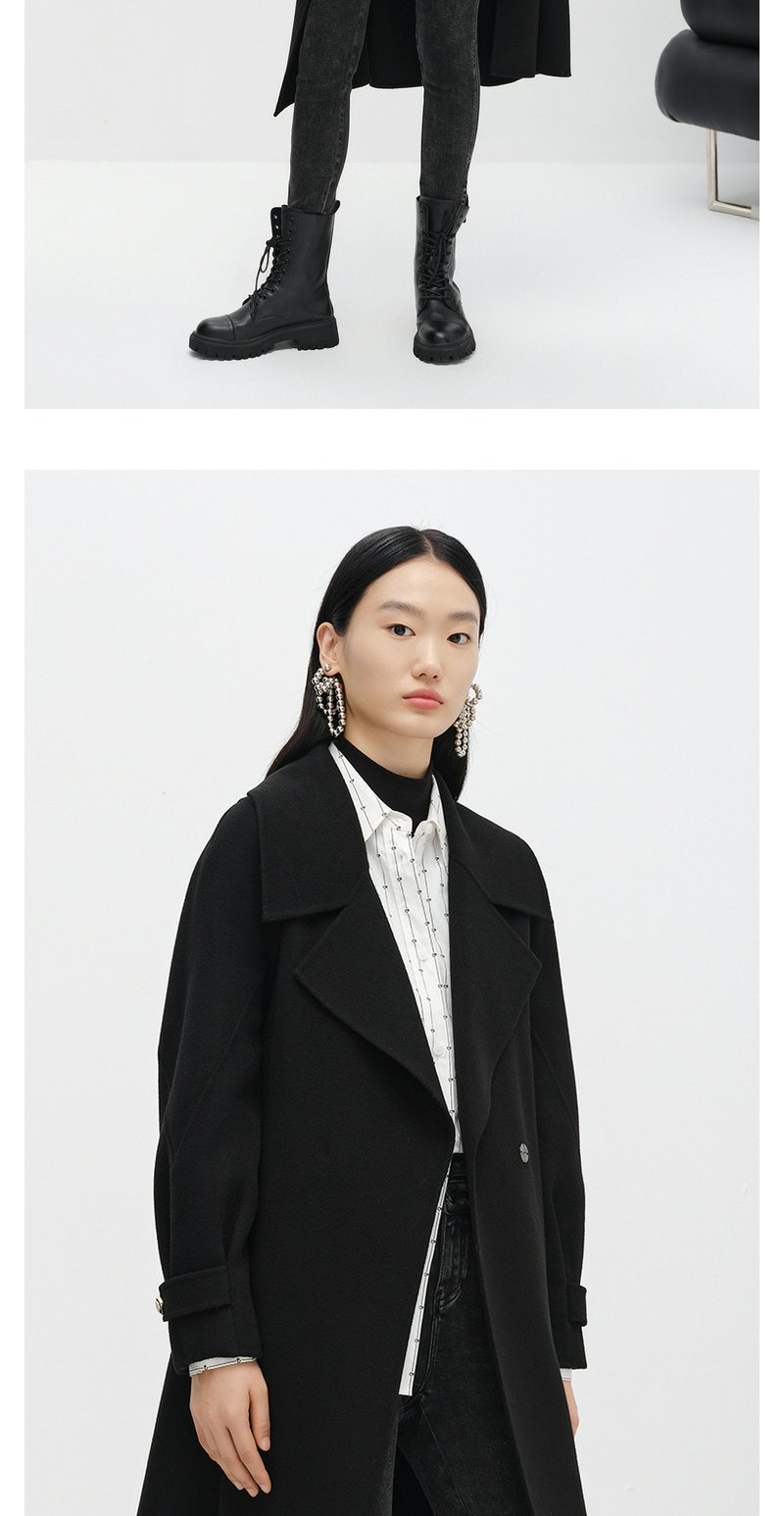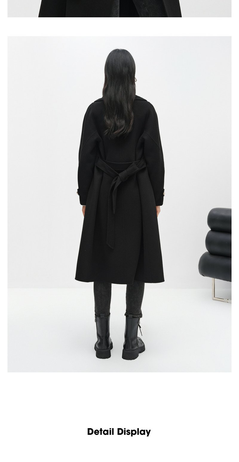 NEELLY纳俪商场同款大气翻领双面呢外套女中长款驼色收腰系带大衣N23104N04403