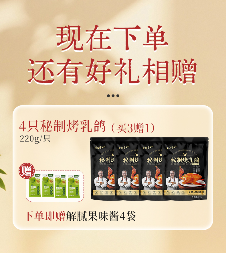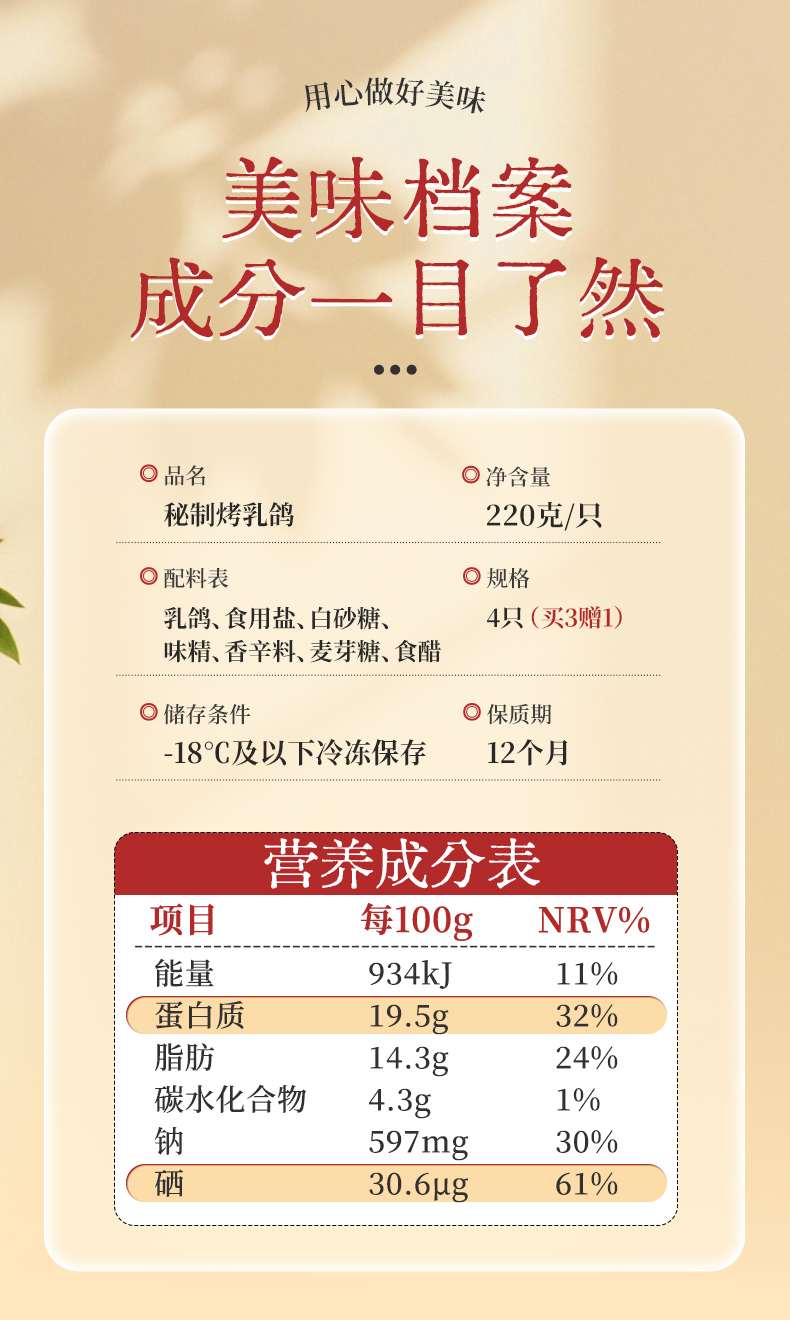 【发出后不支持拦截退货】杨博士 富硒烤乳鸽 220g*4(赠青梅酱*4)
