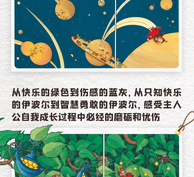 幻+冒险+想象力移植到树上,迷宫、星球、魔镜、天使、怪物相继出现,故事环环相扣,形成完美闭环★从快乐的绿色到伤感的蓝灰,从只知快乐的伊波尔到智慧勇敢的伊波尔,感受主人公自我成长过程中必经的磨砺和忧伤★伊波尔的奶奶去世了,伊波尔伤心之余,打败了怪物,在勇敢之旅中回到了自己的家乡,这既是伊波尔的勇敢书,也是伊波尔克服恐惧的生命之书。★法国想象力图画书大师旁帝创意之作,文字和图画充满奇趣:每个画面都充满悬念,每个故事都奇思妙想