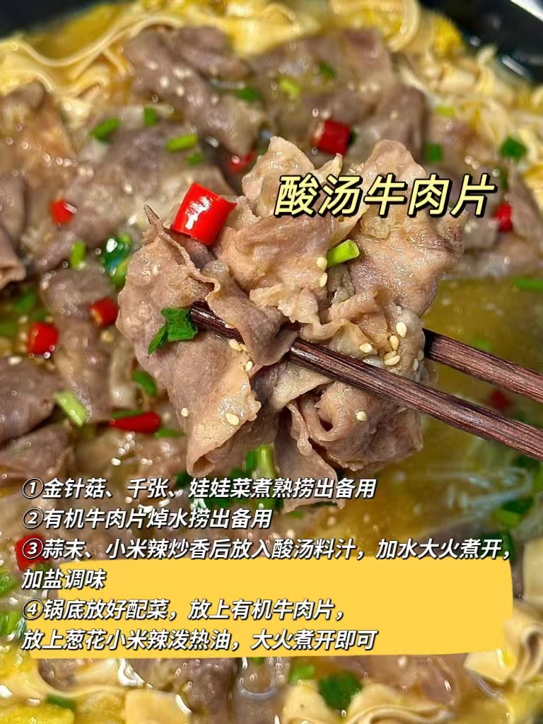 准备食材:有机牛肉片、金针菇、千张、娃娃菜、酸汤料汁做法:①金针菇、千张、娃娃菜煮熟捞出备用②有机牛肉片焯水捞出备用③蒜末、小米辣炒香后放入酸汤料汁,加水大火煮开,加盐调味④锅底放好配菜,放上有机牛肉片,放上葱花小米辣泼热油,大火煮开即可