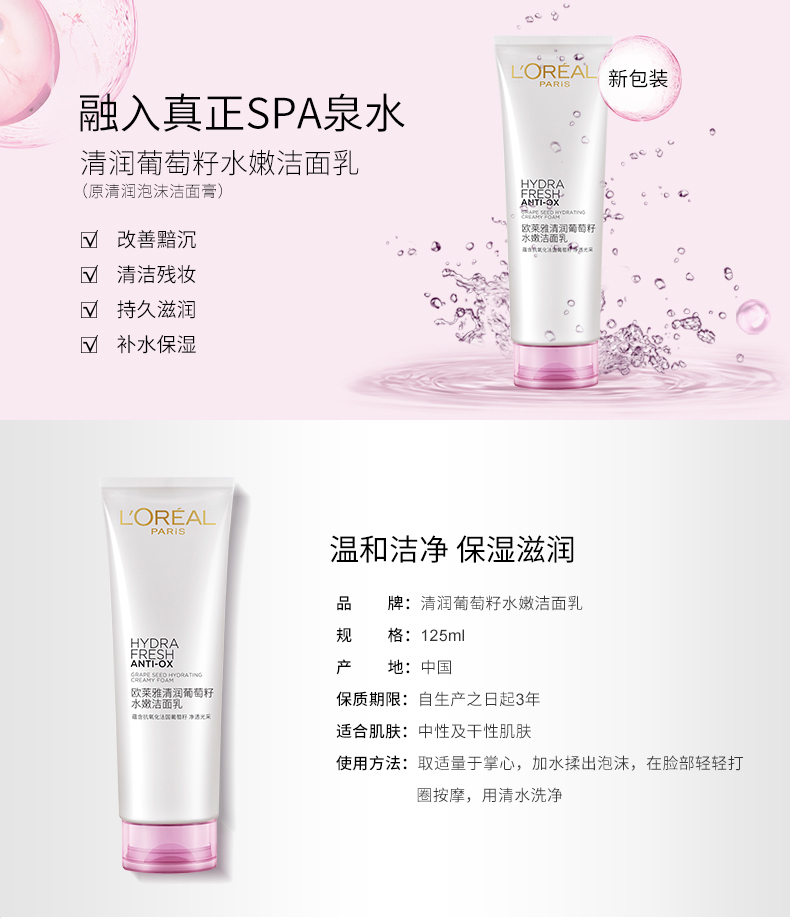 欧莱雅清润葡萄籽水嫩洁面乳 原价110元