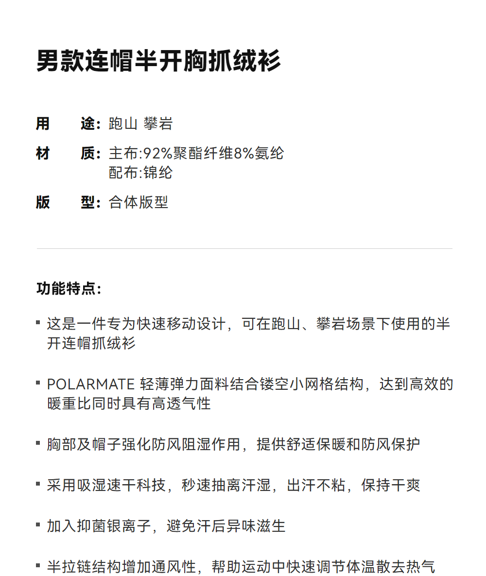 KAILAS凯乐石 户外运动 男款连帽半开胸抓绒衫 KG2437122【Z】