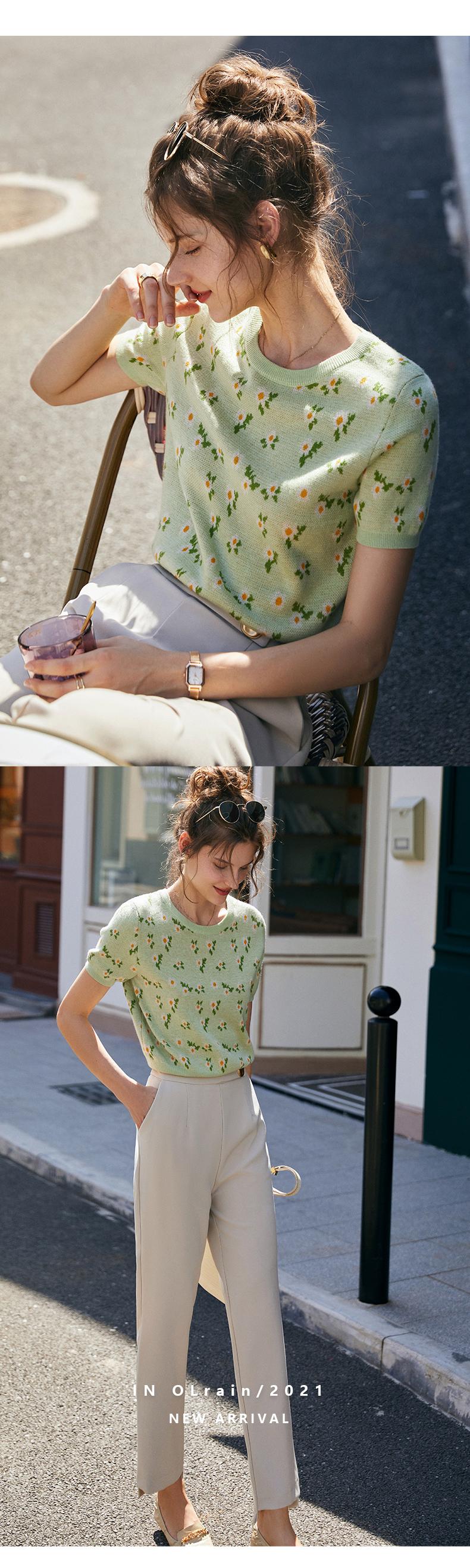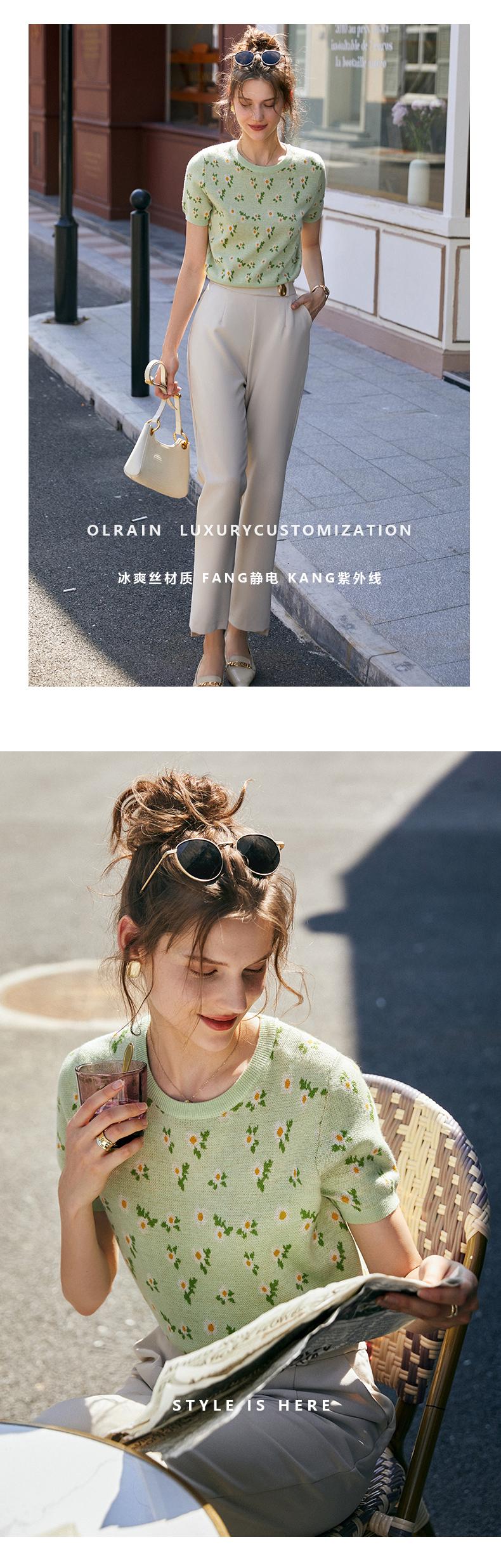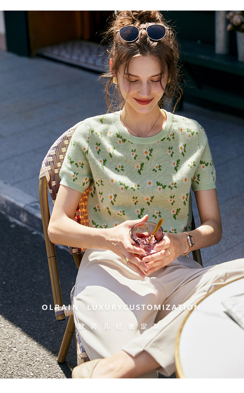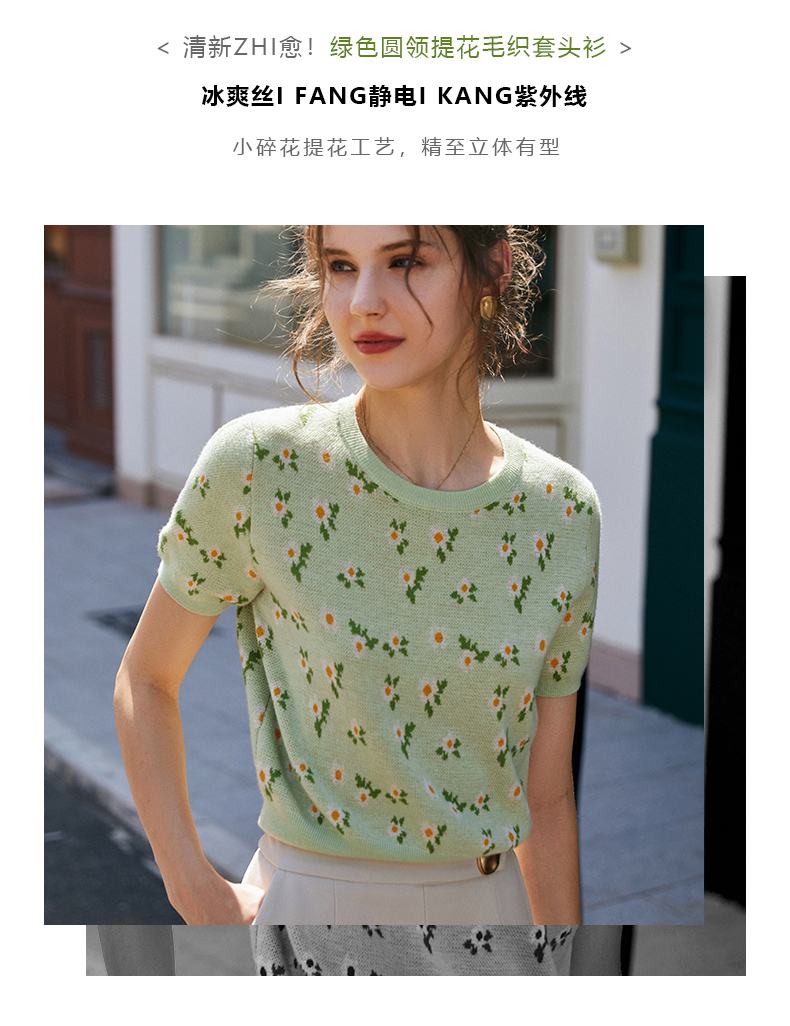 欧芮儿绿色针织衫女2021新短袖显瘦气质圆领提花冰丝薄款上衣