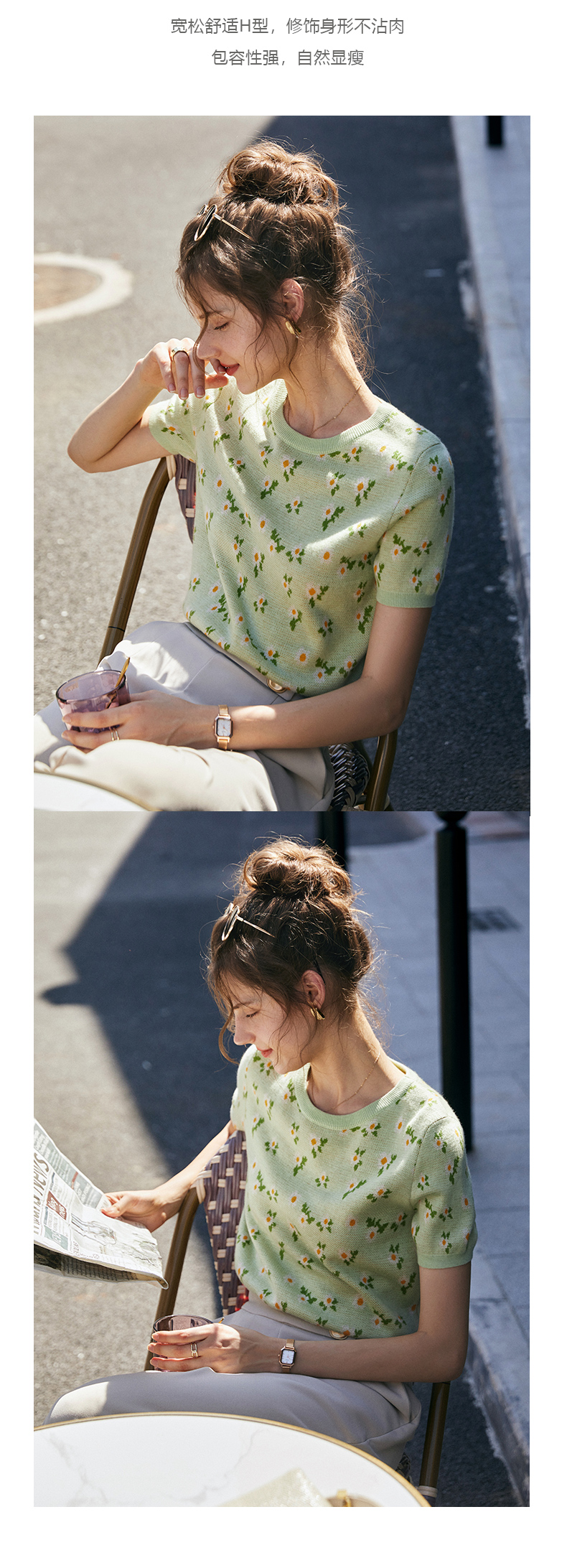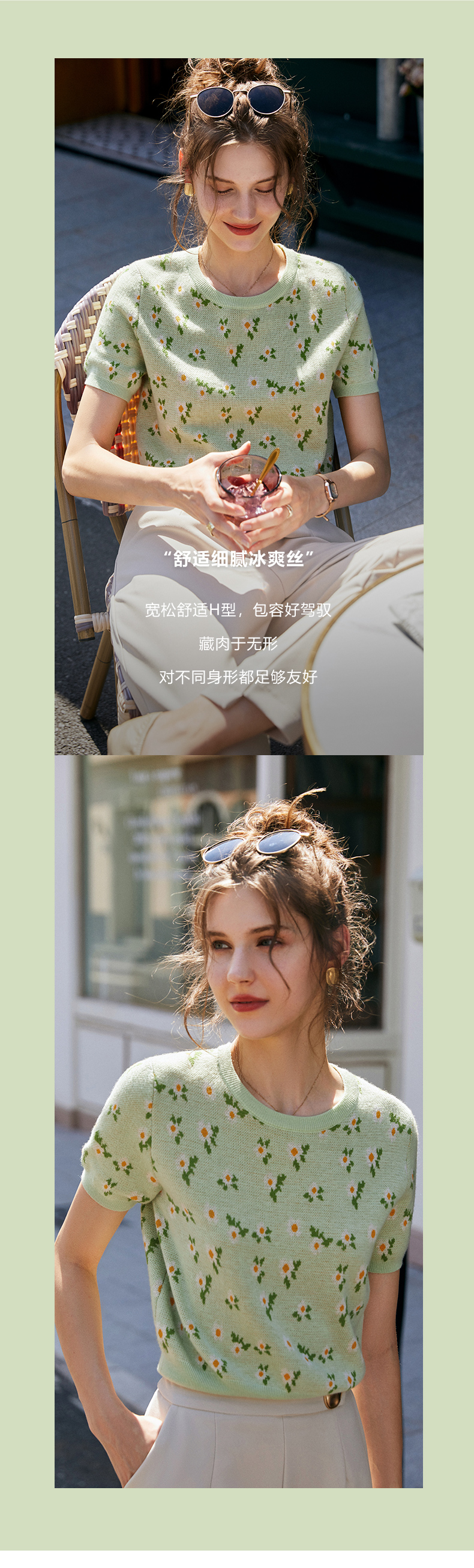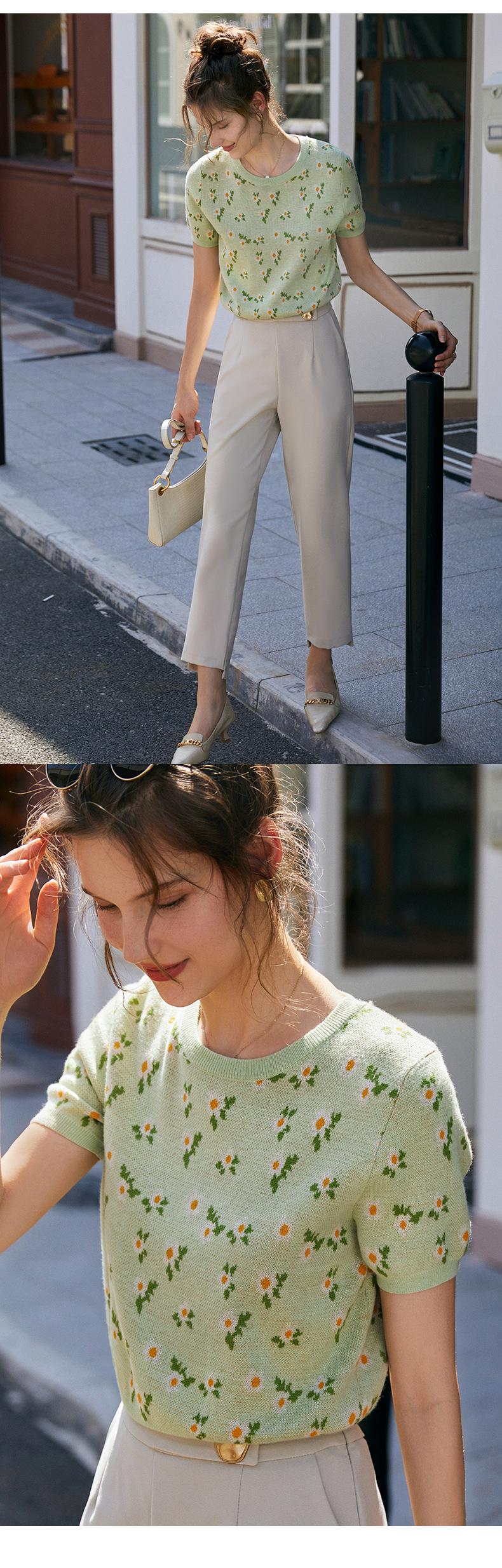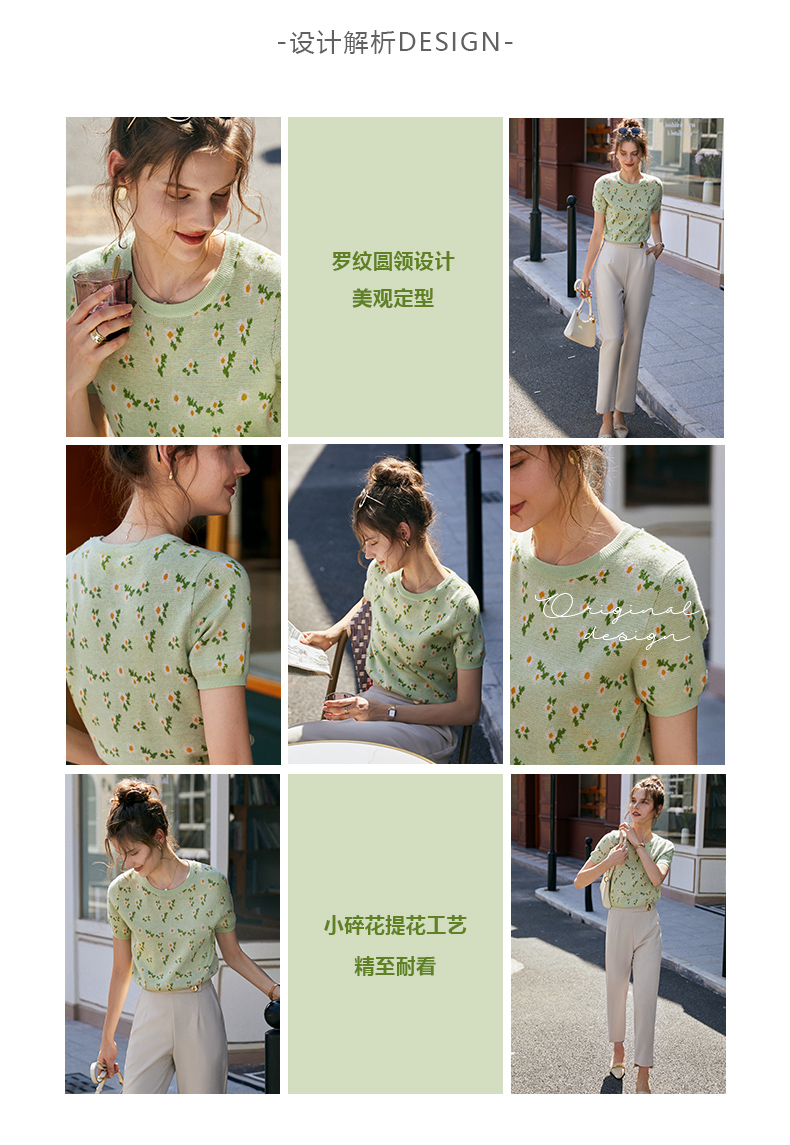 欧芮儿绿色针织衫女2021新短袖显瘦气质圆领提花冰丝薄款上衣