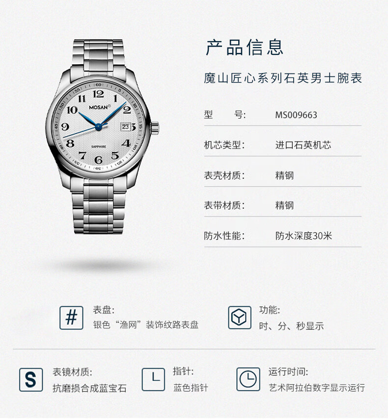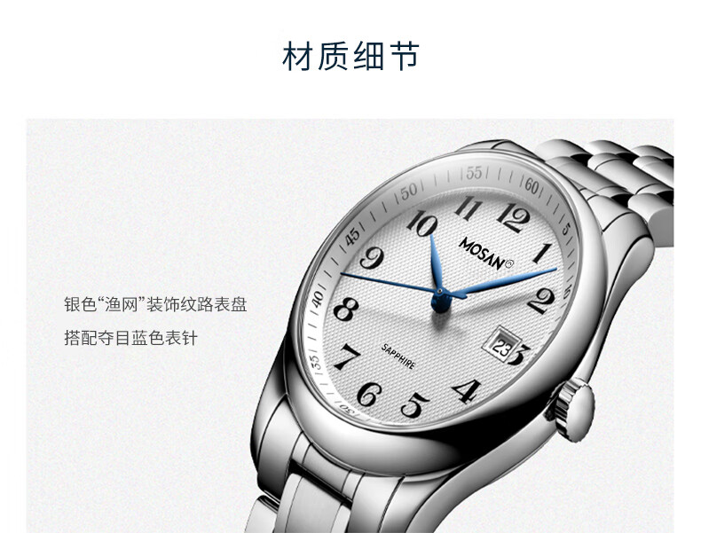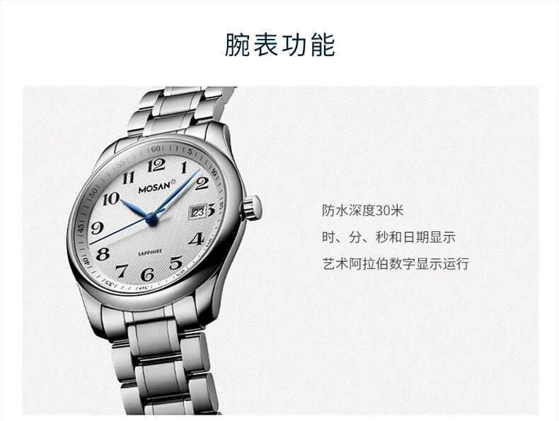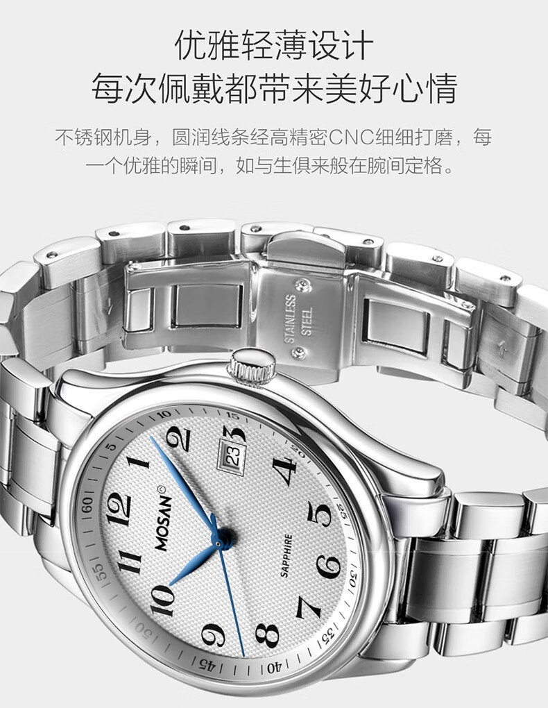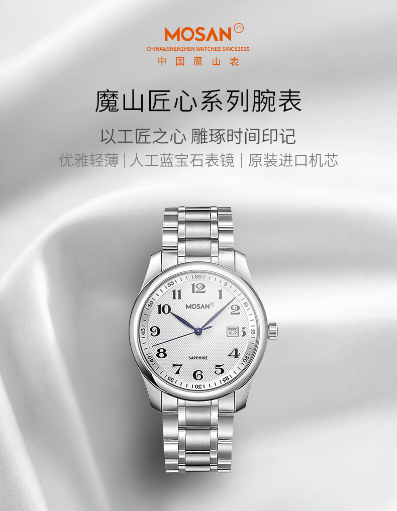 魔山(MOSAN)情侣石英表防水男款手表MS009663 白面钢带石英表 40mm