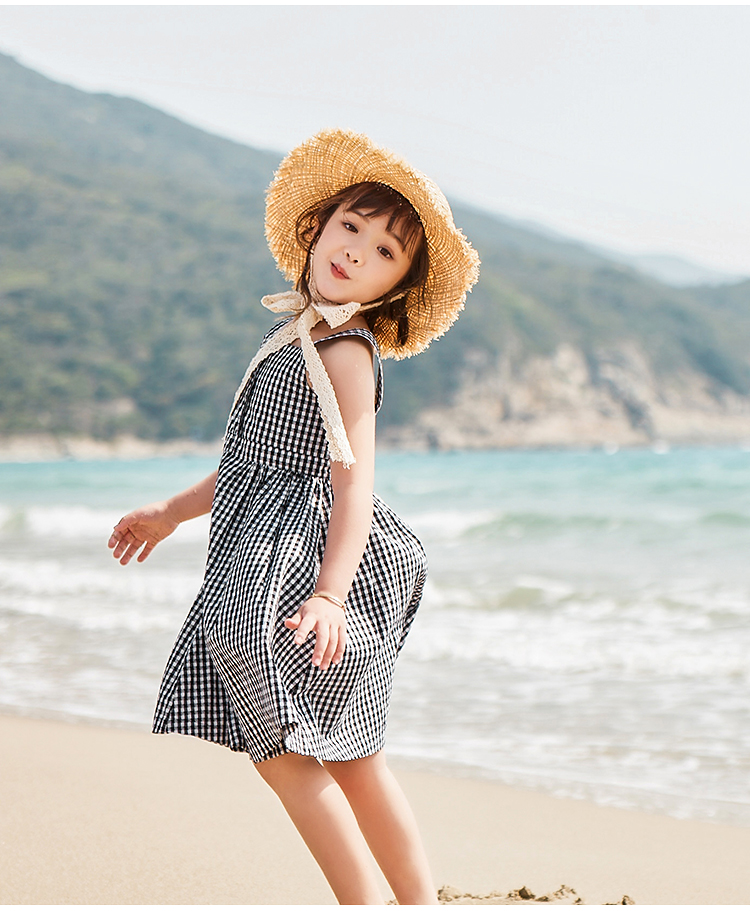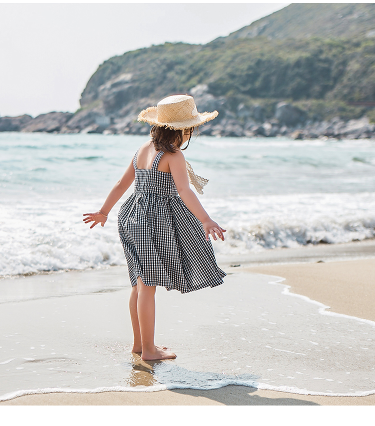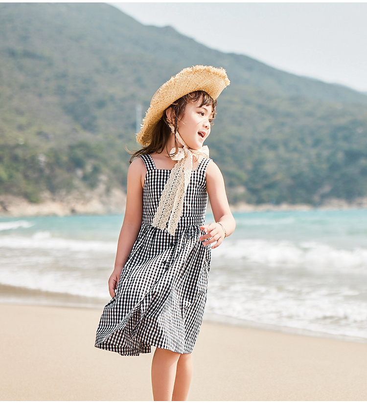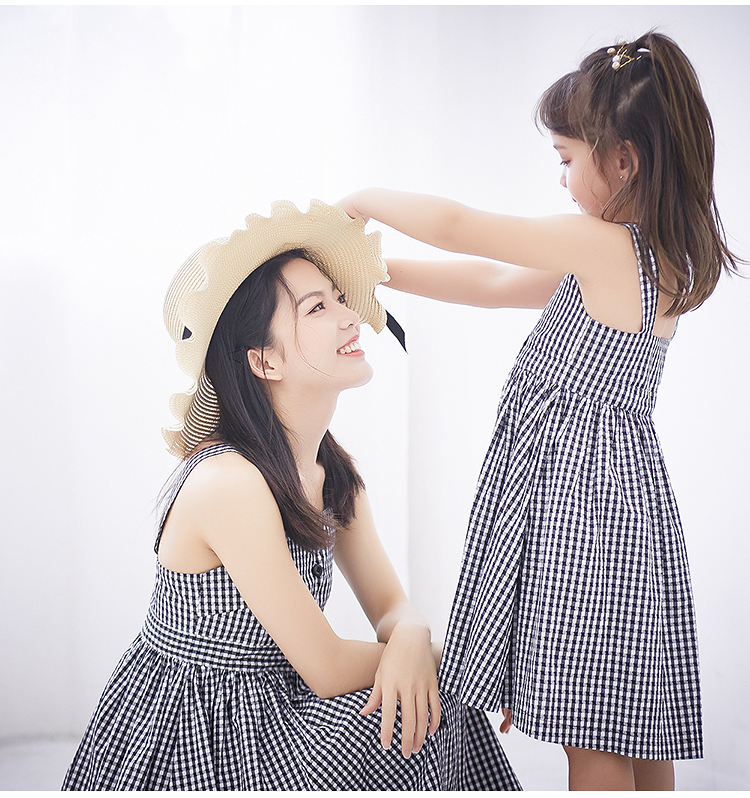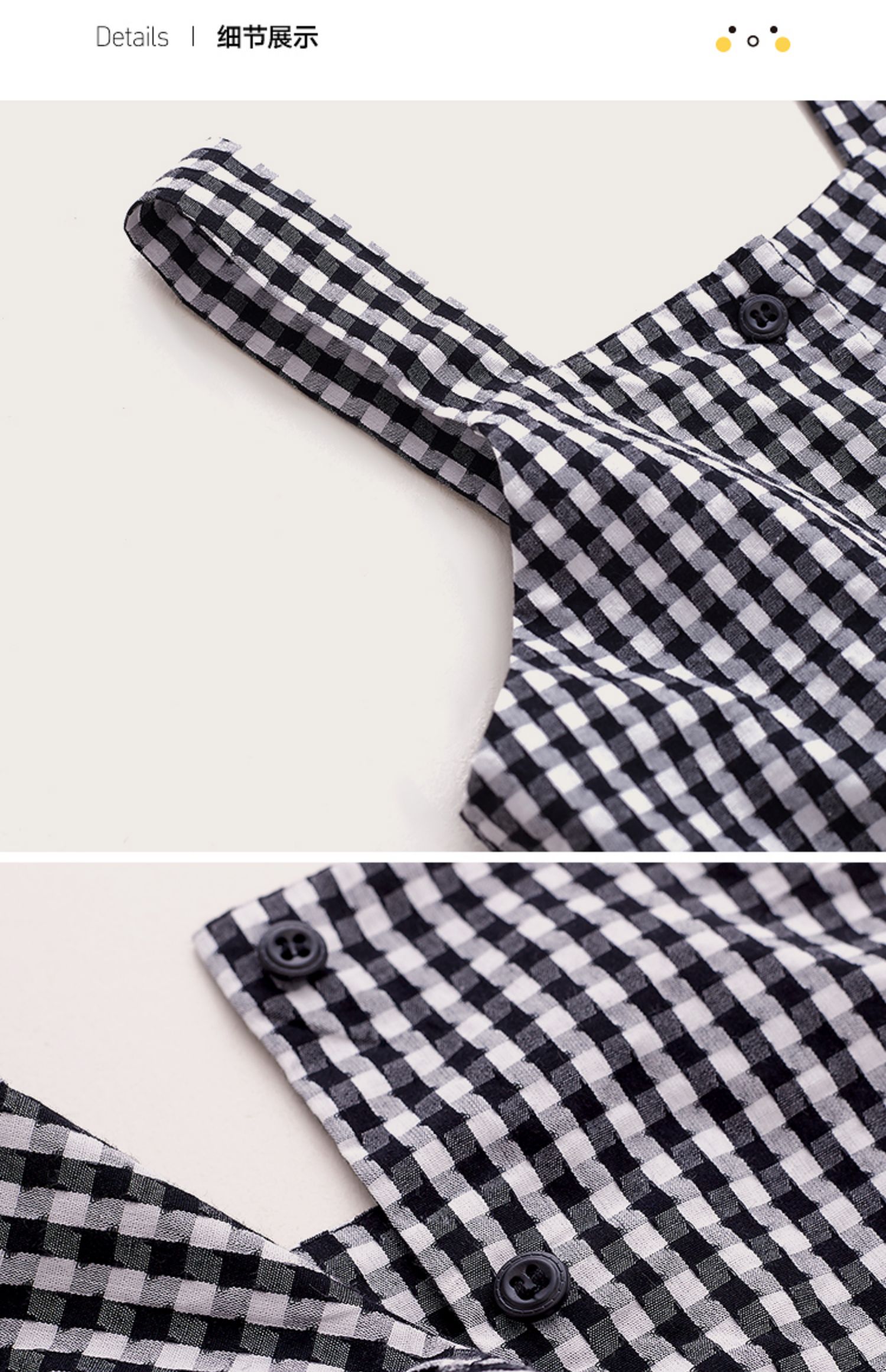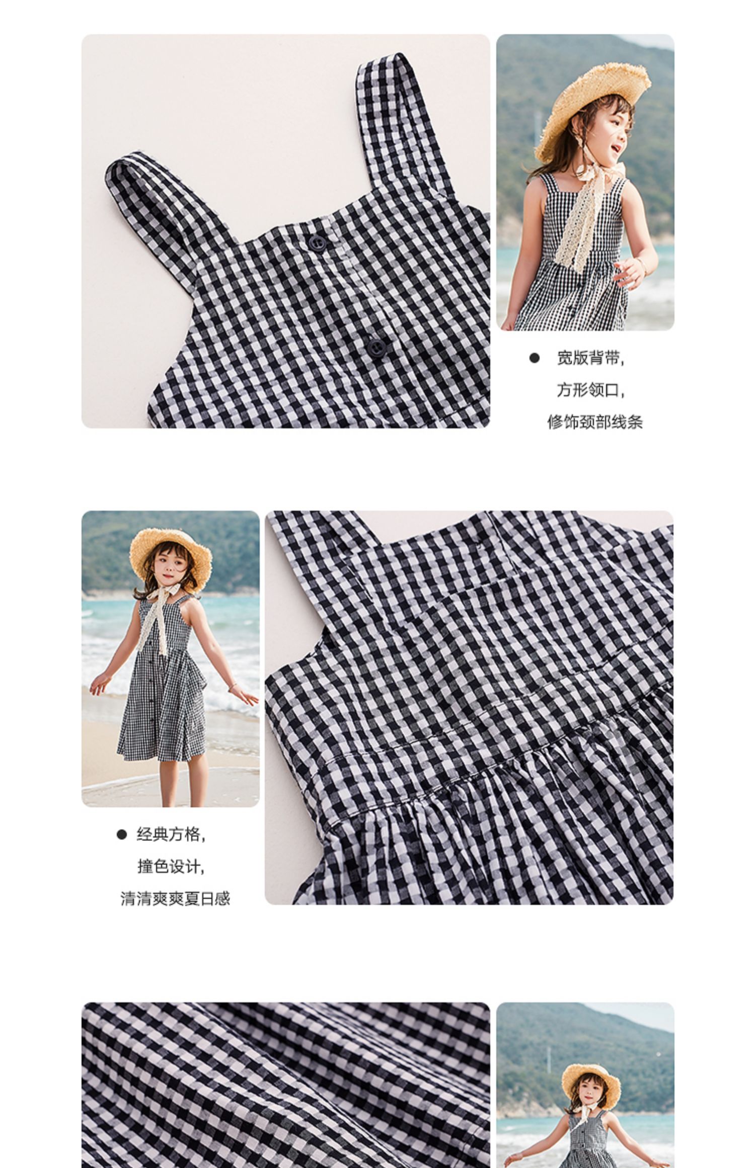 littletime童装春夏黑白女童亲子款复古格子洋气吊带裙连衣裙