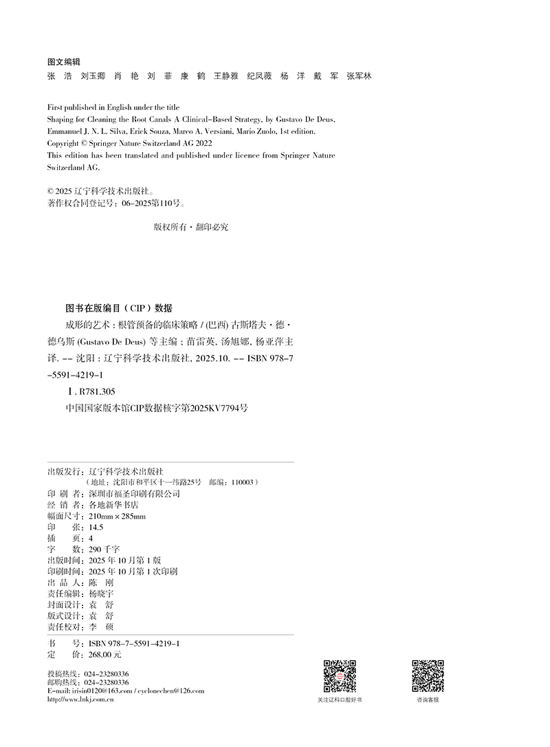 本书由国际知名的巴西牙髓病学专家团队编写,系统阐述了根管预备的理论基础、技术演进及临床应用,重点探讨了清理和成形的辩证关系。全书不仅涵盖了传统与现代根管预备技术的比较,还基于循证研究,详细分析了不同器械系统在清理效率、形态保持与微创性方面的优劣。通过科学数据和临床病例,本书引导读者在不同解剖结构与感染程度下,优化根管预备策略,在清理彻底性与牙体组织保存之间找到最佳平衡点,从而提高治疗成功率。