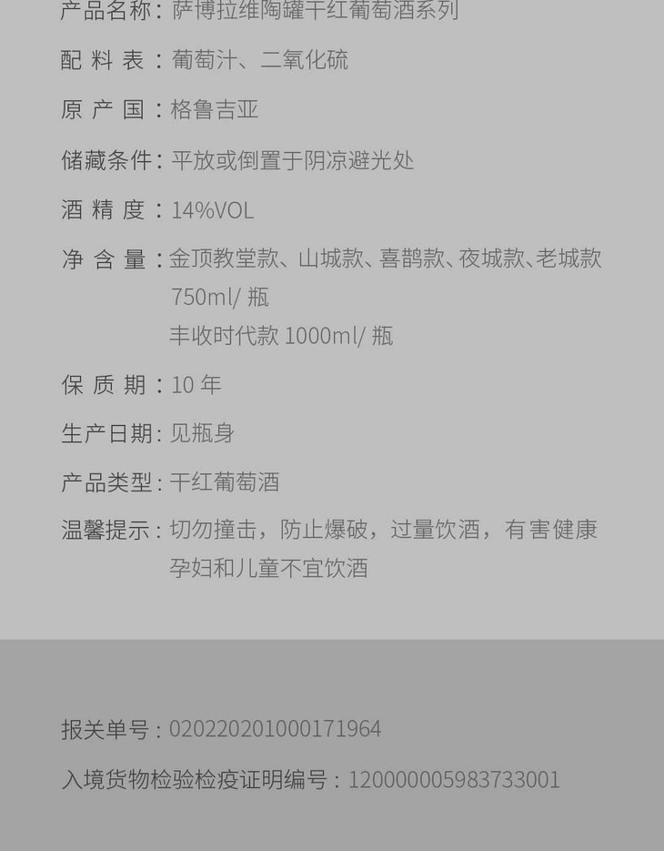 萨博拉维陶罐红葡萄酒750ml/非遗陶罐法酿造