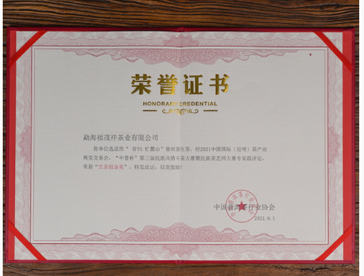荣获2021年“中普杯”斗茶大赛“生茶组金奖”由中国普洱茶协会颁发认证