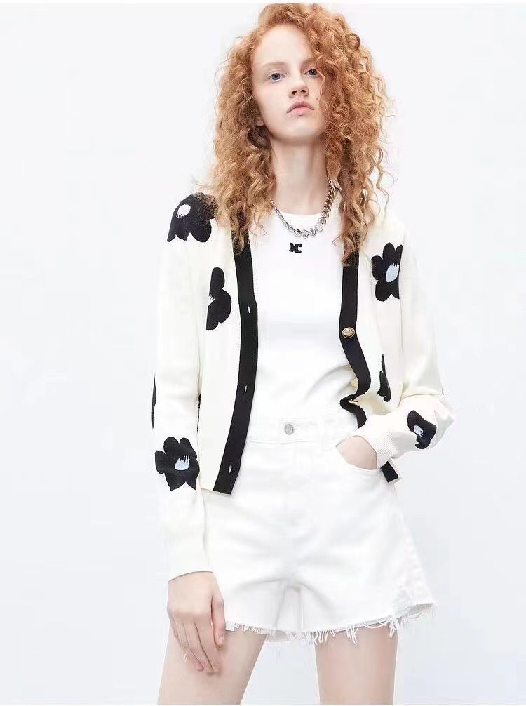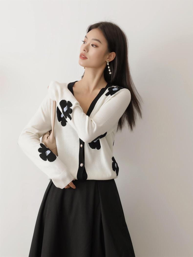 130#🔥🔥🔥 【新款】时尚撞色V领花朵图案缇花针织衫开衫🌹🌹 100%羊毛 颜色:白色 码数:ML