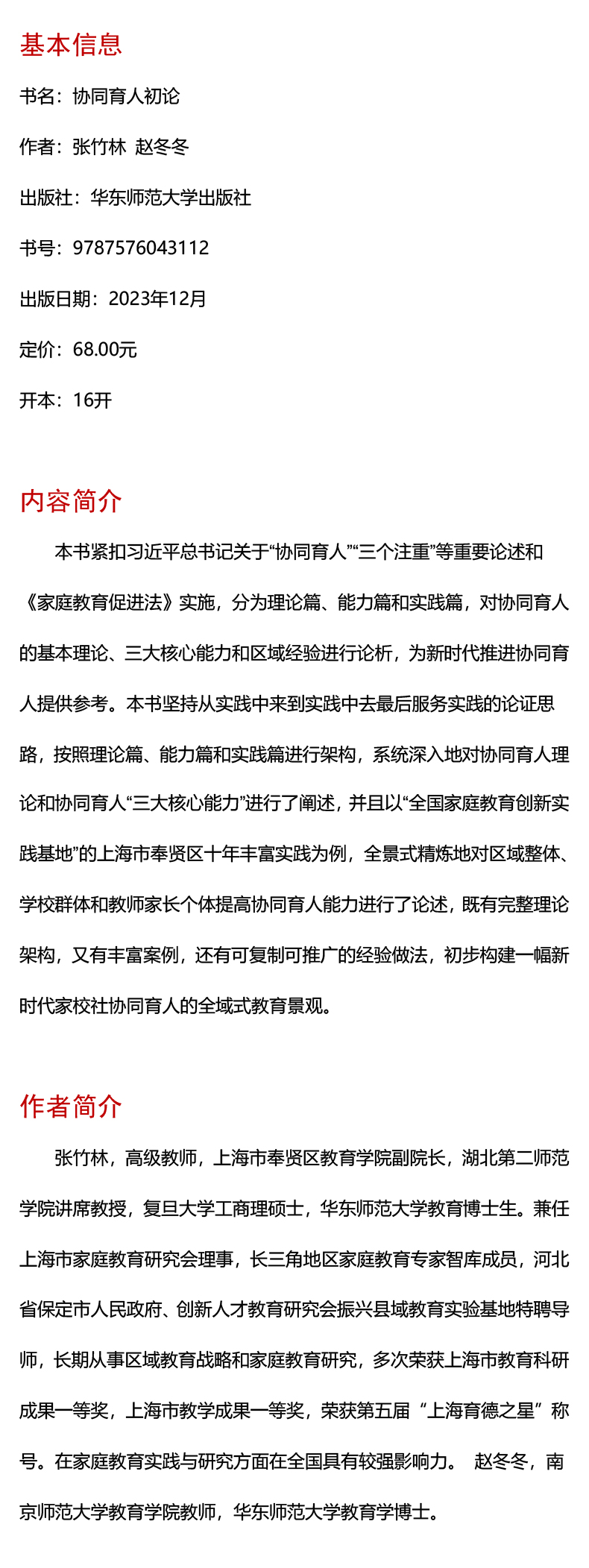 本书紧扣习近平总书记关于“协同育人”“三个注重”等重要论述和《家庭教育促进法》实施,分为理论篇、能力篇和实践篇,对协同育人的基本理论、三大核心能力和区域经验进行论析,为新时代推进协同育人提供参考。本书坚持从实践中来到实践中去最后服务实践的论证思路,按照理论篇、能力篇和实践篇进行架构,系统深入地对协同育人理论和协同育人“三大核心能力”进行了阐述,并且以“全国家庭教育创新实践基地”的上海市奉贤区十年丰富实践为例,全景式精炼地对区域整体、学校群体和教师家长个体提高协同育人能力进行了论述,既有完整理论架构,又有丰富案例,还有可复制可推广的经验做法,初步构建一幅新时代家校社协同育人的全域式教育景观。