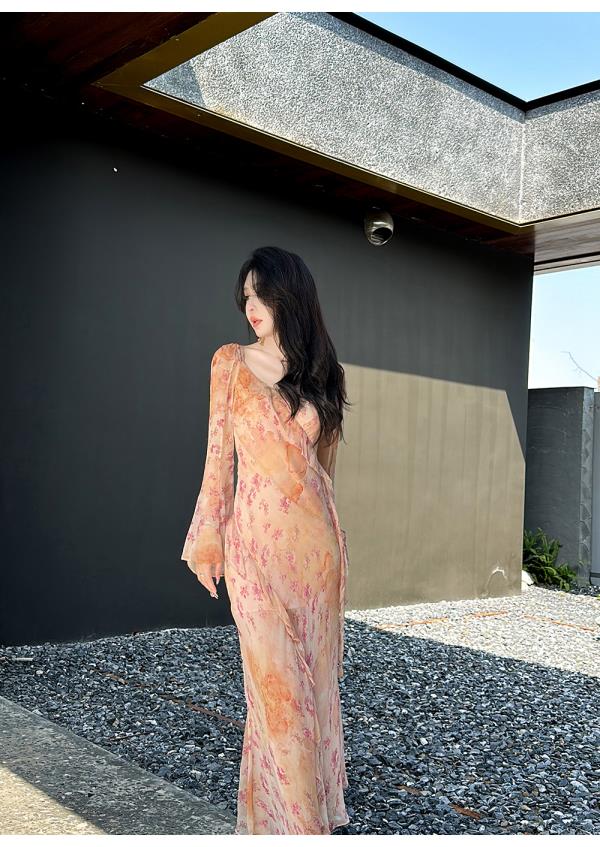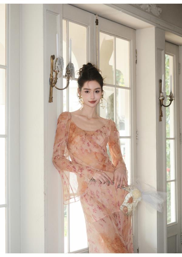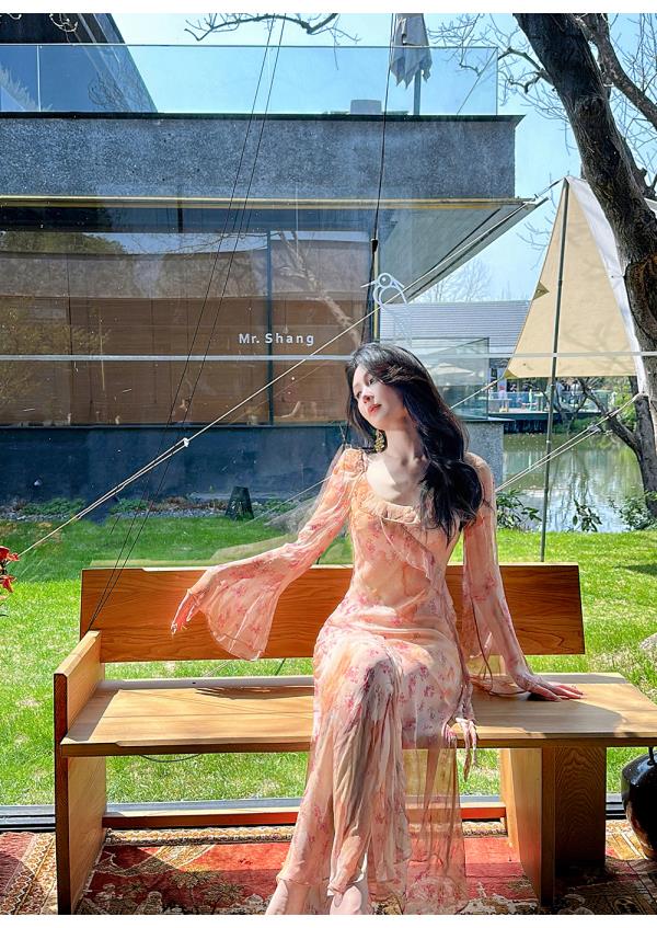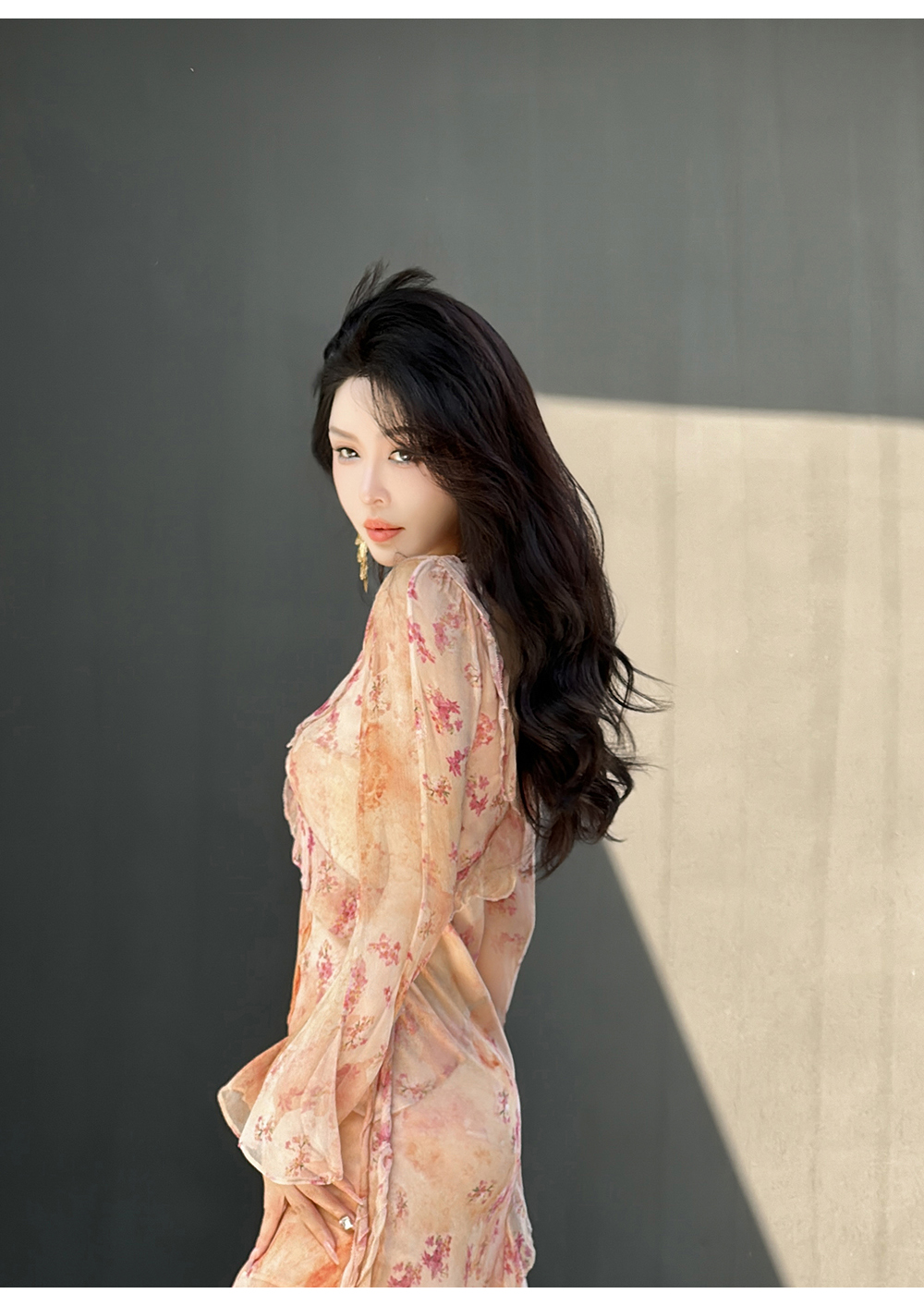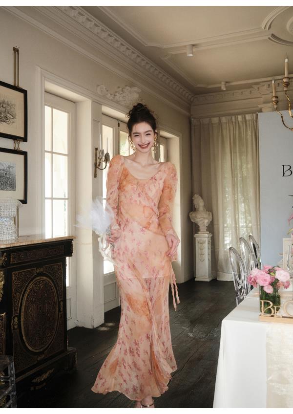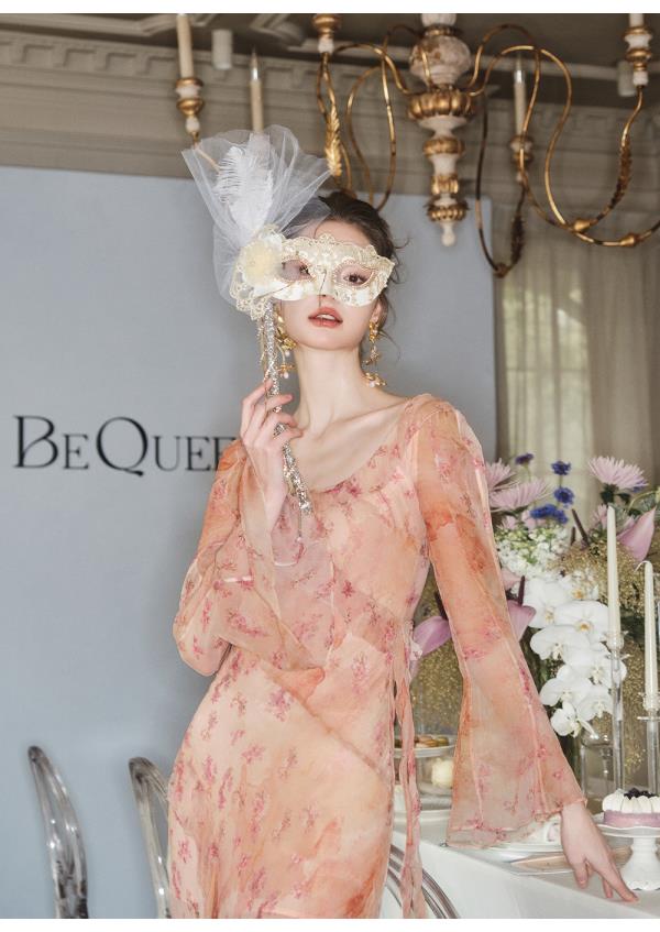 余潇潇【沙丘玫瑰】设计感定制乔其纱印花荷叶边收腰连衣裙