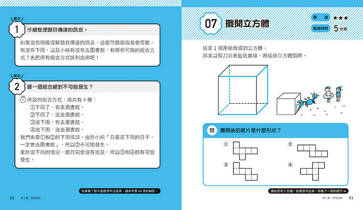 特色2. 超強邏輯思維訓練:每題只有5分鐘解題時間,題目後皆有解題的邏輯思維關鍵提示,適時幫助孩子打通思考盲點,享受動腦思索後豁然開朗的成就感!