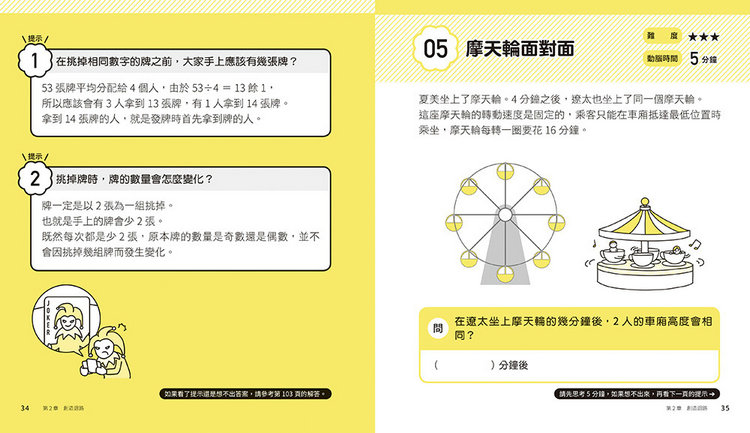 全書依照5大思考迴路分為5個章節,收錄35題多元有趣的題型,每題只有5分鐘解題時間,題目之後提供指引思考方向的提示,讓孩子有效率的從理解題目開始,靈活運用5種思考迴路解題,解題的同時也是鍛練自己的邏輯思維能力。