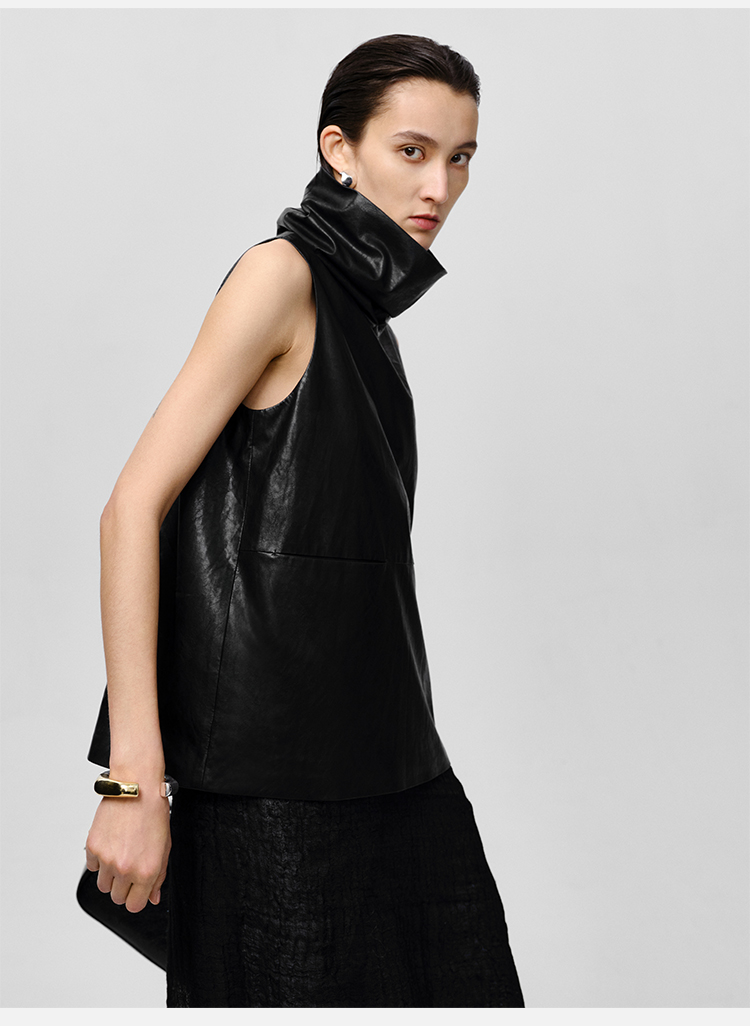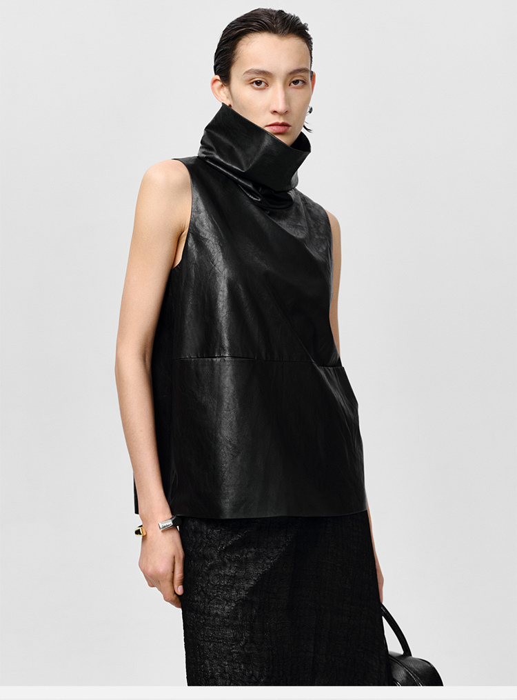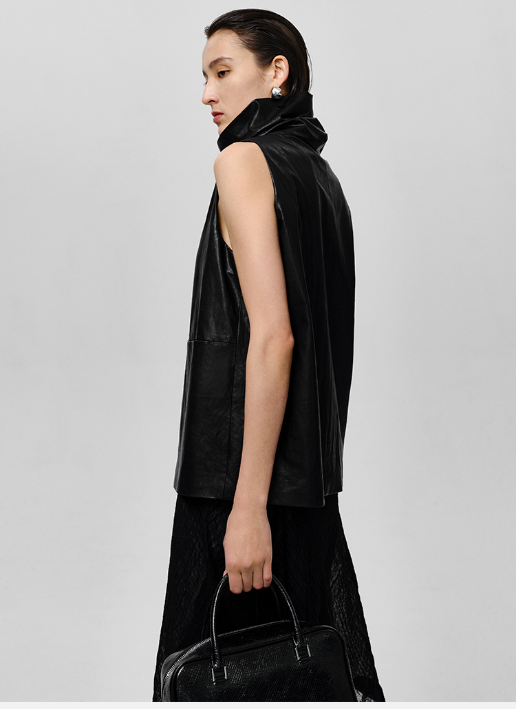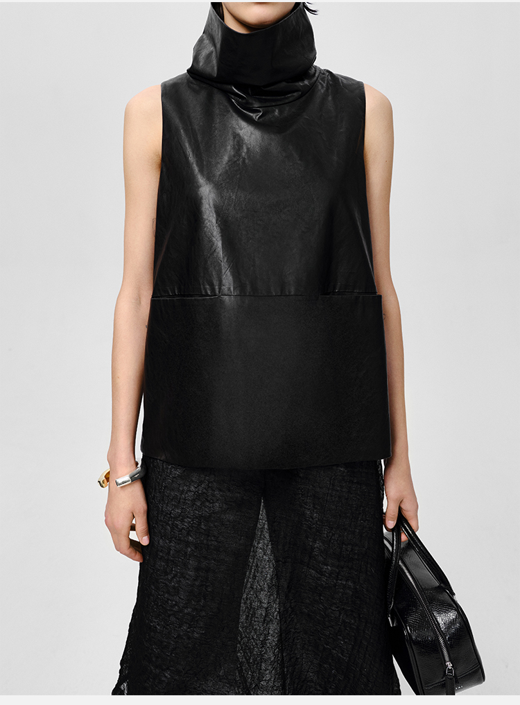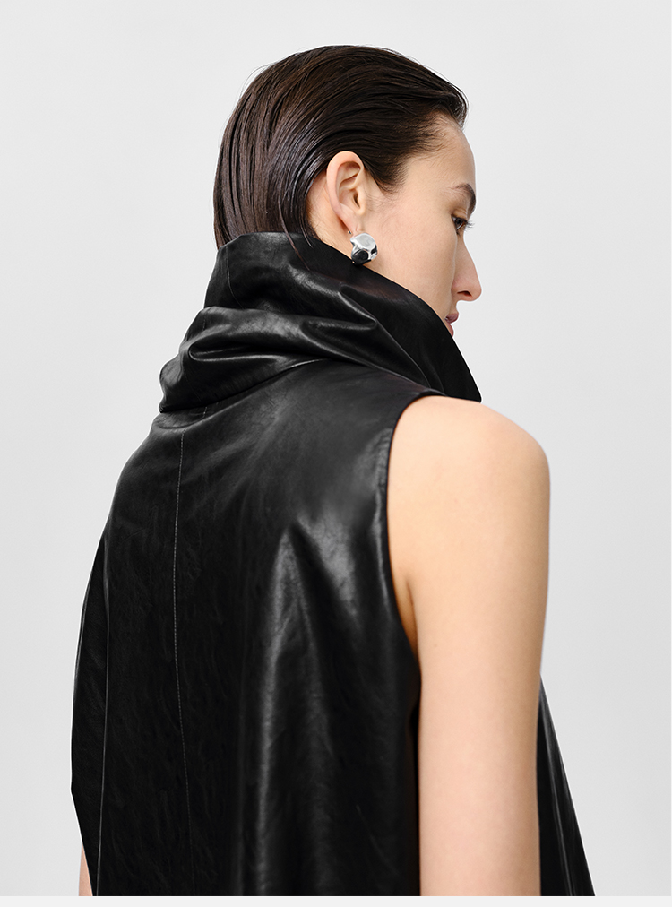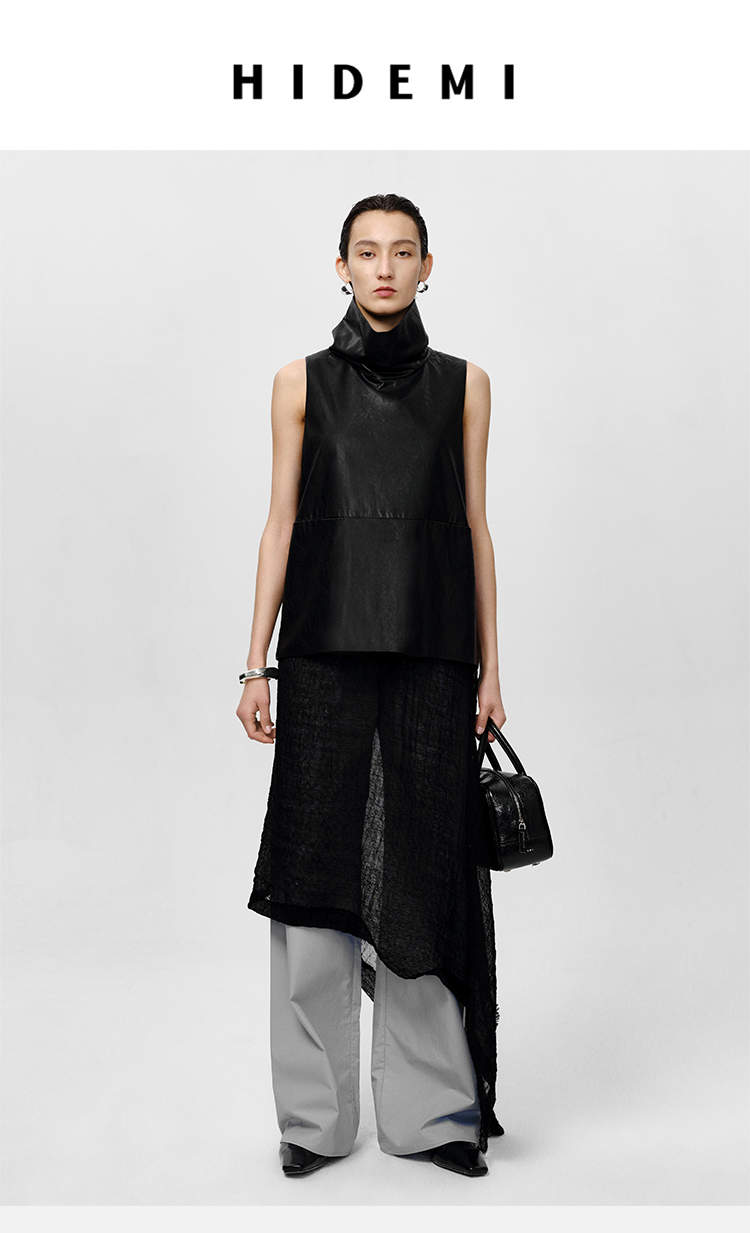 HIDEMI 极简翻领立领廓形口袋环保皮马夹外套皮衣