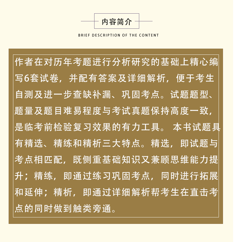 作者在对历年考题进行分析研究的基础上精心编写6套试卷,并配有答案及详细解析,便于考生自测及进一步查缺补漏、巩固考点。试题题型、题量及题目难易程度与考试真题保持高度一致,是临考前检验复习效果的有力工具。 本书试题具有精选、精练和精析三大特点。精选,即试题与考点相匹配,既侧重基础知识又兼顾思维能力提升;精练,即通过练习巩固考点,同时进行拓展和延伸;精析,即通过详细解析帮考生在直击考点的同时做到触类旁通。