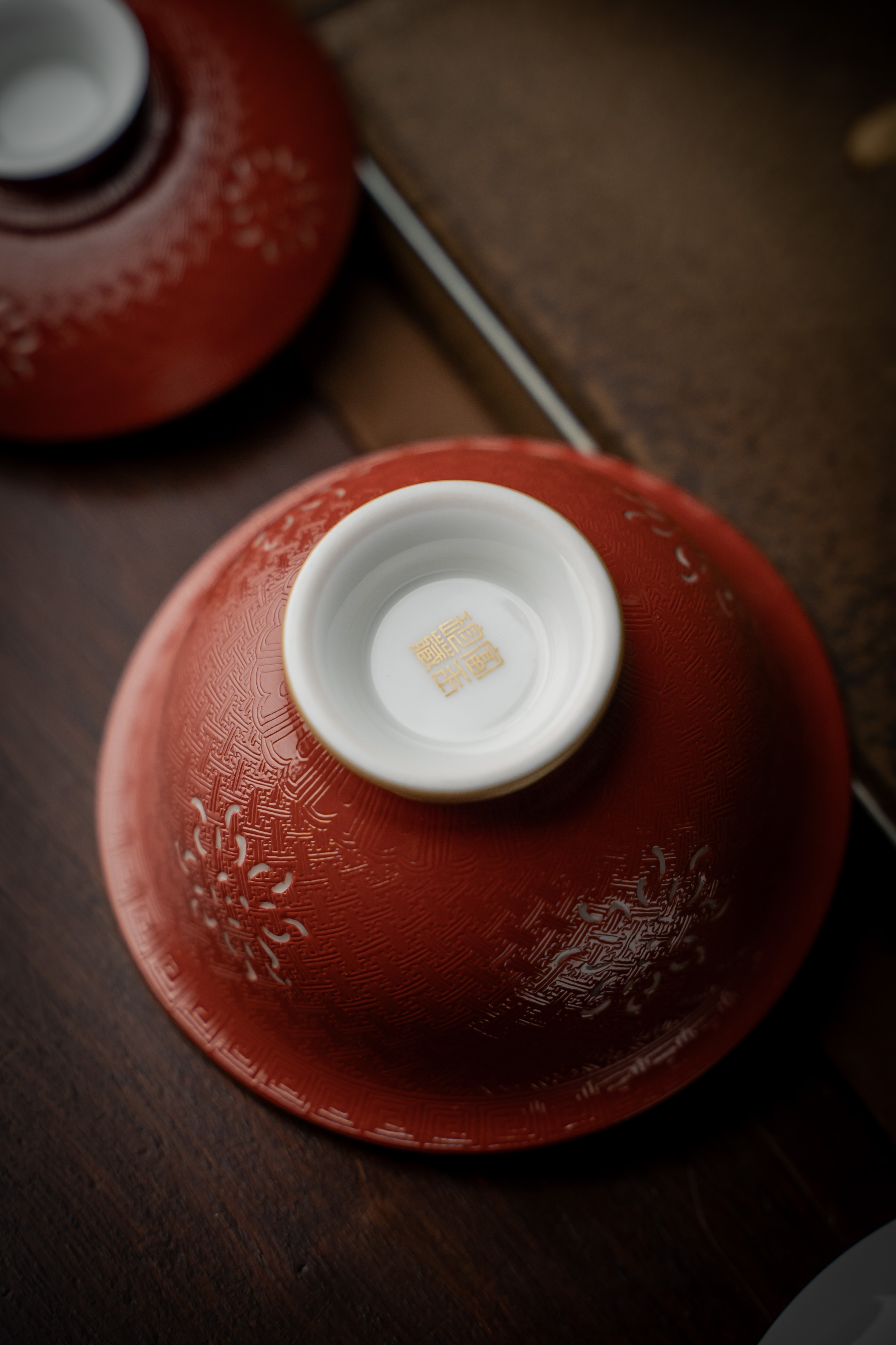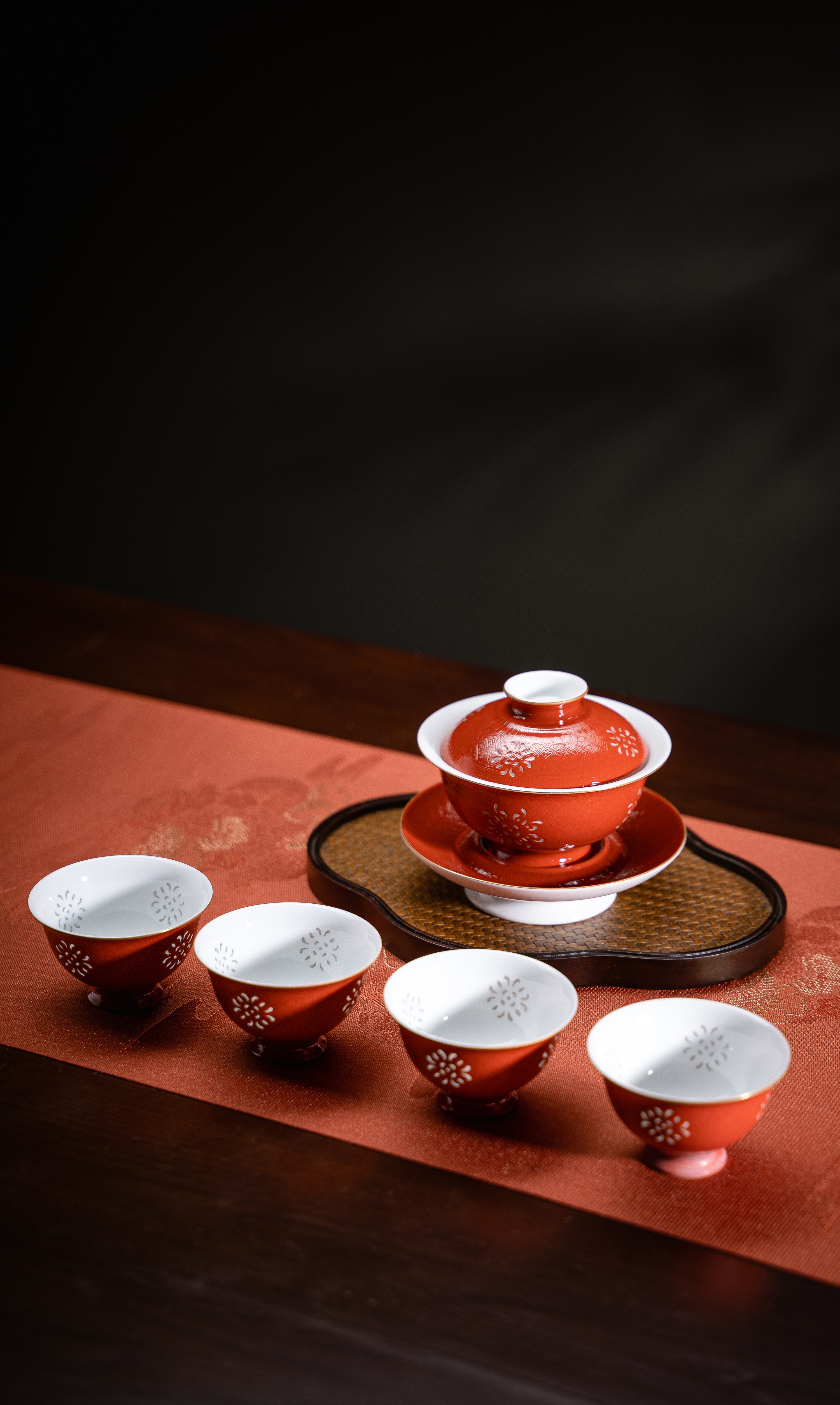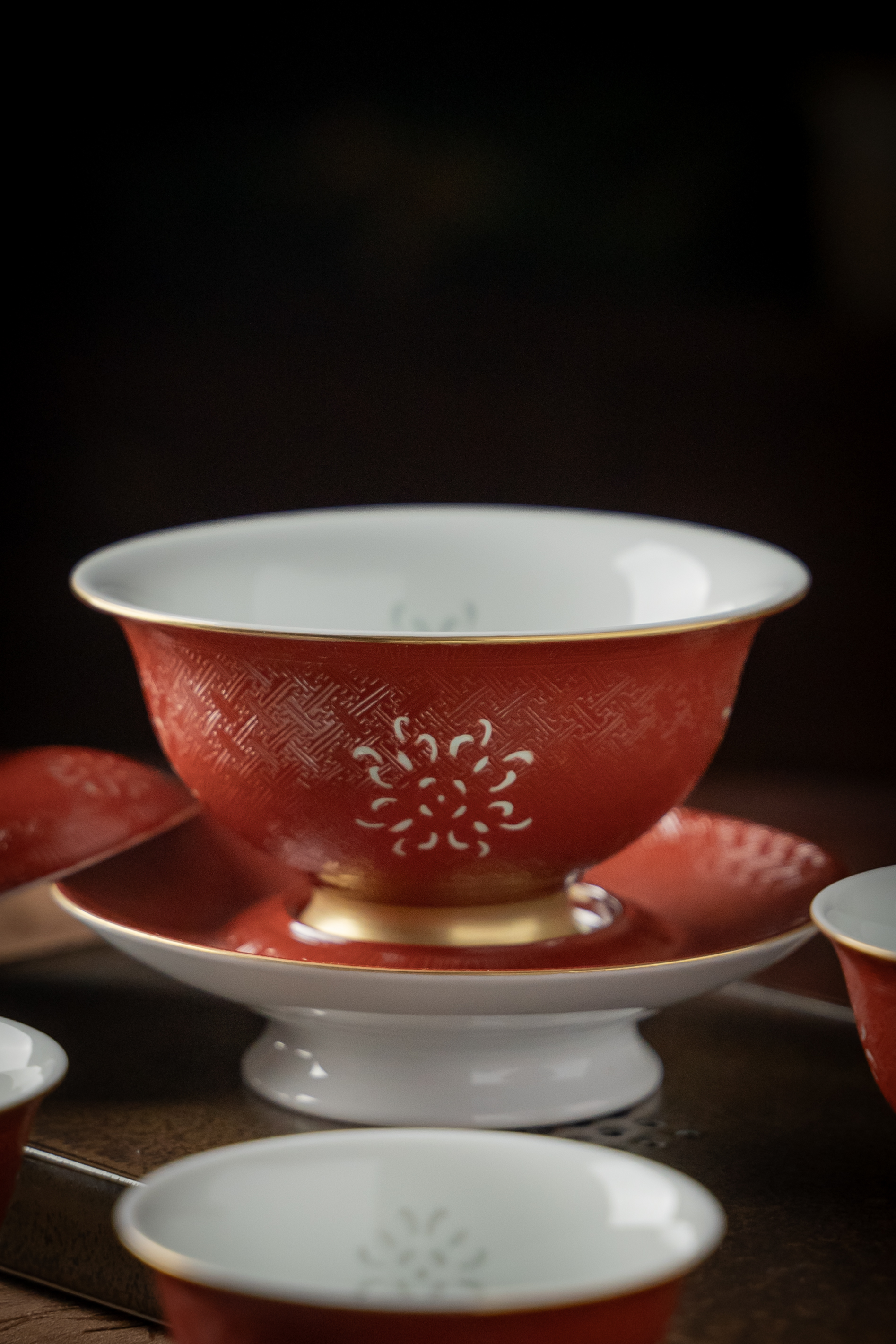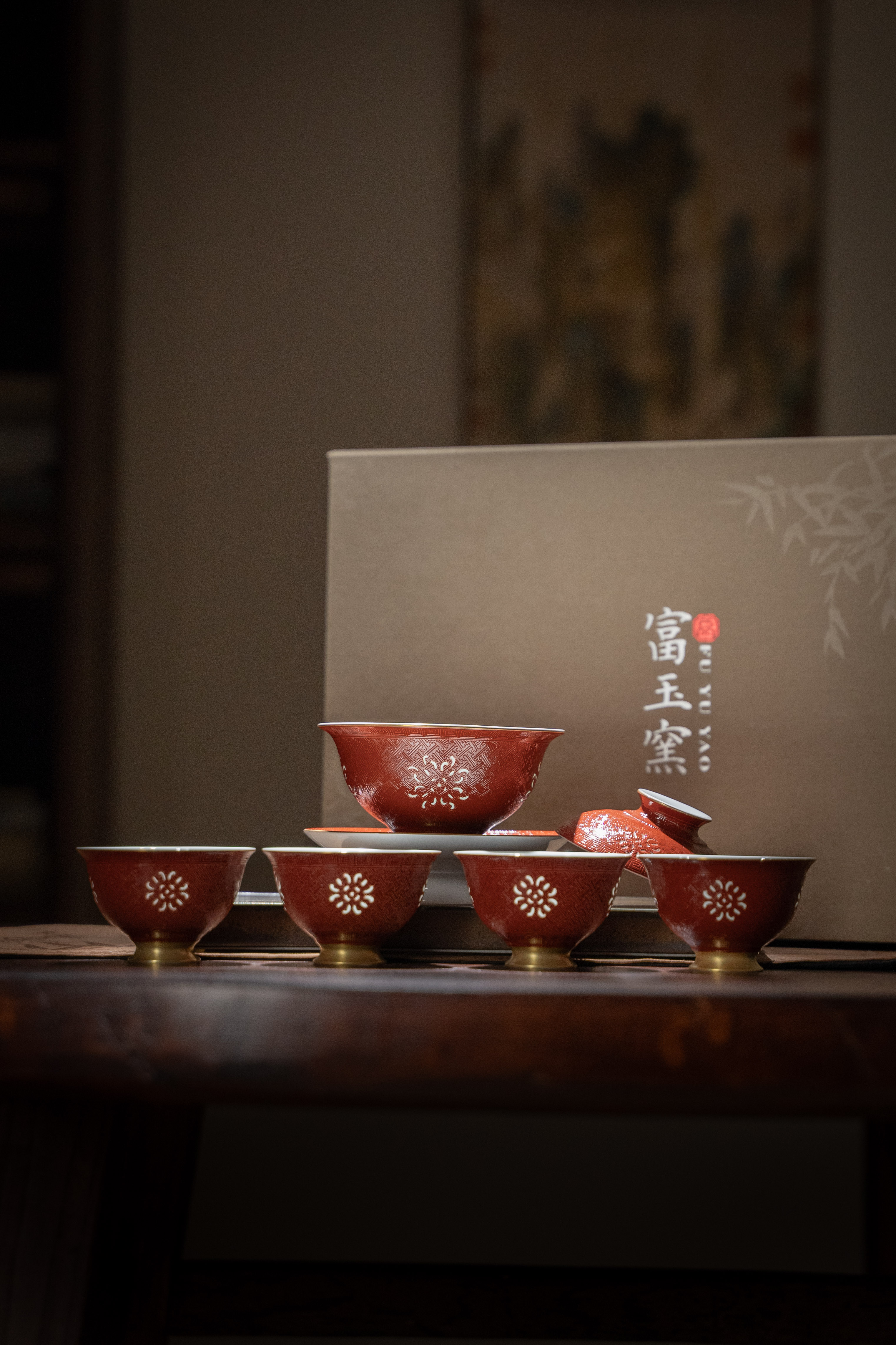 富玉窑 景德镇手工扒花宫红盖碗5头茶具
